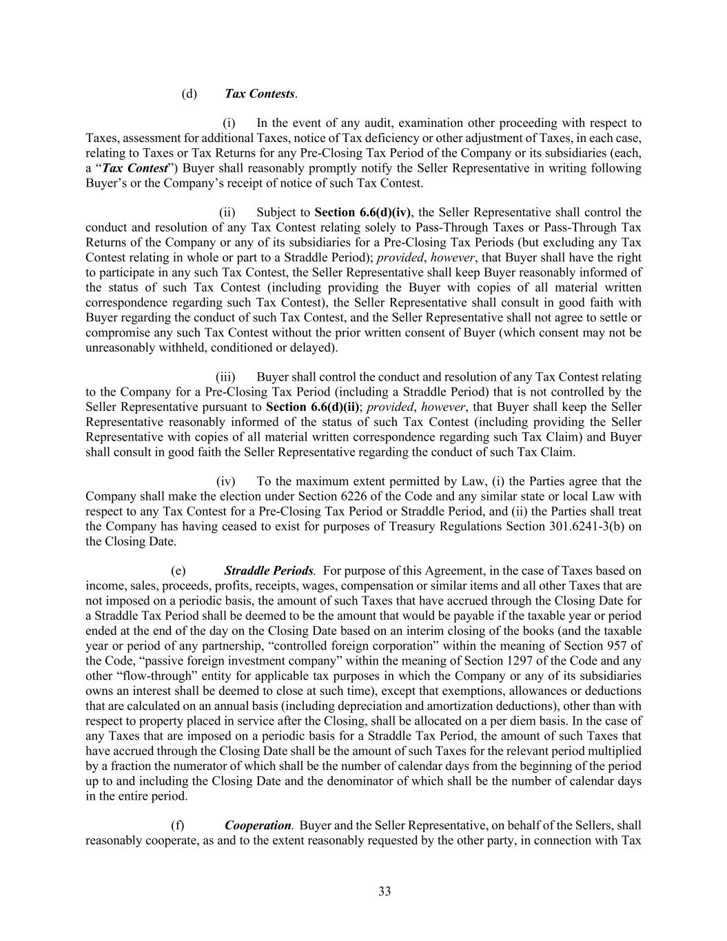 33 (d) Tax Contests. (i) In the event of any audit, examination other proceeding with respect to Taxes, assessment for additional Taxes, notice of Tax deficiency or other adjustment of Taxes, in each case, relating to Taxes or Tax Returns for any Pre-Closing Tax Period of the Company or its subsidiaries (each, a “Tax Contest”) Buyer shall reasonably promptly notify the Seller Representative in writing following Buyer’s or the Company’s receipt of notice of such Tax Contest. (ii) Subject to Section 6.6(d)(iv), the Seller Representative shall control the conduct and resolution of any Tax Contest relating solely to Pass-Through Taxes or Pass-Through Tax Returns of the Company or any of its subsidiaries for a Pre-Closing Tax Periods (but excluding any Tax Contest relating in whole or part to a Straddle Period); provided, however, that Buyer shall have the right to participate in any such Tax Contest, the Seller Representative shall keep Buyer reasonably informed of the status of such Tax Contest (including providing the Buyer with copies of all material written correspondence regarding such Tax Contest), the Seller Representative shall consult in good faith with Buyer regarding the conduct of such Tax Contest, and the Seller Representative shall not agree to settle or compromise any such Tax Contest without the prior written consent of Buyer (which consent may not be unreasonably withheld, conditioned or delayed). (iii) Buyer shall control the conduct and resolution of any Tax Contest relating to the Company for a Pre-Closing Tax Period (including a Straddle Period) that is not controlled by the Seller Representative pursuant to Section 6.6(d)(ii); provided, however, that Buyer shall keep the Seller Representative reasonably informed of the status of such Tax Contest (including providing the Seller Representative with copies of all material written correspondence regarding such Tax Claim) and Buyer shall consult in good faith the Seller Representative regarding the conduct of such Tax Claim. (iv) To the maximum extent permitted by Law, (i) the Parties agree that the Company shall make the election under Section 6226 of the Code and any similar state or local Law with respect to any Tax Contest for a Pre-Closing Tax Period or Straddle Period, and (ii) the Parties shall treat the Company has having ceased to exist for purposes of Treasury Regulations Section 301.6241-3(b) on the Closing Date. (e) Straddle Periods. For purpose of this Agreement, in the case of Taxes based on income, sales, proceeds, profits, receipts, wages, compensation or similar items and all other Taxes that are not imposed on a periodic basis, the amount of such Taxes that have accrued through the Closing Date for a Straddle Tax Period shall be deemed to be the amount that would be payable if the taxable year or period ended at the end of the day on the Closing Date based on an interim closing of the books (and the taxable year or period of any partnership, “controlled foreign corporation” within the meaning of Section 957 of the Code, “passive foreign investment company” within the meaning of Section 1297 of the Code and any other “flow-through” entity for applicable tax purposes in which the Company or any of its subsidiaries owns an interest shall be deemed to close at such time), except that exemptions, allowances or deductions that are calculated on an annual basis (including depreciation and amortization deductions), other than with respect to property placed in service after the Closing, shall be allocated on a per diem basis. In the case of any Taxes that are imposed on a periodic basis for a Straddle Tax Period, the amount of such Taxes that have accrued through the Closing Date shall be the amount of such Taxes for the relevant period multiplied by a fraction the numerator of which shall be the number of calendar days from the beginning of the period up to and including the Closing Date and the denominator of which shall be the number of calendar days in the entire period. (f) Cooperation. Buyer and the Seller Representative, on behalf of the Sellers, shall reasonably cooperate, as and to the extent reasonably requested by the other party, in connection with Tax
