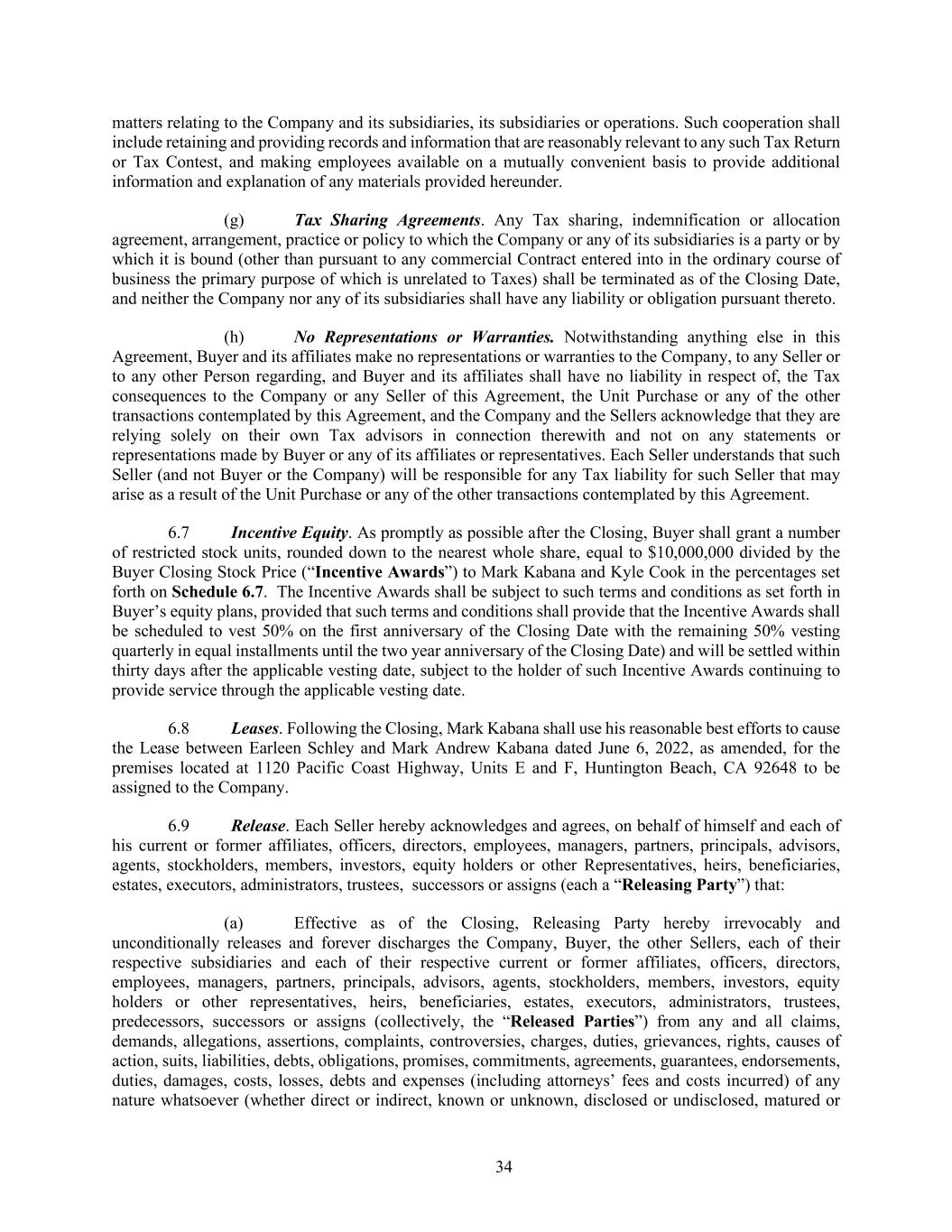 34 matters relating to the Company and its subsidiaries, its subsidiaries or operations. Such cooperation shall include retaining and providing records and information that are reasonably relevant to any such Tax Return or Tax Contest, and making employees available on a mutually convenient basis to provide additional information and explanation of any materials provided hereunder. (g) Tax Sharing Agreements. Any Tax sharing, indemnification or allocation agreement, arrangement, practice or policy to which the Company or any of its subsidiaries is a party or by which it is bound (other than pursuant to any commercial Contract entered into in the ordinary course of business the primary purpose of which is unrelated to Taxes) shall be terminated as of the Closing Date, and neither the Company nor any of its subsidiaries shall have any liability or obligation pursuant thereto. (h) No Representations or Warranties. Notwithstanding anything else in this Agreement, Buyer and its affiliates make no representations or warranties to the Company, to any Seller or to any other Person regarding, and Buyer and its affiliates shall have no liability in respect of, the Tax consequences to the Company or any Seller of this Agreement, the Unit Purchase or any of the other transactions contemplated by this Agreement, and the Company and the Sellers acknowledge that they are relying solely on their own Tax advisors in connection therewith and not on any statements or representations made by Buyer or any of its affiliates or representatives. Each Seller understands that such Seller (and not Buyer or the Company) will be responsible for any Tax liability for such Seller that may arise as a result of the Unit Purchase or any of the other transactions contemplated by this Agreement. 6.7 Incentive Equity. As promptly as possible after the Closing, Buyer shall grant a number of restricted stock units, rounded down to the nearest whole share, equal to $10,000,000 divided by the Buyer Closing Stock Price (“Incentive Awards”) to Mark Kabana and Kyle Cook in the percentages set forth on Schedule 6.7. The Incentive Awards shall be subject to such terms and conditions as set forth in Buyer’s equity plans, provided that such terms and conditions shall provide that the Incentive Awards shall be scheduled to vest 50% on the first anniversary of the Closing Date with the remaining 50% vesting quarterly in equal installments until the two year anniversary of the Closing Date) and will be settled within thirty days after the applicable vesting date, subject to the holder of such Incentive Awards continuing to provide service through the applicable vesting date. 6.8 Leases. Following the Closing, Mark Kabana shall use his reasonable best efforts to cause the Lease between Earleen Schley and Mark Andrew Kabana dated June 6, 2022, as amended, for the premises located at 1120 Pacific Coast Highway, Units E and F, Huntington Beach, CA 92648 to be assigned to the Company. 6.9 Release. Each Seller hereby acknowledges and agrees, on behalf of himself and each of his current or former affiliates, officers, directors, employees, managers, partners, principals, advisors, agents, stockholders, members, investors, equity holders or other Representatives, heirs, beneficiaries, estates, executors, administrators, trustees, successors or assigns (each a “Releasing Party”) that: (a) Effective as of the Closing, Releasing Party hereby irrevocably and unconditionally releases and forever discharges the Company, Buyer, the other Sellers, each of their respective subsidiaries and each of their respective current or former affiliates, officers, directors, employees, managers, partners, principals, advisors, agents, stockholders, members, investors, equity holders or other representatives, heirs, beneficiaries, estates, executors, administrators, trustees, predecessors, successors or assigns (collectively, the “Released Parties”) from any and all claims, demands, allegations, assertions, complaints, controversies, charges, duties, grievances, rights, causes of action, suits, liabilities, debts, obligations, promises, commitments, agreements, guarantees, endorsements, duties, damages, costs, losses, debts and expenses (including attorneys’ fees and costs incurred) of any nature whatsoever (whether direct or indirect, known or unknown, disclosed or undisclosed, matured or