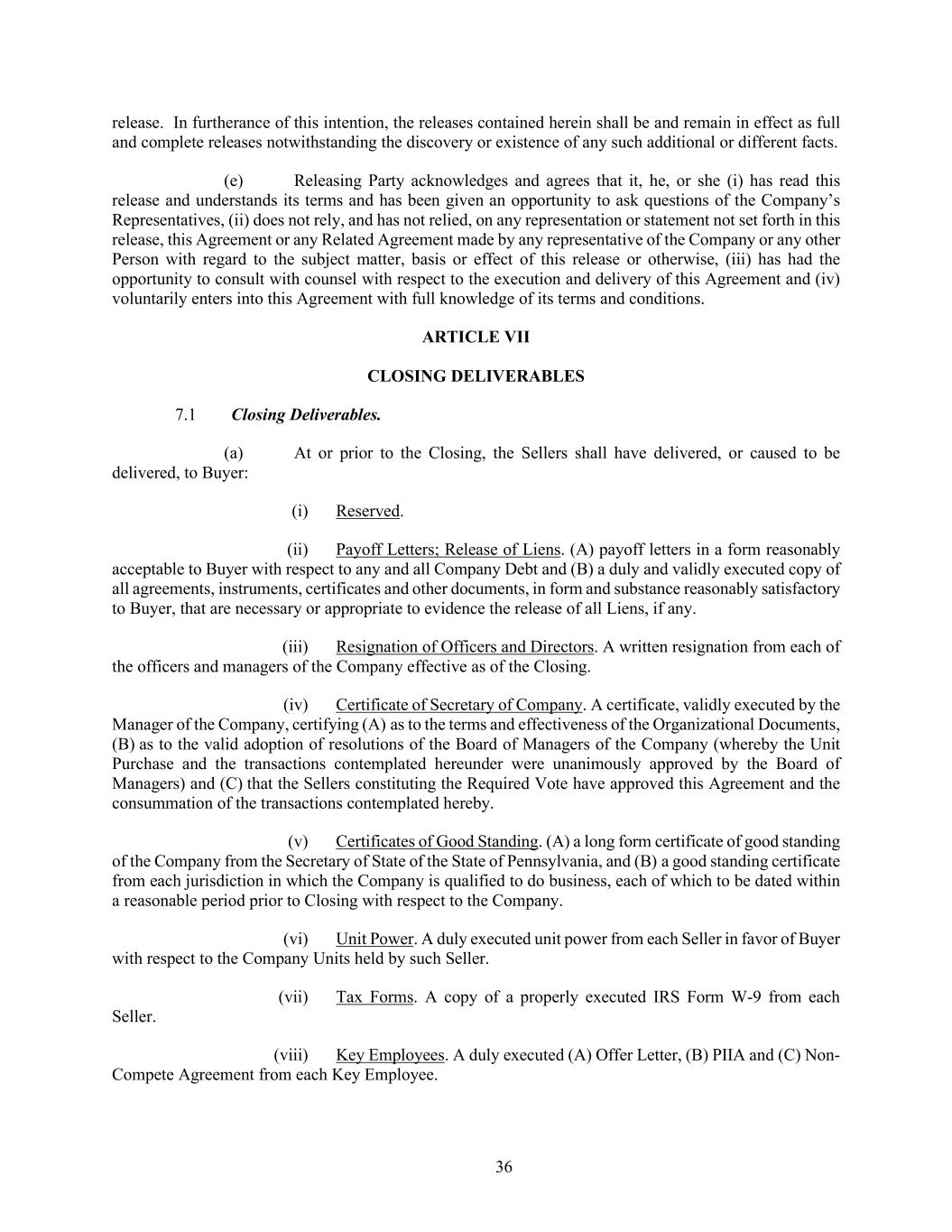 36 release. In furtherance of this intention, the releases contained herein shall be and remain in effect as full and complete releases notwithstanding the discovery or existence of any such additional or different facts. (e) Releasing Party acknowledges and agrees that it, he, or she (i) has read this release and understands its terms and has been given an opportunity to ask questions of the Company’s Representatives, (ii) does not rely, and has not relied, on any representation or statement not set forth in this release, this Agreement or any Related Agreement made by any representative of the Company or any other Person with regard to the subject matter, basis or effect of this release or otherwise, (iii) has had the opportunity to consult with counsel with respect to the execution and delivery of this Agreement and (iv) voluntarily enters into this Agreement with full knowledge of its terms and conditions. ARTICLE VII CLOSING DELIVERABLES 7.1 Closing Deliverables. (a) At or prior to the Closing, the Sellers shall have delivered, or caused to be delivered, to Buyer: (i) Reserved. (ii) Payoff Letters; Release of Liens. (A) payoff letters in a form reasonably acceptable to Buyer with respect to any and all Company Debt and (B) a duly and validly executed copy of all agreements, instruments, certificates and other documents, in form and substance reasonably satisfactory to Buyer, that are necessary or appropriate to evidence the release of all Liens, if any. (iii) Resignation of Officers and Directors. A written resignation from each of the officers and managers of the Company effective as of the Closing. (iv) Certificate of Secretary of Company. A certificate, validly executed by the Manager of the Company, certifying (A) as to the terms and effectiveness of the Organizational Documents, (B) as to the valid adoption of resolutions of the Board of Managers of the Company (whereby the Unit Purchase and the transactions contemplated hereunder were unanimously approved by the Board of Managers) and (C) that the Sellers constituting the Required Vote have approved this Agreement and the consummation of the transactions contemplated hereby. (v) Certificates of Good Standing. (A) a long form certificate of good standing of the Company from the Secretary of State of the State of Pennsylvania, and (B) a good standing certificate from each jurisdiction in which the Company is qualified to do business, each of which to be dated within a reasonable period prior to Closing with respect to the Company. (vi) Unit Power. A duly executed unit power from each Seller in favor of Buyer with respect to the Company Units held by such Seller. (vii) Tax Forms. A copy of a properly executed IRS Form W-9 from each Seller. (viii) Key Employees. A duly executed (A) Offer Letter, (B) PIIA and (C) Non- Compete Agreement from each Key Employee.