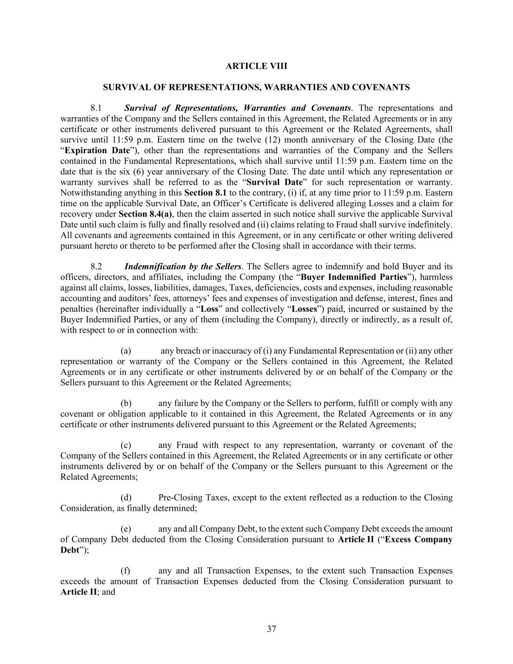 37 ARTICLE VIII SURVIVAL OF REPRESENTATIONS, WARRANTIES AND COVENANTS 8.1 Survival of Representations, Warranties and Covenants. The representations and warranties of the Company and the Sellers contained in this Agreement, the Related Agreements or in any certificate or other instruments delivered pursuant to this Agreement or the Related Agreements, shall survive until 11:59 p.m. Eastern time on the twelve (12) month anniversary of the Closing Date (the “Expiration Date”), other than the representations and warranties of the Company and the Sellers contained in the Fundamental Representations, which shall survive until 11:59 p.m. Eastern time on the date that is the six (6) year anniversary of the Closing Date. The date until which any representation or warranty survives shall be referred to as the “Survival Date” for such representation or warranty. Notwithstanding anything in this Section 8.1 to the contrary, (i) if, at any time prior to 11:59 p.m. Eastern time on the applicable Survival Date, an Officer’s Certificate is delivered alleging Losses and a claim for recovery under Section 8.4(a), then the claim asserted in such notice shall survive the applicable Survival Date until such claim is fully and finally resolved and (ii) claims relating to Fraud shall survive indefinitely. All covenants and agreements contained in this Agreement, or in any certificate or other writing delivered pursuant hereto or thereto to be performed after the Closing shall in accordance with their terms. 8.2 Indemnification by the Sellers. The Sellers agree to indemnify and hold Buyer and its officers, directors, and affiliates, including the Company (the “Buyer Indemnified Parties”), harmless against all claims, losses, liabilities, damages, Taxes, deficiencies, costs and expenses, including reasonable accounting and auditors’ fees, attorneys’ fees and expenses of investigation and defense, interest, fines and penalties (hereinafter individually a “Loss” and collectively “Losses”) paid, incurred or sustained by the Buyer Indemnified Parties, or any of them (including the Company), directly or indirectly, as a result of, with respect to or in connection with: (a) any breach or inaccuracy of (i) any Fundamental Representation or (ii) any other representation or warranty of the Company or the Sellers contained in this Agreement, the Related Agreements or in any certificate or other instruments delivered by or on behalf of the Company or the Sellers pursuant to this Agreement or the Related Agreements; (b) any failure by the Company or the Sellers to perform, fulfill or comply with any covenant or obligation applicable to it contained in this Agreement, the Related Agreements or in any certificate or other instruments delivered pursuant to this Agreement or the Related Agreements; (c) any Fraud with respect to any representation, warranty or covenant of the Company of the Sellers contained in this Agreement, the Related Agreements or in any certificate or other instruments delivered by or on behalf of the Company or the Sellers pursuant to this Agreement or the Related Agreements; (d) Pre-Closing Taxes, except to the extent reflected as a reduction to the Closing Consideration, as finally determined; (e) any and all Company Debt, to the extent such Company Debt exceeds the amount of Company Debt deducted from the Closing Consideration pursuant to Article II (“Excess Company Debt”); (f) any and all Transaction Expenses, to the extent such Transaction Expenses exceeds the amount of Transaction Expenses deducted from the Closing Consideration pursuant to Article II; and