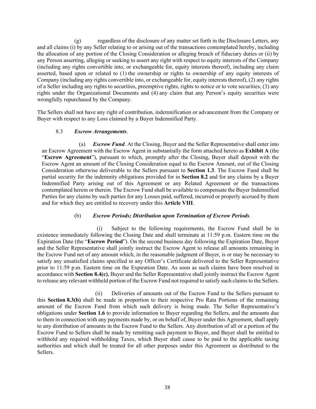 38 (g) regardless of the disclosure of any matter set forth in the Disclosure Letters, any and all claims (i) by any Seller relating to or arising out of the transactions contemplated hereby, including the allocation of any portion of the Closing Consideration or alleging breach of fiduciary duties or (ii) by any Person asserting, alleging or seeking to assert any right with respect to equity interests of the Company (including any rights convertible into, or exchangeable for, equity interests thereof), including any claim asserted, based upon or related to (1) the ownership or rights to ownership of any equity interests of Company (including any rights convertible into, or exchangeable for, equity interests thereof), (2) any rights of a Seller including any rights to securities, preemptive rights, rights to notice or to vote securities, (3) any rights under the Organizational Documents and (4) any claim that any Person’s equity securities were wrongfully repurchased by the Company. The Sellers shall not have any right of contribution, indemnification or advancement from the Company or Buyer with respect to any Loss claimed by a Buyer Indemnified Party. 8.3 Escrow Arrangements. (a) Escrow Fund. At the Closing, Buyer and the Seller Representative shall enter into an Escrow Agreement with the Escrow Agent in substantially the form attached hereto as Exhibit A (the “Escrow Agreement”), pursuant to which, promptly after the Closing, Buyer shall deposit with the Escrow Agent an amount of the Closing Consideration equal to the Escrow Amount, out of the Closing Consideration otherwise deliverable to the Sellers pursuant to Section 1.3. The Escrow Fund shall be partial security for the indemnity obligations provided for in Section 8.2 and for any claims by a Buyer Indemnified Party arising out of this Agreement or any Related Agreement or the transactions contemplated herein or therein. The Escrow Fund shall be available to compensate the Buyer Indemnified Parties for any claims by such parties for any Losses paid, suffered, incurred or properly accrued by them and for which they are entitled to recovery under this Article VIII. (b) Escrow Periods; Distribution upon Termination of Escrow Periods. (i) Subject to the following requirements, the Escrow Fund shall be in existence immediately following the Closing Date and shall terminate at 11:59 p.m. Eastern time on the Expiration Date (the “Escrow Period”). On the second business day following the Expiration Date, Buyer and the Seller Representative shall jointly instruct the Escrow Agent to release all amounts remaining in the Escrow Fund net of any amount which, in the reasonable judgment of Buyer, is or may be necessary to satisfy any unsatisfied claims specified in any Officer’s Certificate delivered to the Seller Representative prior to 11:59 p.m. Eastern time on the Expiration Date. As soon as such claims have been resolved in accordance with Section 8.4(c), Buyer and the Seller Representative shall jointly instruct the Escrow Agent to release any relevant withheld portion of the Escrow Fund not required to satisfy such claims to the Sellers. (ii) Deliveries of amounts out of the Escrow Fund to the Sellers pursuant to this Section 8.3(b) shall be made in proportion to their respective Pro Rata Portions of the remaining amount of the Escrow Fund from which such delivery is being made. The Seller Representative’s obligations under Section 1.6 to provide information to Buyer regarding the Sellers, and the amounts due to them in connection with any payments made by, or on behalf of, Buyer under this Agreement, shall apply to any distribution of amounts in the Escrow Fund to the Sellers. Any distribution of all or a portion of the Escrow Fund to Sellers shall be made by remitting such payment to Buyer, and Buyer shall be entitled to withhold any required withholding Taxes, which Buyer shall cause to be paid to the applicable taxing authorities and which shall be treated for all other purposes under this Agreement as distributed to the Sellers.