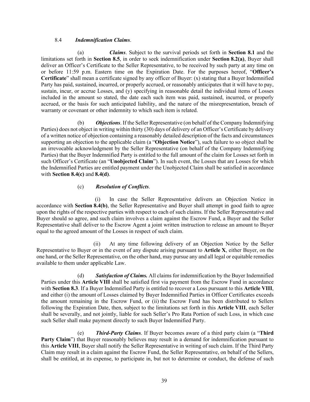 39 8.4 Indemnification Claims. (a) Claims. Subject to the survival periods set forth in Section 8.1 and the limitations set forth in Section 8.5, in order to seek indemnification under Section 8.2(a), Buyer shall deliver an Officer’s Certificate to the Seller Representative, to be received by such party at any time on or before 11:59 p.m. Eastern time on the Expiration Date. For the purposes hereof, “Officer’s Certificate” shall mean a certificate signed by any officer of Buyer: (x) stating that a Buyer Indemnified Party has paid, sustained, incurred, or properly accrued, or reasonably anticipates that it will have to pay, sustain, incur, or accrue Losses, and (y) specifying in reasonable detail the individual items of Losses included in the amount so stated, the date each such item was paid, sustained, incurred, or properly accrued, or the basis for such anticipated liability, and the nature of the misrepresentation, breach of warranty or covenant or other indemnity to which such item is related. (b) Objections. If the Seller Representative (on behalf of the Company Indemnifying Parties) does not object in writing within thirty (30) days of delivery of an Officer’s Certificate by delivery of a written notice of objection containing a reasonably detailed description of the facts and circumstances supporting an objection to the applicable claim (a “Objection Notice”), such failure to so object shall be an irrevocable acknowledgment by the Seller Representative (on behalf of the Company Indemnifying Parties) that the Buyer Indemnified Party is entitled to the full amount of the claim for Losses set forth in such Officer’s Certificate (an “Unobjected Claim”). In such event, the Losses that are Losses for which the Indemnified Parties are entitled payment under the Unobjected Claim shall be satisfied in accordance with Section 8.4(c) and 8.4(d). (c) Resolution of Conflicts. (i) In case the Seller Representative delivers an Objection Notice in accordance with Section 8.4(b), the Seller Representative and Buyer shall attempt in good faith to agree upon the rights of the respective parties with respect to each of such claims. If the Seller Representative and Buyer should so agree, and such claim involves a claim against the Escrow Fund, a Buyer and the Seller Representative shall deliver to the Escrow Agent a joint written instruction to release an amount to Buyer equal to the agreed amount of the Losses in respect of such claim. (ii) At any time following delivery of an Objection Notice by the Seller Representative to Buyer or in the event of any dispute arising pursuant to Article X, either Buyer, on the one hand, or the Seller Representative, on the other hand, may pursue any and all legal or equitable remedies available to them under applicable Law. (d) Satisfaction of Claims. All claims for indemnification by the Buyer Indemnified Parties under this Article VIII shall be satisfied first via payment from the Escrow Fund in accordance with Section 8.3. If a Buyer Indemnified Party is entitled to recover a Loss pursuant to this Article VIII, and either (i) the amount of Losses claimed by Buyer Indemnified Parties in Officer Certificates exceeds the amount remaining in the Escrow Fund, or (ii) the Escrow Fund has been distributed to Sellers following the Expiration Date, then, subject to the limitations set forth in this Article VIII, each Seller shall be severally, and not jointly, liable for such Seller’s Pro Rata Portion of such Loss, in which case such Seller shall make payment directly to such Buyer Indemnified Party. (e) Third-Party Claims. If Buyer becomes aware of a third party claim (a “Third Party Claim”) that Buyer reasonably believes may result in a demand for indemnification pursuant to this Article VIII, Buyer shall notify the Seller Representative in writing of such claim. If the Third Party Claim may result in a claim against the Escrow Fund, the Seller Representative, on behalf of the Sellers, shall be entitled, at its expense, to participate in, but not to determine or conduct, the defense of such