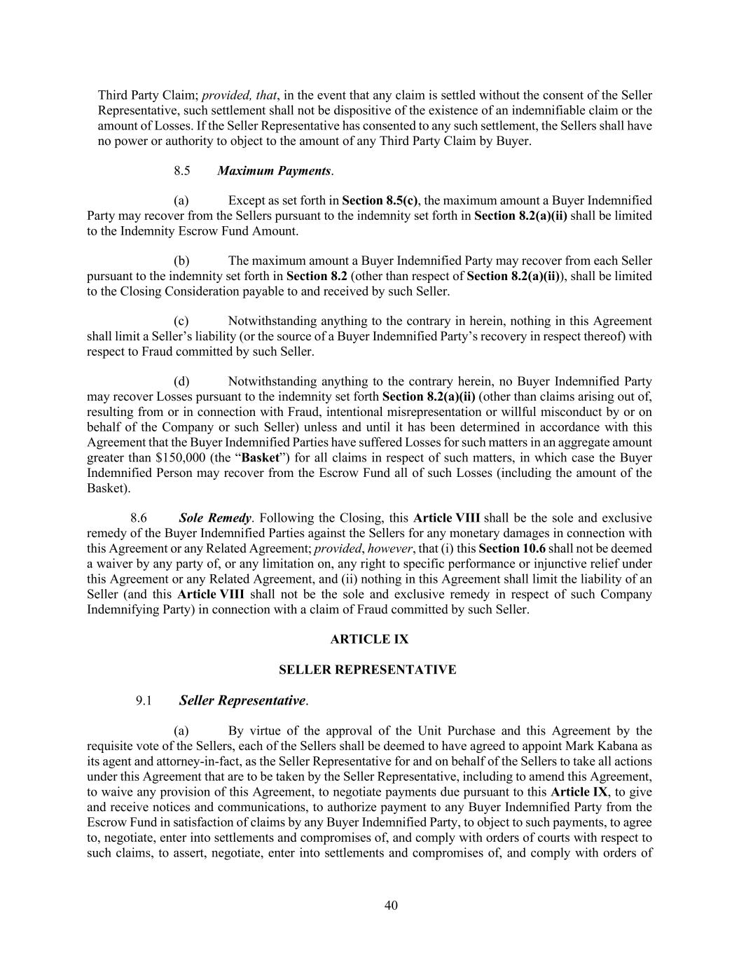 40 Third Party Claim; provided, that, in the event that any claim is settled without the consent of the Seller Representative, such settlement shall not be dispositive of the existence of an indemnifiable claim or the amount of Losses. If the Seller Representative has consented to any such settlement, the Sellers shall have no power or authority to object to the amount of any Third Party Claim by Buyer. 8.5 Maximum Payments. (a) Except as set forth in Section 8.5(c), the maximum amount a Buyer Indemnified Party may recover from the Sellers pursuant to the indemnity set forth in Section 8.2(a)(ii) shall be limited to the Indemnity Escrow Fund Amount. (b) The maximum amount a Buyer Indemnified Party may recover from each Seller pursuant to the indemnity set forth in Section 8.2 (other than respect of Section 8.2(a)(ii)), shall be limited to the Closing Consideration payable to and received by such Seller. (c) Notwithstanding anything to the contrary in herein, nothing in this Agreement shall limit a Seller’s liability (or the source of a Buyer Indemnified Party’s recovery in respect thereof) with respect to Fraud committed by such Seller. (d) Notwithstanding anything to the contrary herein, no Buyer Indemnified Party may recover Losses pursuant to the indemnity set forth Section 8.2(a)(ii) (other than claims arising out of, resulting from or in connection with Fraud, intentional misrepresentation or willful misconduct by or on behalf of the Company or such Seller) unless and until it has been determined in accordance with this Agreement that the Buyer Indemnified Parties have suffered Losses for such matters in an aggregate amount greater than $150,000 (the “Basket”) for all claims in respect of such matters, in which case the Buyer Indemnified Person may recover from the Escrow Fund all of such Losses (including the amount of the Basket). 8.6 Sole Remedy. Following the Closing, this Article VIII shall be the sole and exclusive remedy of the Buyer Indemnified Parties against the Sellers for any monetary damages in connection with this Agreement or any Related Agreement; provided, however, that (i) this Section 10.6 shall not be deemed a waiver by any party of, or any limitation on, any right to specific performance or injunctive relief under this Agreement or any Related Agreement, and (ii) nothing in this Agreement shall limit the liability of an Seller (and this Article VIII shall not be the sole and exclusive remedy in respect of such Company Indemnifying Party) in connection with a claim of Fraud committed by such Seller. ARTICLE IX SELLER REPRESENTATIVE 9.1 Seller Representative. (a) By virtue of the approval of the Unit Purchase and this Agreement by the requisite vote of the Sellers, each of the Sellers shall be deemed to have agreed to appoint Mark Kabana as its agent and attorney-in-fact, as the Seller Representative for and on behalf of the Sellers to take all actions under this Agreement that are to be taken by the Seller Representative, including to amend this Agreement, to waive any provision of this Agreement, to negotiate payments due pursuant to this Article IX, to give and receive notices and communications, to authorize payment to any Buyer Indemnified Party from the Escrow Fund in satisfaction of claims by any Buyer Indemnified Party, to object to such payments, to agree to, negotiate, enter into settlements and compromises of, and comply with orders of courts with respect to such claims, to assert, negotiate, enter into settlements and compromises of, and comply with orders of