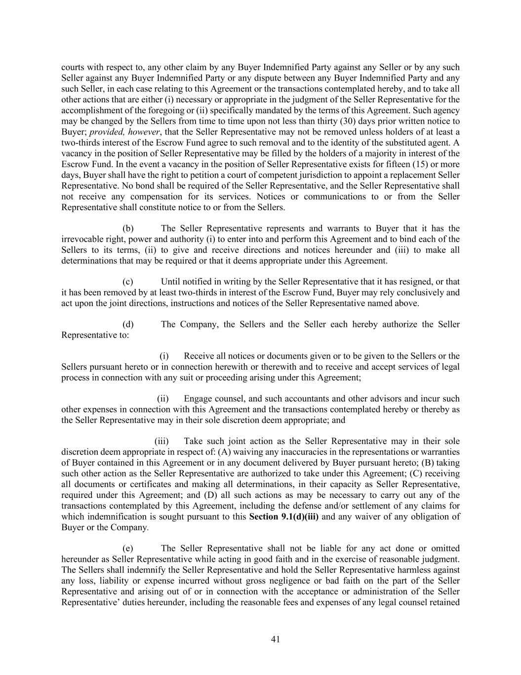 41 courts with respect to, any other claim by any Buyer Indemnified Party against any Seller or by any such Seller against any Buyer Indemnified Party or any dispute between any Buyer Indemnified Party and any such Seller, in each case relating to this Agreement or the transactions contemplated hereby, and to take all other actions that are either (i) necessary or appropriate in the judgment of the Seller Representative for the accomplishment of the foregoing or (ii) specifically mandated by the terms of this Agreement. Such agency may be changed by the Sellers from time to time upon not less than thirty (30) days prior written notice to Buyer; provided, however, that the Seller Representative may not be removed unless holders of at least a two-thirds interest of the Escrow Fund agree to such removal and to the identity of the substituted agent. A vacancy in the position of Seller Representative may be filled by the holders of a majority in interest of the Escrow Fund. In the event a vacancy in the position of Seller Representative exists for fifteen (15) or more days, Buyer shall have the right to petition a court of competent jurisdiction to appoint a replacement Seller Representative. No bond shall be required of the Seller Representative, and the Seller Representative shall not receive any compensation for its services. Notices or communications to or from the Seller Representative shall constitute notice to or from the Sellers. (b) The Seller Representative represents and warrants to Buyer that it has the irrevocable right, power and authority (i) to enter into and perform this Agreement and to bind each of the Sellers to its terms, (ii) to give and receive directions and notices hereunder and (iii) to make all determinations that may be required or that it deems appropriate under this Agreement. (c) Until notified in writing by the Seller Representative that it has resigned, or that it has been removed by at least two-thirds in interest of the Escrow Fund, Buyer may rely conclusively and act upon the joint directions, instructions and notices of the Seller Representative named above. (d) The Company, the Sellers and the Seller each hereby authorize the Seller Representative to: (i) Receive all notices or documents given or to be given to the Sellers or the Sellers pursuant hereto or in connection herewith or therewith and to receive and accept services of legal process in connection with any suit or proceeding arising under this Agreement; (ii) Engage counsel, and such accountants and other advisors and incur such other expenses in connection with this Agreement and the transactions contemplated hereby or thereby as the Seller Representative may in their sole discretion deem appropriate; and (iii) Take such joint action as the Seller Representative may in their sole discretion deem appropriate in respect of: (A) waiving any inaccuracies in the representations or warranties of Buyer contained in this Agreement or in any document delivered by Buyer pursuant hereto; (B) taking such other action as the Seller Representative are authorized to take under this Agreement; (C) receiving all documents or certificates and making all determinations, in their capacity as Seller Representative, required under this Agreement; and (D) all such actions as may be necessary to carry out any of the transactions contemplated by this Agreement, including the defense and/or settlement of any claims for which indemnification is sought pursuant to this Section 9.1(d)(iii) and any waiver of any obligation of Buyer or the Company. (e) The Seller Representative shall not be liable for any act done or omitted hereunder as Seller Representative while acting in good faith and in the exercise of reasonable judgment. The Sellers shall indemnify the Seller Representative and hold the Seller Representative harmless against any loss, liability or expense incurred without gross negligence or bad faith on the part of the Seller Representative and arising out of or in connection with the acceptance or administration of the Seller Representative’ duties hereunder, including the reasonable fees and expenses of any legal counsel retained