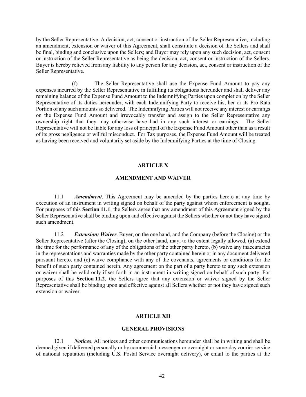 42 by the Seller Representative. A decision, act, consent or instruction of the Seller Representative, including an amendment, extension or waiver of this Agreement, shall constitute a decision of the Sellers and shall be final, binding and conclusive upon the Sellers; and Buyer may rely upon any such decision, act, consent or instruction of the Seller Representative as being the decision, act, consent or instruction of the Sellers. Buyer is hereby relieved from any liability to any person for any decision, act, consent or instruction of the Seller Representative. (f) The Seller Representative shall use the Expense Fund Amount to pay any expenses incurred by the Seller Representative in fulfilling its obligations hereunder and shall deliver any remaining balance of the Expense Fund Amount to the Indemnifying Parties upon completion by the Seller Representative of its duties hereunder, with each Indemnifying Party to receive his, her or its Pro Rata Portion of any such amounts so delivered. The Indemnifying Parties will not receive any interest or earnings on the Expense Fund Amount and irrevocably transfer and assign to the Seller Representative any ownership right that they may otherwise have had in any such interest or earnings. The Seller Representative will not be liable for any loss of principal of the Expense Fund Amount other than as a result of its gross negligence or willful misconduct. For Tax purposes, the Expense Fund Amount will be treated as having been received and voluntarily set aside by the Indemnifying Parties at the time of Closing. ARTICLE X AMENDMENT AND WAIVER 11.1 Amendment. This Agreement may be amended by the parties hereto at any time by execution of an instrument in writing signed on behalf of the party against whom enforcement is sought. For purposes of this Section 11.1, the Sellers agree that any amendment of this Agreement signed by the Seller Representative shall be binding upon and effective against the Sellers whether or not they have signed such amendment. 11.2 Extension; Waiver. Buyer, on the one hand, and the Company (before the Closing) or the Seller Representative (after the Closing), on the other hand, may, to the extent legally allowed, (a) extend the time for the performance of any of the obligations of the other party hereto, (b) waive any inaccuracies in the representations and warranties made by the other party contained herein or in any document delivered pursuant hereto, and (c) waive compliance with any of the covenants, agreements or conditions for the benefit of such party contained herein. Any agreement on the part of a party hereto to any such extension or waiver shall be valid only if set forth in an instrument in writing signed on behalf of such party. For purposes of this Section 11.2, the Sellers agree that any extension or waiver signed by the Seller Representative shall be binding upon and effective against all Sellers whether or not they have signed such extension or waiver. ARTICLE XII GENERAL PROVISIONS 12.1 Notices. All notices and other communications hereunder shall be in writing and shall be deemed given if delivered personally or by commercial messenger or overnight or same-day courier service of national reputation (including U.S. Postal Service overnight delivery), or email to the parties at the