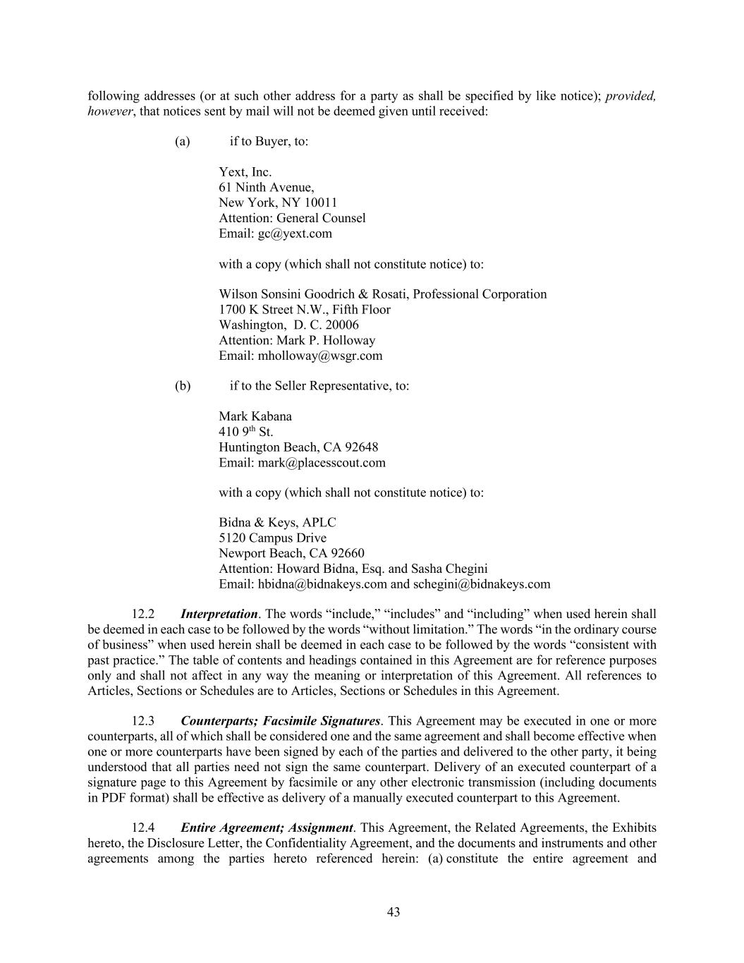 43 following addresses (or at such other address for a party as shall be specified by like notice); provided, however, that notices sent by mail will not be deemed given until received: (a) if to Buyer, to: Yext, Inc. 61 Ninth Avenue, New York, NY 10011 Attention: General Counsel Email: gc@yext.com with a copy (which shall not constitute notice) to: Wilson Sonsini Goodrich & Rosati, Professional Corporation 1700 K Street N.W., Fifth Floor Washington, D. C. 20006 Attention: Mark P. Holloway Email: mholloway@wsgr.com (b) if to the Seller Representative, to: Mark Kabana 410 9th St. Huntington Beach, CA 92648 Email: mark@placesscout.com with a copy (which shall not constitute notice) to: Bidna & Keys, APLC 5120 Campus Drive Newport Beach, CA 92660 Attention: Howard Bidna, Esq. and Sasha Chegini Email: hbidna@bidnakeys.com and schegini@bidnakeys.com 12.2 Interpretation. The words “include,” “includes” and “including” when used herein shall be deemed in each case to be followed by the words “without limitation.” The words “in the ordinary course of business” when used herein shall be deemed in each case to be followed by the words “consistent with past practice.” The table of contents and headings contained in this Agreement are for reference purposes only and shall not affect in any way the meaning or interpretation of this Agreement. All references to Articles, Sections or Schedules are to Articles, Sections or Schedules in this Agreement. 12.3 Counterparts; Facsimile Signatures. This Agreement may be executed in one or more counterparts, all of which shall be considered one and the same agreement and shall become effective when one or more counterparts have been signed by each of the parties and delivered to the other party, it being understood that all parties need not sign the same counterpart. Delivery of an executed counterpart of a signature page to this Agreement by facsimile or any other electronic transmission (including documents in PDF format) shall be effective as delivery of a manually executed counterpart to this Agreement. 12.4 Entire Agreement; Assignment. This Agreement, the Related Agreements, the Exhibits hereto, the Disclosure Letter, the Confidentiality Agreement, and the documents and instruments and other agreements among the parties hereto referenced herein: (a) constitute the entire agreement and