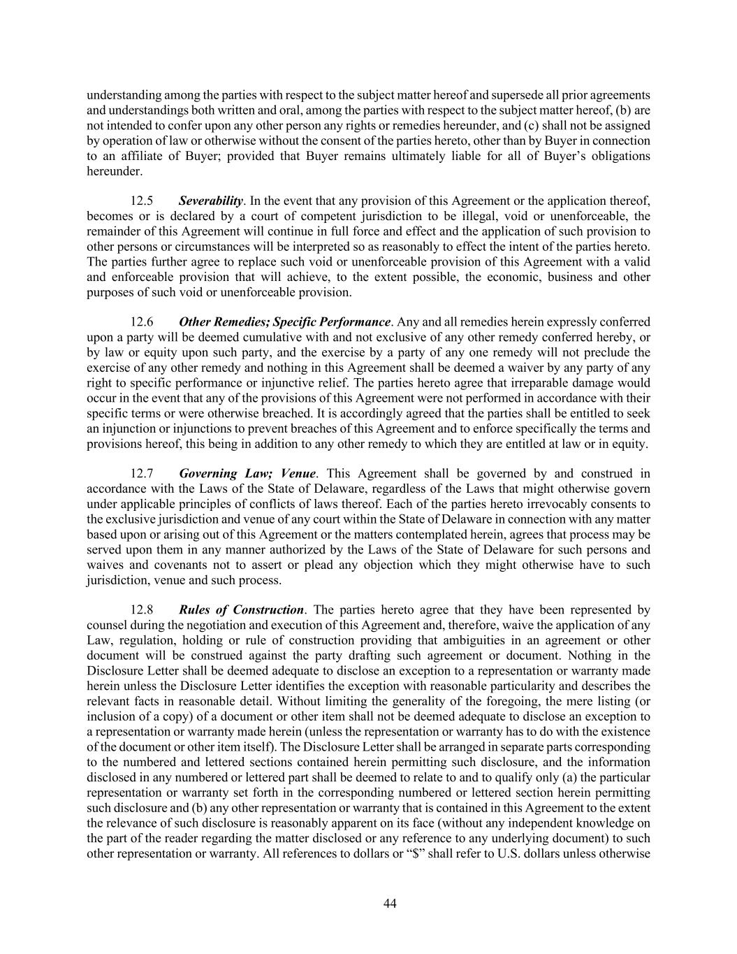 44 understanding among the parties with respect to the subject matter hereof and supersede all prior agreements and understandings both written and oral, among the parties with respect to the subject matter hereof, (b) are not intended to confer upon any other person any rights or remedies hereunder, and (c) shall not be assigned by operation of law or otherwise without the consent of the parties hereto, other than by Buyer in connection to an affiliate of Buyer; provided that Buyer remains ultimately liable for all of Buyer’s obligations hereunder. 12.5 Severability. In the event that any provision of this Agreement or the application thereof, becomes or is declared by a court of competent jurisdiction to be illegal, void or unenforceable, the remainder of this Agreement will continue in full force and effect and the application of such provision to other persons or circumstances will be interpreted so as reasonably to effect the intent of the parties hereto. The parties further agree to replace such void or unenforceable provision of this Agreement with a valid and enforceable provision that will achieve, to the extent possible, the economic, business and other purposes of such void or unenforceable provision. 12.6 Other Remedies; Specific Performance. Any and all remedies herein expressly conferred upon a party will be deemed cumulative with and not exclusive of any other remedy conferred hereby, or by law or equity upon such party, and the exercise by a party of any one remedy will not preclude the exercise of any other remedy and nothing in this Agreement shall be deemed a waiver by any party of any right to specific performance or injunctive relief. The parties hereto agree that irreparable damage would occur in the event that any of the provisions of this Agreement were not performed in accordance with their specific terms or were otherwise breached. It is accordingly agreed that the parties shall be entitled to seek an injunction or injunctions to prevent breaches of this Agreement and to enforce specifically the terms and provisions hereof, this being in addition to any other remedy to which they are entitled at law or in equity. 12.7 Governing Law; Venue. This Agreement shall be governed by and construed in accordance with the Laws of the State of Delaware, regardless of the Laws that might otherwise govern under applicable principles of conflicts of laws thereof. Each of the parties hereto irrevocably consents to the exclusive jurisdiction and venue of any court within the State of Delaware in connection with any matter based upon or arising out of this Agreement or the matters contemplated herein, agrees that process may be served upon them in any manner authorized by the Laws of the State of Delaware for such persons and waives and covenants not to assert or plead any objection which they might otherwise have to such jurisdiction, venue and such process. 12.8 Rules of Construction. The parties hereto agree that they have been represented by counsel during the negotiation and execution of this Agreement and, therefore, waive the application of any Law, regulation, holding or rule of construction providing that ambiguities in an agreement or other document will be construed against the party drafting such agreement or document. Nothing in the Disclosure Letter shall be deemed adequate to disclose an exception to a representation or warranty made herein unless the Disclosure Letter identifies the exception with reasonable particularity and describes the relevant facts in reasonable detail. Without limiting the generality of the foregoing, the mere listing (or inclusion of a copy) of a document or other item shall not be deemed adequate to disclose an exception to a representation or warranty made herein (unless the representation or warranty has to do with the existence of the document or other item itself). The Disclosure Letter shall be arranged in separate parts corresponding to the numbered and lettered sections contained herein permitting such disclosure, and the information disclosed in any numbered or lettered part shall be deemed to relate to and to qualify only (a) the particular representation or warranty set forth in the corresponding numbered or lettered section herein permitting such disclosure and (b) any other representation or warranty that is contained in this Agreement to the extent the relevance of such disclosure is reasonably apparent on its face (without any independent knowledge on the part of the reader regarding the matter disclosed or any reference to any underlying document) to such other representation or warranty. All references to dollars or “$” shall refer to U.S. dollars unless otherwise