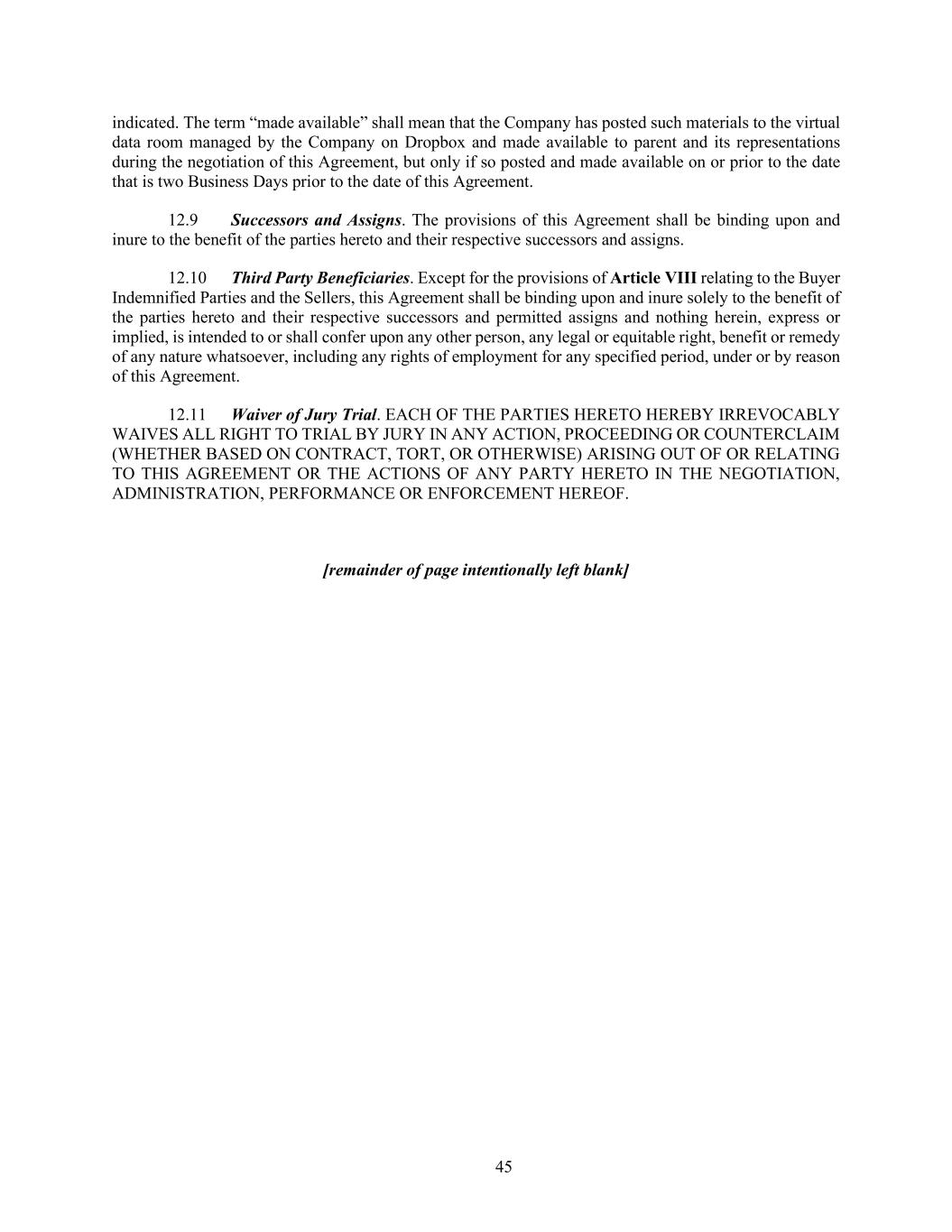 45 indicated. The term “made available” shall mean that the Company has posted such materials to the virtual data room managed by the Company on Dropbox and made available to parent and its representations during the negotiation of this Agreement, but only if so posted and made available on or prior to the date that is two Business Days prior to the date of this Agreement. 12.9 Successors and Assigns. The provisions of this Agreement shall be binding upon and inure to the benefit of the parties hereto and their respective successors and assigns. 12.10 Third Party Beneficiaries. Except for the provisions of Article VIII relating to the Buyer Indemnified Parties and the Sellers, this Agreement shall be binding upon and inure solely to the benefit of the parties hereto and their respective successors and permitted assigns and nothing herein, express or implied, is intended to or shall confer upon any other person, any legal or equitable right, benefit or remedy of any nature whatsoever, including any rights of employment for any specified period, under or by reason of this Agreement. 12.11 Waiver of Jury Trial. EACH OF THE PARTIES HERETO HEREBY IRREVOCABLY WAIVES ALL RIGHT TO TRIAL BY JURY IN ANY ACTION, PROCEEDING OR COUNTERCLAIM (WHETHER BASED ON CONTRACT, TORT, OR OTHERWISE) ARISING OUT OF OR RELATING TO THIS AGREEMENT OR THE ACTIONS OF ANY PARTY HERETO IN THE NEGOTIATION, ADMINISTRATION, PERFORMANCE OR ENFORCEMENT HEREOF. [remainder of page intentionally left blank]