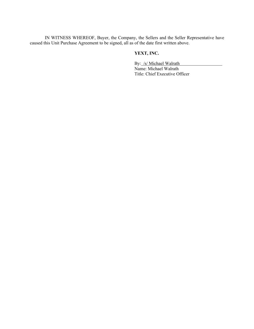IN WITNESS WHEREOF, Buyer, the Company, the Sellers and the Seller Representative have caused this Unit Purchase Agreement to be signed, all as of the date first written above. YEXT, INC. By: /s/ Michael Walrath Name: Michael Walrath Title: Chief Executive Officer