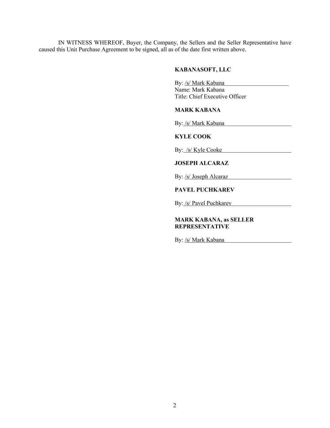 2 IN WITNESS WHEREOF, Buyer, the Company, the Sellers and the Seller Representative have caused this Unit Purchase Agreement to be signed, all as of the date first written above. KABANASOFT, LLC By: /s/ Mark Kabana Name: Mark Kabana Title: Chief Executive Officer MARK KABANA By: /s/ Mark Kabana KYLE COOK By: /s/ Kyle Cooke JOSEPH ALCARAZ By: /s/ Joseph Alcaraz PAVEL PUCHKAREV By: /s/ Pavel Puchkarev MARK KABANA, as SELLER REPRESENTATIVE By: /s/ Mark Kabana