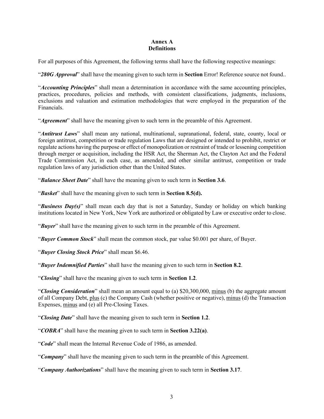3 Annex A Definitions For all purposes of this Agreement, the following terms shall have the following respective meanings: “280G Approval” shall have the meaning given to such term in Section Error! Reference source not found.. “Accounting Principles” shall mean a determination in accordance with the same accounting principles, practices, procedures, policies and methods, with consistent classifications, judgments, inclusions, exclusions and valuation and estimation methodologies that were employed in the preparation of the Financials. “Agreement” shall have the meaning given to such term in the preamble of this Agreement. “Antitrust Laws” shall mean any national, multinational, supranational, federal, state, county, local or foreign antitrust, competition or trade regulation Laws that are designed or intended to prohibit, restrict or regulate actions having the purpose or effect of monopolization or restraint of trade or lessening competition through merger or acquisition, including the HSR Act, the Sherman Act, the Clayton Act and the Federal Trade Commission Act, in each case, as amended, and other similar antitrust, competition or trade regulation laws of any jurisdiction other than the United States. “Balance Sheet Date” shall have the meaning given to such term in Section 3.6. “Basket” shall have the meaning given to such term in Section 8.5(d). “Business Day(s)” shall mean each day that is not a Saturday, Sunday or holiday on which banking institutions located in New York, New York are authorized or obligated by Law or executive order to close. “Buyer” shall have the meaning given to such term in the preamble of this Agreement. “Buyer Common Stock” shall mean the common stock, par value $0.001 per share, of Buyer. “Buyer Closing Stock Price” shall mean $6.46. “Buyer Indemnified Parties” shall have the meaning given to such term in Section 8.2. “Closing” shall have the meaning given to such term in Section 1.2. “Closing Consideration” shall mean an amount equal to (a) $20,300,000, minus (b) the aggregate amount of all Company Debt, plus (c) the Company Cash (whether positive or negative), minus (d) the Transaction Expenses, minus and (e) all Pre-Closing Taxes. “Closing Date” shall have the meaning given to such term in Section 1.2. “COBRA” shall have the meaning given to such term in Section 3.22(a). “Code” shall mean the Internal Revenue Code of 1986, as amended. “Company” shall have the meaning given to such term in the preamble of this Agreement. “Company Authorizations” shall have the meaning given to such term in Section 3.17.