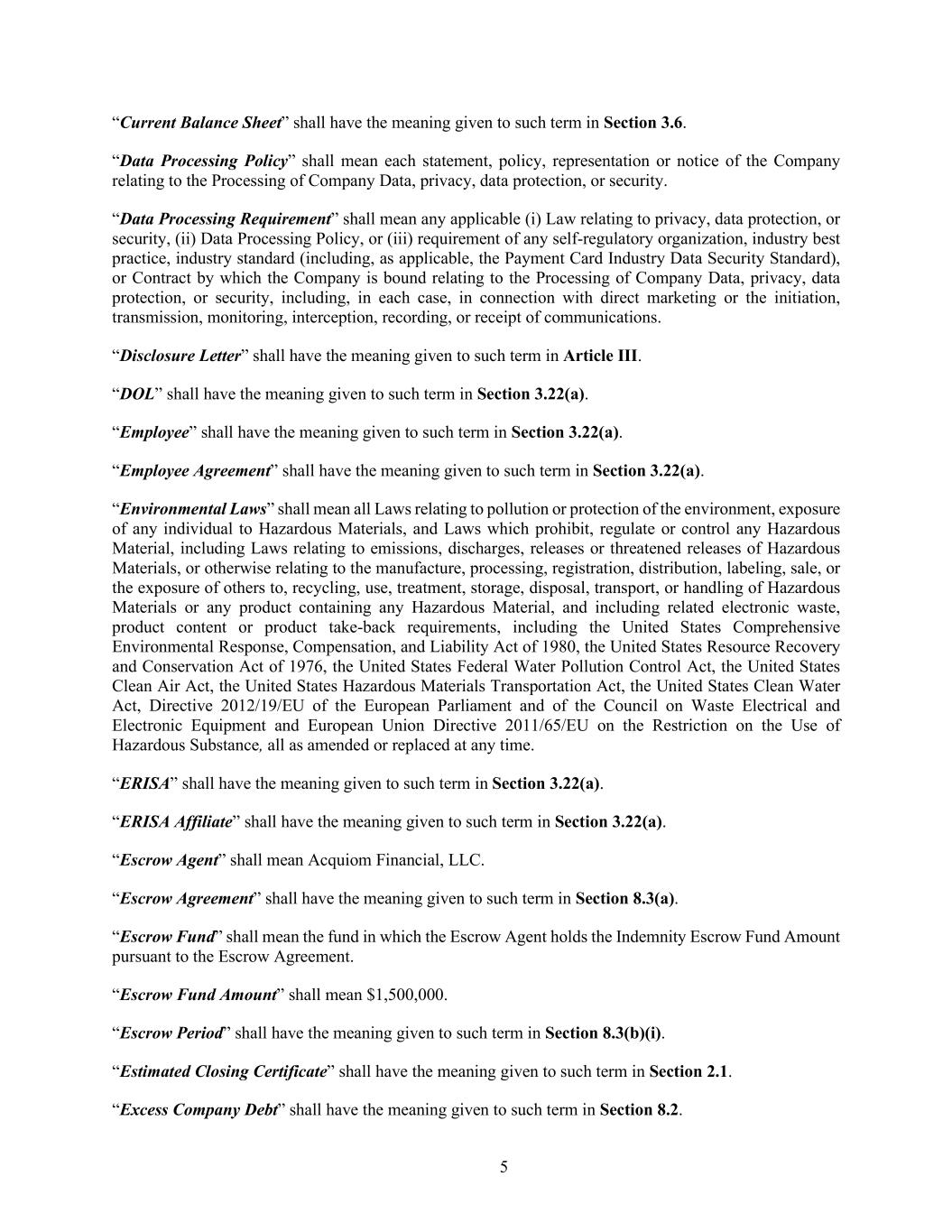5 “Current Balance Sheet” shall have the meaning given to such term in Section 3.6. “Data Processing Policy” shall mean each statement, policy, representation or notice of the Company relating to the Processing of Company Data, privacy, data protection, or security. “Data Processing Requirement” shall mean any applicable (i) Law relating to privacy, data protection, or security, (ii) Data Processing Policy, or (iii) requirement of any self-regulatory organization, industry best practice, industry standard (including, as applicable, the Payment Card Industry Data Security Standard), or Contract by which the Company is bound relating to the Processing of Company Data, privacy, data protection, or security, including, in each case, in connection with direct marketing or the initiation, transmission, monitoring, interception, recording, or receipt of communications. “Disclosure Letter” shall have the meaning given to such term in Article III. “DOL” shall have the meaning given to such term in Section 3.22(a). “Employee” shall have the meaning given to such term in Section 3.22(a). “Employee Agreement” shall have the meaning given to such term in Section 3.22(a). “Environmental Laws” shall mean all Laws relating to pollution or protection of the environment, exposure of any individual to Hazardous Materials, and Laws which prohibit, regulate or control any Hazardous Material, including Laws relating to emissions, discharges, releases or threatened releases of Hazardous Materials, or otherwise relating to the manufacture, processing, registration, distribution, labeling, sale, or the exposure of others to, recycling, use, treatment, storage, disposal, transport, or handling of Hazardous Materials or any product containing any Hazardous Material, and including related electronic waste, product content or product take-back requirements, including the United States Comprehensive Environmental Response, Compensation, and Liability Act of 1980, the United States Resource Recovery and Conservation Act of 1976, the United States Federal Water Pollution Control Act, the United States Clean Air Act, the United States Hazardous Materials Transportation Act, the United States Clean Water Act, Directive 2012/19/EU of the European Parliament and of the Council on Waste Electrical and Electronic Equipment and European Union Directive 2011/65/EU on the Restriction on the Use of Hazardous Substance, all as amended or replaced at any time. “ERISA” shall have the meaning given to such term in Section 3.22(a). “ERISA Affiliate” shall have the meaning given to such term in Section 3.22(a). “Escrow Agent” shall mean Acquiom Financial, LLC. “Escrow Agreement” shall have the meaning given to such term in Section 8.3(a). “Escrow Fund” shall mean the fund in which the Escrow Agent holds the Indemnity Escrow Fund Amount pursuant to the Escrow Agreement. “Escrow Fund Amount” shall mean $1,500,000. “Escrow Period” shall have the meaning given to such term in Section 8.3(b)(i). “Estimated Closing Certificate” shall have the meaning given to such term in Section 2.1. “Excess Company Debt” shall have the meaning given to such term in Section 8.2.