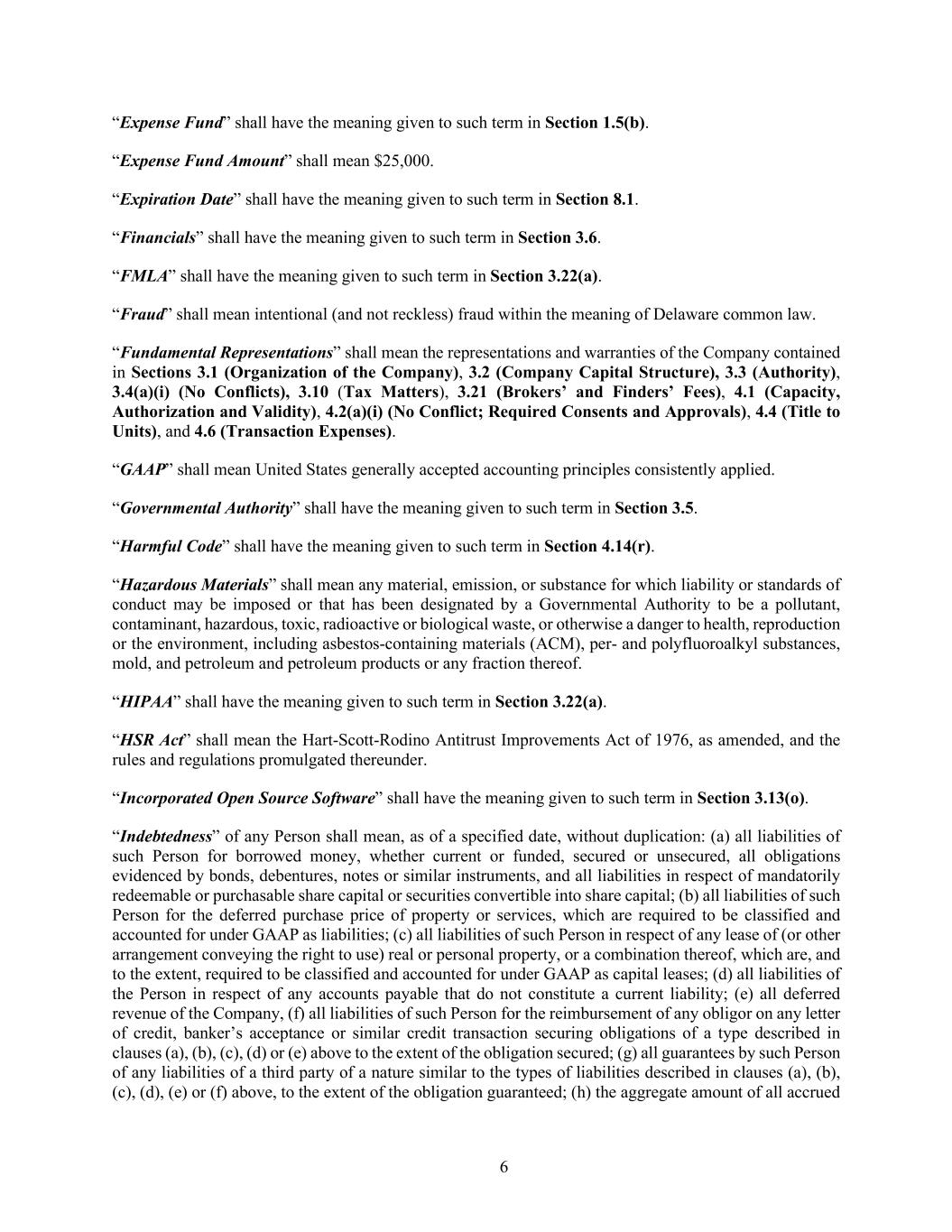 6 “Expense Fund” shall have the meaning given to such term in Section 1.5(b). “Expense Fund Amount” shall mean $25,000. “Expiration Date” shall have the meaning given to such term in Section 8.1. “Financials” shall have the meaning given to such term in Section 3.6. “FMLA” shall have the meaning given to such term in Section 3.22(a). “Fraud” shall mean intentional (and not reckless) fraud within the meaning of Delaware common law. “Fundamental Representations” shall mean the representations and warranties of the Company contained in Sections 3.1 (Organization of the Company), 3.2 (Company Capital Structure), 3.3 (Authority), 3.4(a)(i) (No Conflicts), 3.10 (Tax Matters), 3.21 (Brokers’ and Finders’ Fees), 4.1 (Capacity, Authorization and Validity), 4.2(a)(i) (No Conflict; Required Consents and Approvals), 4.4 (Title to Units), and 4.6 (Transaction Expenses). “GAAP” shall mean United States generally accepted accounting principles consistently applied. “Governmental Authority” shall have the meaning given to such term in Section 3.5. “Harmful Code” shall have the meaning given to such term in Section 4.14(r). “Hazardous Materials” shall mean any material, emission, or substance for which liability or standards of conduct may be imposed or that has been designated by a Governmental Authority to be a pollutant, contaminant, hazardous, toxic, radioactive or biological waste, or otherwise a danger to health, reproduction or the environment, including asbestos-containing materials (ACM), per- and polyfluoroalkyl substances, mold, and petroleum and petroleum products or any fraction thereof. “HIPAA” shall have the meaning given to such term in Section 3.22(a). “HSR Act” shall mean the Hart-Scott-Rodino Antitrust Improvements Act of 1976, as amended, and the rules and regulations promulgated thereunder. “Incorporated Open Source Software” shall have the meaning given to such term in Section 3.13(o). “Indebtedness” of any Person shall mean, as of a specified date, without duplication: (a) all liabilities of such Person for borrowed money, whether current or funded, secured or unsecured, all obligations evidenced by bonds, debentures, notes or similar instruments, and all liabilities in respect of mandatorily redeemable or purchasable share capital or securities convertible into share capital; (b) all liabilities of such Person for the deferred purchase price of property or services, which are required to be classified and accounted for under GAAP as liabilities; (c) all liabilities of such Person in respect of any lease of (or other arrangement conveying the right to use) real or personal property, or a combination thereof, which are, and to the extent, required to be classified and accounted for under GAAP as capital leases; (d) all liabilities of the Person in respect of any accounts payable that do not constitute a current liability; (e) all deferred revenue of the Company, (f) all liabilities of such Person for the reimbursement of any obligor on any letter of credit, banker’s acceptance or similar credit transaction securing obligations of a type described in clauses (a), (b), (c), (d) or (e) above to the extent of the obligation secured; (g) all guarantees by such Person of any liabilities of a third party of a nature similar to the types of liabilities described in clauses (a), (b), (c), (d), (e) or (f) above, to the extent of the obligation guaranteed; (h) the aggregate amount of all accrued