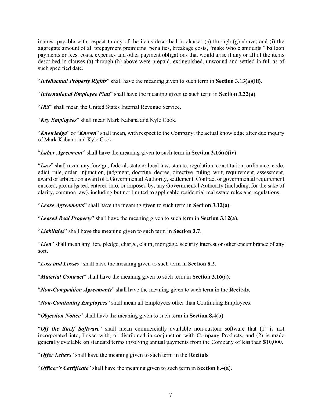 7 interest payable with respect to any of the items described in clauses (a) through (g) above; and (i) the aggregate amount of all prepayment premiums, penalties, breakage costs, “make whole amounts,” balloon payments or fees, costs, expenses and other payment obligations that would arise if any or all of the items described in clauses (a) through (h) above were prepaid, extinguished, unwound and settled in full as of such specified date. “Intellectual Property Rights” shall have the meaning given to such term in Section 3.13(a)(iii). “International Employee Plan” shall have the meaning given to such term in Section 3.22(a). “IRS” shall mean the United States Internal Revenue Service. “Key Employees” shall mean Mark Kabana and Kyle Cook. “Knowledge” or “Known” shall mean, with respect to the Company, the actual knowledge after due inquiry of Mark Kabana and Kyle Cook. “Labor Agreement” shall have the meaning given to such term in Section 3.16(a)(iv). “Law” shall mean any foreign, federal, state or local law, statute, regulation, constitution, ordinance, code, edict, rule, order, injunction, judgment, doctrine, decree, directive, ruling, writ, requirement, assessment, award or arbitration award of a Governmental Authority, settlement, Contract or governmental requirement enacted, promulgated, entered into, or imposed by, any Governmental Authority (including, for the sake of clarity, common law), including but not limited to applicable residential real estate rules and regulations. “Lease Agreements” shall have the meaning given to such term in Section 3.12(a). “Leased Real Property” shall have the meaning given to such term in Section 3.12(a). “Liabilities” shall have the meaning given to such term in Section 3.7. “Lien” shall mean any lien, pledge, charge, claim, mortgage, security interest or other encumbrance of any sort. “Loss and Losses” shall have the meaning given to such term in Section 8.2. “Material Contract” shall have the meaning given to such term in Section 3.16(a). “Non-Competition Agreements” shall have the meaning given to such term in the Recitals. “Non-Continuing Employees” shall mean all Employees other than Continuing Employees. “Objection Notice” shall have the meaning given to such term in Section 8.4(b). “Off the Shelf Software” shall mean commercially available non-custom software that (1) is not incorporated into, linked with, or distributed in conjunction with Company Products, and (2) is made generally available on standard terms involving annual payments from the Company of less than $10,000. “Offer Letters” shall have the meaning given to such term in the Recitals. “Officer’s Certificate” shall have the meaning given to such term in Section 8.4(a).