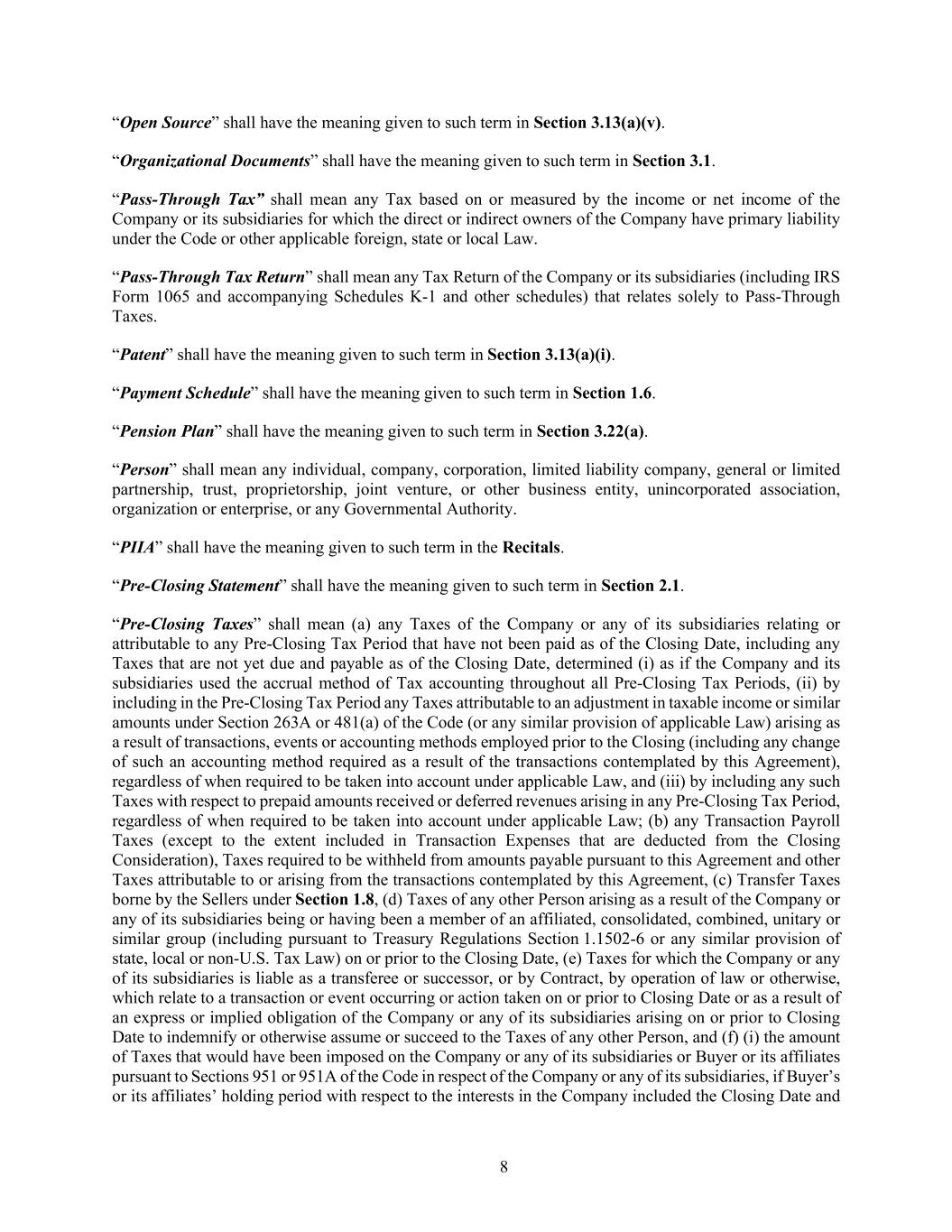 8 “Open Source” shall have the meaning given to such term in Section 3.13(a)(v). “Organizational Documents” shall have the meaning given to such term in Section 3.1. “Pass-Through Tax” shall mean any Tax based on or measured by the income or net income of the Company or its subsidiaries for which the direct or indirect owners of the Company have primary liability under the Code or other applicable foreign, state or local Law. “Pass-Through Tax Return” shall mean any Tax Return of the Company or its subsidiaries (including IRS Form 1065 and accompanying Schedules K-1 and other schedules) that relates solely to Pass-Through Taxes. “Patent” shall have the meaning given to such term in Section 3.13(a)(i). “Payment Schedule” shall have the meaning given to such term in Section 1.6. “Pension Plan” shall have the meaning given to such term in Section 3.22(a). “Person” shall mean any individual, company, corporation, limited liability company, general or limited partnership, trust, proprietorship, joint venture, or other business entity, unincorporated association, organization or enterprise, or any Governmental Authority. “PIIA” shall have the meaning given to such term in the Recitals. “Pre-Closing Statement” shall have the meaning given to such term in Section 2.1. “Pre-Closing Taxes” shall mean (a) any Taxes of the Company or any of its subsidiaries relating or attributable to any Pre-Closing Tax Period that have not been paid as of the Closing Date, including any Taxes that are not yet due and payable as of the Closing Date, determined (i) as if the Company and its subsidiaries used the accrual method of Tax accounting throughout all Pre-Closing Tax Periods, (ii) by including in the Pre-Closing Tax Period any Taxes attributable to an adjustment in taxable income or similar amounts under Section 263A or 481(a) of the Code (or any similar provision of applicable Law) arising as a result of transactions, events or accounting methods employed prior to the Closing (including any change of such an accounting method required as a result of the transactions contemplated by this Agreement), regardless of when required to be taken into account under applicable Law, and (iii) by including any such Taxes with respect to prepaid amounts received or deferred revenues arising in any Pre-Closing Tax Period, regardless of when required to be taken into account under applicable Law; (b) any Transaction Payroll Taxes (except to the extent included in Transaction Expenses that are deducted from the Closing Consideration), Taxes required to be withheld from amounts payable pursuant to this Agreement and other Taxes attributable to or arising from the transactions contemplated by this Agreement, (c) Transfer Taxes borne by the Sellers under Section 1.8, (d) Taxes of any other Person arising as a result of the Company or any of its subsidiaries being or having been a member of an affiliated, consolidated, combined, unitary or similar group (including pursuant to Treasury Regulations Section 1.1502-6 or any similar provision of state, local or non-U.S. Tax Law) on or prior to the Closing Date, (e) Taxes for which the Company or any of its subsidiaries is liable as a transferee or successor, or by Contract, by operation of law or otherwise, which relate to a transaction or event occurring or action taken on or prior to Closing Date or as a result of an express or implied obligation of the Company or any of its subsidiaries arising on or prior to Closing Date to indemnify or otherwise assume or succeed to the Taxes of any other Person, and (f) (i) the amount of Taxes that would have been imposed on the Company or any of its subsidiaries or Buyer or its affiliates pursuant to Sections 951 or 951A of the Code in respect of the Company or any of its subsidiaries, if Buyer’s or its affiliates’ holding period with respect to the interests in the Company included the Closing Date and