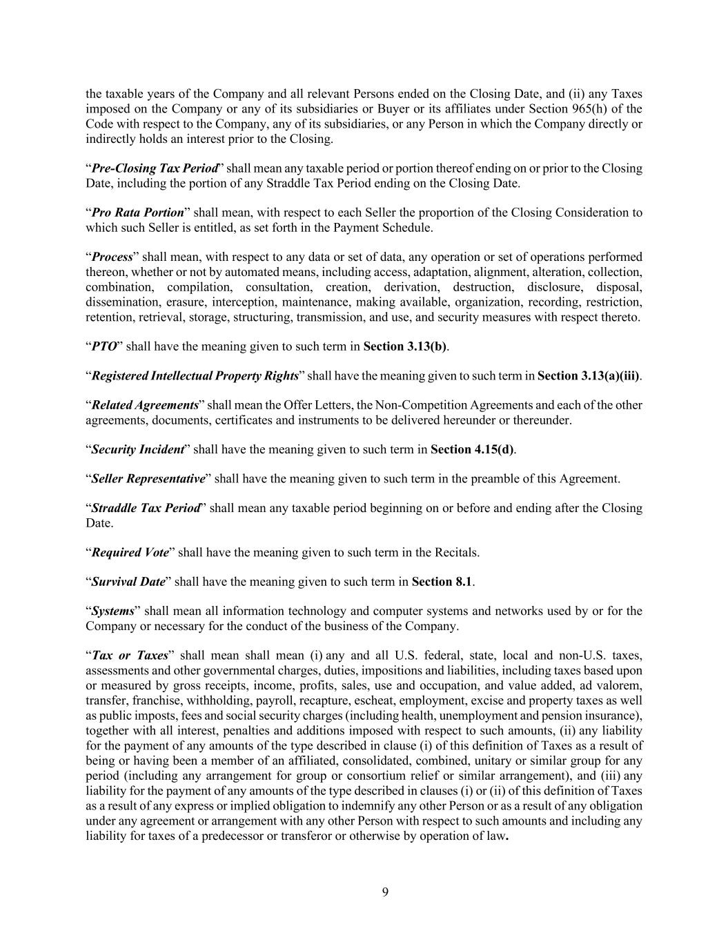 9 the taxable years of the Company and all relevant Persons ended on the Closing Date, and (ii) any Taxes imposed on the Company or any of its subsidiaries or Buyer or its affiliates under Section 965(h) of the Code with respect to the Company, any of its subsidiaries, or any Person in which the Company directly or indirectly holds an interest prior to the Closing. “Pre-Closing Tax Period” shall mean any taxable period or portion thereof ending on or prior to the Closing Date, including the portion of any Straddle Tax Period ending on the Closing Date. “Pro Rata Portion” shall mean, with respect to each Seller the proportion of the Closing Consideration to which such Seller is entitled, as set forth in the Payment Schedule. “Process” shall mean, with respect to any data or set of data, any operation or set of operations performed thereon, whether or not by automated means, including access, adaptation, alignment, alteration, collection, combination, compilation, consultation, creation, derivation, destruction, disclosure, disposal, dissemination, erasure, interception, maintenance, making available, organization, recording, restriction, retention, retrieval, storage, structuring, transmission, and use, and security measures with respect thereto. “PTO” shall have the meaning given to such term in Section 3.13(b). “Registered Intellectual Property Rights” shall have the meaning given to such term in Section 3.13(a)(iii). “Related Agreements” shall mean the Offer Letters, the Non-Competition Agreements and each of the other agreements, documents, certificates and instruments to be delivered hereunder or thereunder. “Security Incident” shall have the meaning given to such term in Section 4.15(d). “Seller Representative” shall have the meaning given to such term in the preamble of this Agreement. “Straddle Tax Period” shall mean any taxable period beginning on or before and ending after the Closing Date. “Required Vote” shall have the meaning given to such term in the Recitals. “Survival Date” shall have the meaning given to such term in Section 8.1. “Systems” shall mean all information technology and computer systems and networks used by or for the Company or necessary for the conduct of the business of the Company. “Tax or Taxes” shall mean shall mean (i) any and all U.S. federal, state, local and non-U.S. taxes, assessments and other governmental charges, duties, impositions and liabilities, including taxes based upon or measured by gross receipts, income, profits, sales, use and occupation, and value added, ad valorem, transfer, franchise, withholding, payroll, recapture, escheat, employment, excise and property taxes as well as public imposts, fees and social security charges (including health, unemployment and pension insurance), together with all interest, penalties and additions imposed with respect to such amounts, (ii) any liability for the payment of any amounts of the type described in clause (i) of this definition of Taxes as a result of being or having been a member of an affiliated, consolidated, combined, unitary or similar group for any period (including any arrangement for group or consortium relief or similar arrangement), and (iii) any liability for the payment of any amounts of the type described in clauses (i) or (ii) of this definition of Taxes as a result of any express or implied obligation to indemnify any other Person or as a result of any obligation under any agreement or arrangement with any other Person with respect to such amounts and including any liability for taxes of a predecessor or transferor or otherwise by operation of law.