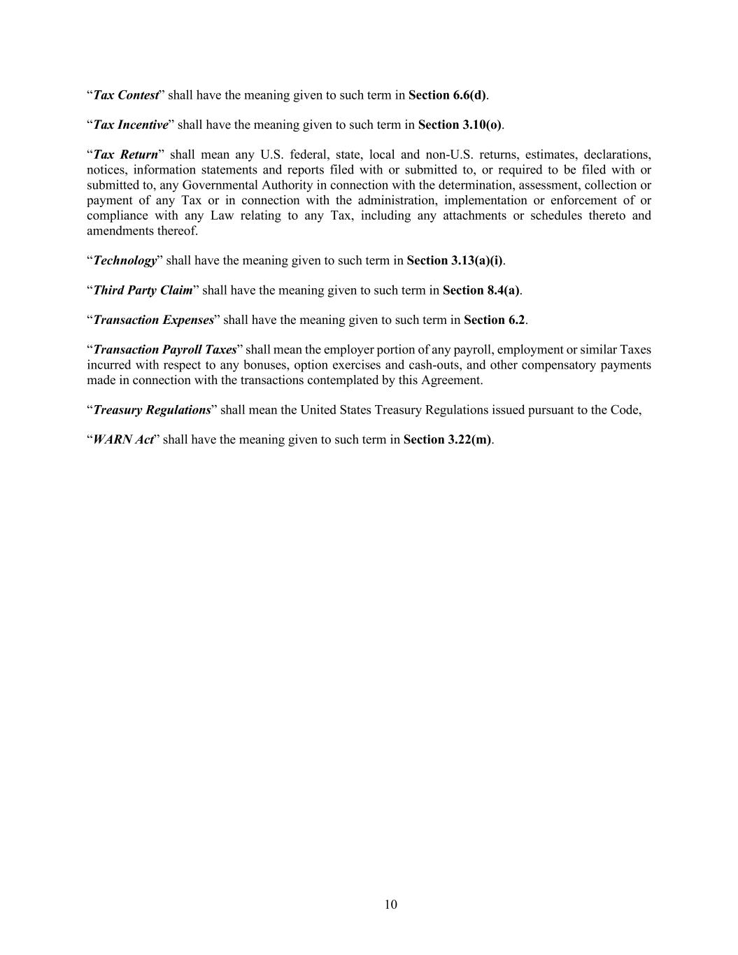 10 “Tax Contest” shall have the meaning given to such term in Section 6.6(d). “Tax Incentive” shall have the meaning given to such term in Section 3.10(o). “Tax Return” shall mean any U.S. federal, state, local and non-U.S. returns, estimates, declarations, notices, information statements and reports filed with or submitted to, or required to be filed with or submitted to, any Governmental Authority in connection with the determination, assessment, collection or payment of any Tax or in connection with the administration, implementation or enforcement of or compliance with any Law relating to any Tax, including any attachments or schedules thereto and amendments thereof. “Technology” shall have the meaning given to such term in Section 3.13(a)(i). “Third Party Claim” shall have the meaning given to such term in Section 8.4(a). “Transaction Expenses” shall have the meaning given to such term in Section 6.2. “Transaction Payroll Taxes” shall mean the employer portion of any payroll, employment or similar Taxes incurred with respect to any bonuses, option exercises and cash-outs, and other compensatory payments made in connection with the transactions contemplated by this Agreement. “Treasury Regulations” shall mean the United States Treasury Regulations issued pursuant to the Code, “WARN Act” shall have the meaning given to such term in Section 3.22(m).