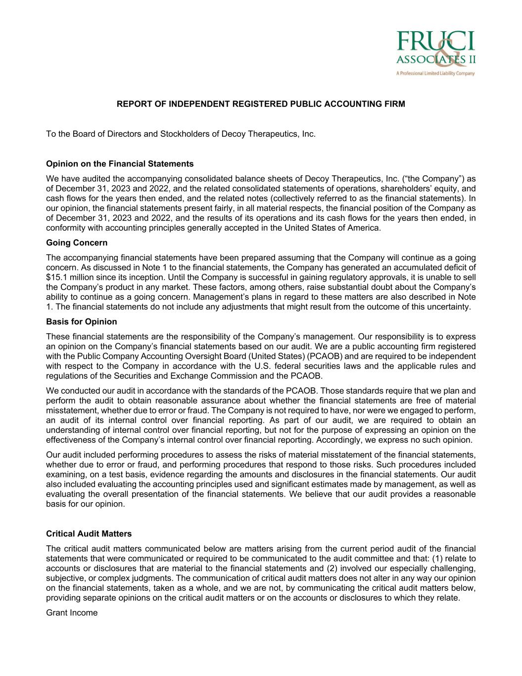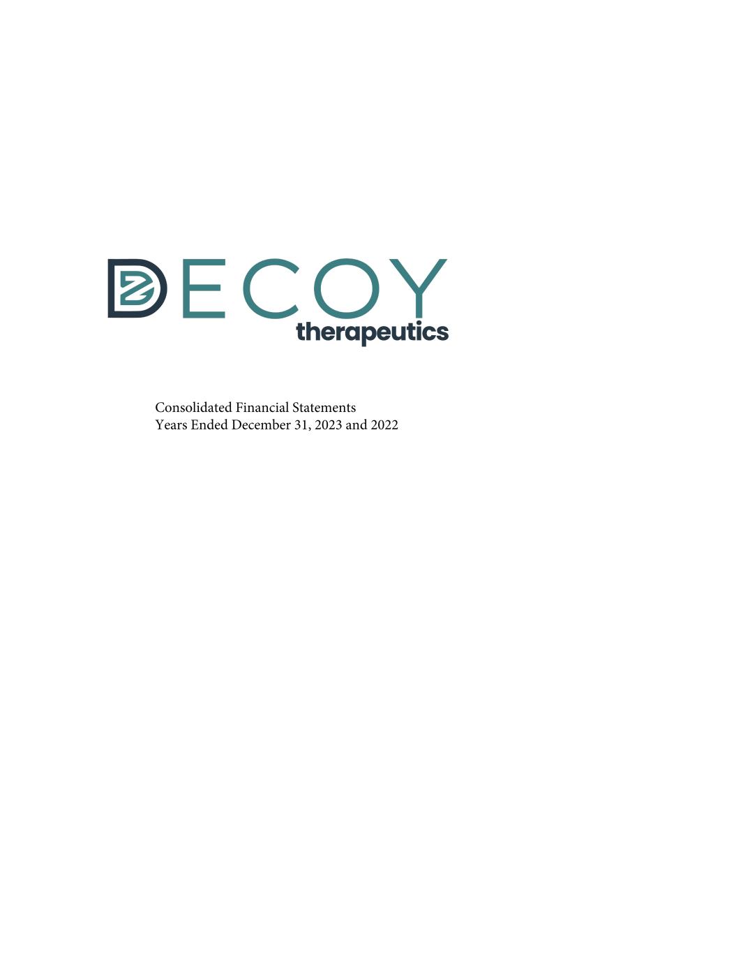 REPORT OF INDEPENDENT REGISTERED PUBLIC ACCOUNTING FIRM To the Board of Directors and Stockholders of Decoy Therapeutics, Inc. Opinion on the Financial Statements We have audited the accompanying consolidated balance sheets of Decoy Therapeutics, Inc. (“the Company”) as of December 31, 2023 and 2022, and the related consolidated statements of operations, shareholders’ equity, and cash flows for the years then ended, and the related notes (collectively referred to as the financial statements). In our opinion, the financial statements present fairly, in all material respects, the financial position of the Company as of December 31, 2023 and 2022, and the results of its operations and its cash flows for the years then ended, in conformity with accounting principles generally accepted in the United States of America. Going Concern The accompanying financial statements have been prepared assuming that the Company will continue as a going concern. As discussed in Note 1 to the financial statements, the Company has generated an accumulated deficit of $15.1 million since its inception. Until the Company is successful in gaining regulatory approvals, it is unable to sell the Company’s product in any market. These factors, among others, raise substantial doubt about the Company’s ability to continue as a going concern. Management’s plans in regard to these matters are also described in Note 1. The financial statements do not include any adjustments that might result from the outcome of this uncertainty. Basis for Opinion These financial statements are the responsibility of the Company’s management. Our responsibility is to express an opinion on the Company’s financial statements based on our audit. We are a public accounting firm registered with the Public Company Accounting Oversight Board (United States) (PCAOB) and are required to be independent with respect to the Company in accordance with the U.S. federal securities laws and the applicable rules and regulations of the Securities and Exchange Commission and the PCAOB. We conducted our audit in accordance with the standards of the PCAOB. Those standards require that we plan and perform the audit to obtain reasonable assurance about whether the financial statements are free of material misstatement, whether due to error or fraud. The Company is not required to have, nor were we engaged to perform, an audit of its internal control over financial reporting. As part of our audit, we are required to obtain an understanding of internal control over financial reporting, but not for the purpose of expressing an opinion on the effectiveness of the Company’s internal control over financial reporting. Accordingly, we express no such opinion. Our audit included performing procedures to assess the risks of material misstatement of the financial statements, whether due to error or fraud, and performing procedures that respond to those risks. Such procedures included examining, on a test basis, evidence regarding the amounts and disclosures in the financial statements. Our audit also included evaluating the accounting principles used and significant estimates made by management, as well as evaluating the overall presentation of the financial statements. We believe that our audit provides a reasonable basis for our opinion. Critical Audit Matters The critical audit matters communicated below are matters arising from the current period audit of the financial statements that were communicated or required to be communicated to the audit committee and that: (1) relate to accounts or disclosures that are material to the financial statements and (2) involved our especially challenging, subjective, or complex judgments. The communication of critical audit matters does not alter in any way our opinion on the financial statements, taken as a whole, and we are not, by communicating the critical audit matters below, providing separate opinions on the critical audit matters or on the accounts or disclosures to which they relate. Grant Income