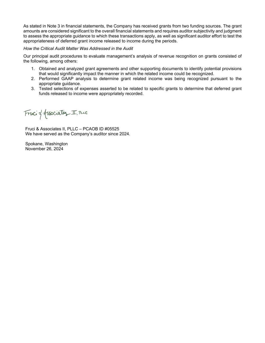As stated in Note 3 in financial statements, the Company has received grants from two funding sources. The grant amounts are considered significant to the overall financial statements and requires auditor subjectivity and judgment to assess the appropriate guidance to which these transactions apply, as well as significant auditor effort to test the appropriateness of deferred grant income released to income during the periods. How the Critical Audit Matter Was Addressed in the Audit Our principal audit procedures to evaluate management’s analysis of revenue recognition on grants consisted of the following, among others: 1. Obtained and analyzed grant agreements and other supporting documents to identify potential provisions that would significantly impact the manner in which the related income could be recognized. 2. Performed GAAP analysis to determine grant related income was being recognized pursuant to the appropriate guidance. 3. Tested selections of expenses asserted to be related to specific grants to determine that deferred grant funds released to income were appropriately recorded. Fruci & Associates II, PLLC – PCAOB ID #05525 We have served as the Company’s auditor since 2024. Spokane, Washington November 26, 2024