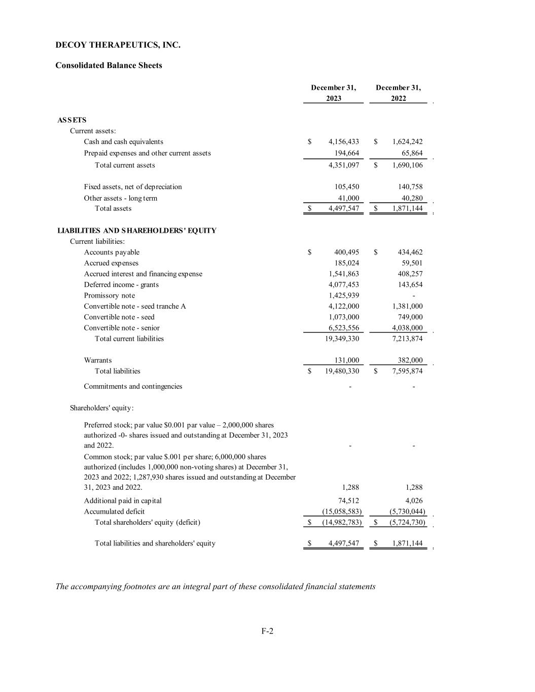 DECOY THERAPEUTICS, INC. F-2 Consolidated Balance Sheets December 31, December 31, 2023 2022 ASSETS Current assets: Cash and cash equivalents 4,156,433$ 1,624,242$ Prepaid expenses and other current assets 194,664 65,864 Total current assets 4,351,097 1,690,106$ Fixed assets, net of depreciation 105,450 140,758 Other assets - long term 41,000 40,280 Total assets 4,497,547$ 1,871,144$ LIABILITIES AND SHAREHOLDERS' EQUITY Current liabilities: Accounts payable 400,495$ 434,462$ Accrued expenses 185,024 59,501 Accrued interest and financing expense 1,541,863 408,257 Deferred income - grants 4,077,453 143,654 Promissory note 1,425,939 - Convertible note - seed tranche A 4,122,000 1,381,000 Convertible note - seed 1,073,000 749,000 Convertible note - senior 6,523,556 4,038,000 Total current liabilities 19,349,330 7,213,874 Warrants 131,000 382,000 Total liabilities 19,480,330$ 7,595,874$ Commitments and contingencies - - Shareholders' equity: - - 1,288 1,288 Additional paid in capital 74,512 4,026 Accumulated deficit (15,058,583) (5,730,044) Total shareholders' equity (deficit) (14,982,783)$ (5,724,730)$ Total liabilities and shareholders' equity 4,497,547$ 1,871,144$ Common stock; par value $.001 per share; 6,000,000 shares authorized (includes 1,000,000 non-voting shares) at December 31, 2023 and 2022; 1,287,930 shares issued and outstanding at December 31, 2023 and 2022. Preferred stock; par value $0.001 par value – 2,000,000 shares authorized -0- shares issued and outstanding at December 31, 2023 and 2022. The accompanying footnotes are an integral part of these consolidated financial statements