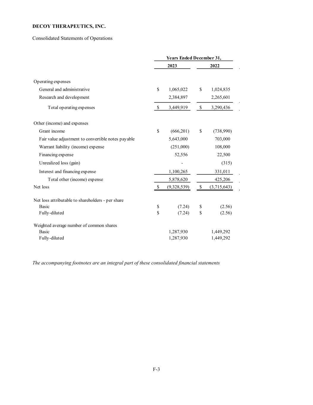 DECOY THERAPEUTICS, INC. F-3 Consolidated Statements of Operations 2023 2022 Operating expenses General and administrative 1,065,022$ 1,024,835$ Research and development 2,384,897 2,265,601 Total operating expenses 3,449,919$ 3,290,436$ Other (income) and expenses Grant income (666,201)$ (738,990)$ Fair value adjustment to convertible notes payable 5,643,000 703,000 Warrant liability (income) expense (251,000) 108,000 Financing expense 52,556 22,500 Unrealized loss (gain) - (315) Interest and financing expense 1,100,265 331,011 Total other (income) expense 5,878,620 425,206 Net loss (9,328,539)$ (3,715,643)$ Net loss attributable to shareholders - per share Basic (7.24)$ (2.56)$ Fully-diluted (7.24)$ (2.56)$ Weighted average number of common shares Basic 1,287,930 1,449,292 Fully-diluted 1,287,930 1,449,292 Years Ended December 31, The accompanying footnotes are an integral part of these consolidated financial statements