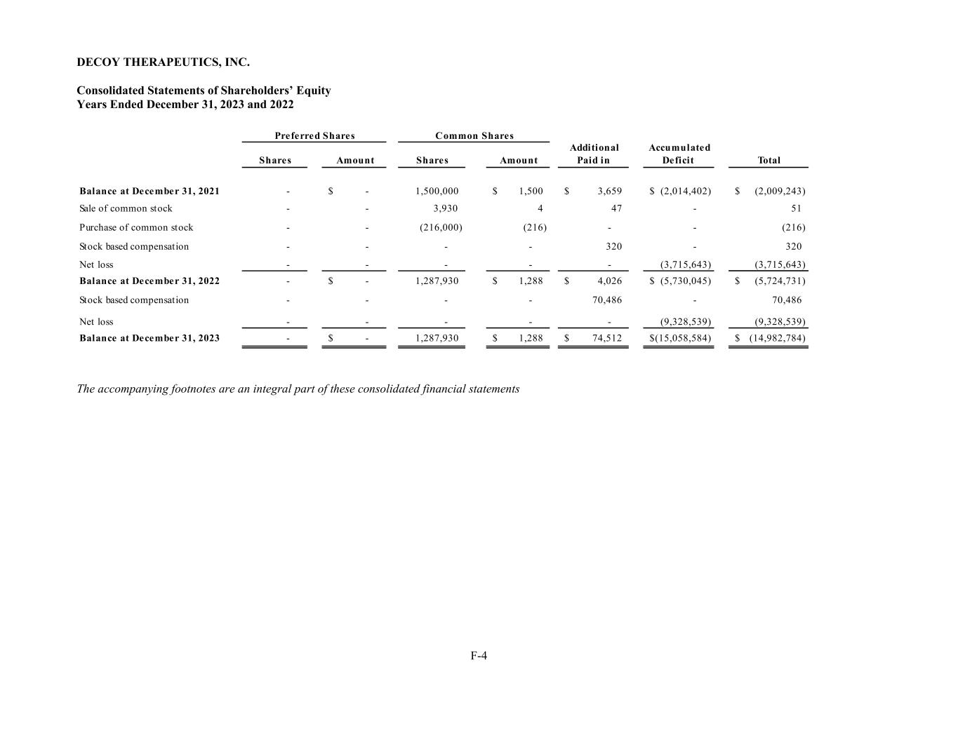 DECOY THERAPEUTICS, INC. F-4 Consolidated Statements of Shareholders’ Equity Years Ended December 31, 2023 and 2022 Shares Amount Shares Amount Additional Paid in Accumulated Deficit Total Balance at December 31, 2021 - -$ 1,500,000 1,500$ 3,659$ (2,014,402)$ (2,009,243)$ Sale of common stock - - 3,930 4 47 - 51 Purchase of common stock - - (216,000) (216) - - (216) Stock based compensation - - - - 320 - 320 Net loss - - - - - (3,715,643) (3,715,643) Balance at December 31, 2022 - -$ 1,287,930 1,288$ 4,026$ (5,730,045)$ (5,724,731)$ Stock based compensation - - - - 70,486 - 70,486 Net loss - - - - - (9,328,539) (9,328,539) Balance at December 31, 2023 - -$ 1,287,930 1,288$ 74,512$ (15,058,584)$ (14,982,784)$ Common Shares Preferred Shares The accompanying footnotes are an integral part of these consolidated financial statements