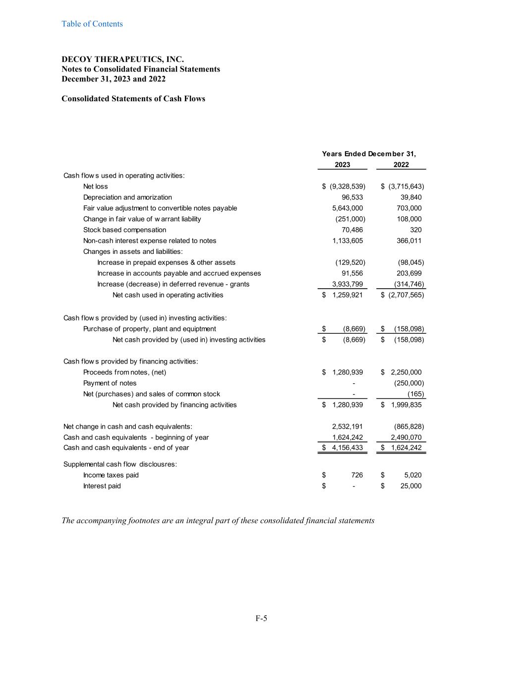 Table of Contents DECOY THERAPEUTICS, INC. Notes to Consolidated Financial Statements December 31, 2023 and 2022 F-5 Consolidated Statements of Cash Flows Years Ended December 31, 2023 2022 Cash flow s used in operating activities: Net loss (9,328,539)$ (3,715,643)$ Depreciation and amorization 96,533 39,840 Fair value adjustment to convertible notes payable 5,643,000 703,000 Change in fair value of w arrant liability (251,000) 108,000 Stock based compensation 70,486 320 Non-cash interest expense related to notes 1,133,605 366,011 Changes in assets and liabilities: Increase in prepaid expenses & other assets (129,520) (98,045) Increase in accounts payable and accrued expenses 91,556 203,699 Increase (decrease) in deferred revenue - grants 3,933,799 (314,746) Net cash used in operating activities 1,259,921$ (2,707,565)$ Cash f low s provided by (used in) investing activities: Purchase of property, plant and equiptment (8,669)$ (158,098)$ Net cash provided by (used in) investing activities (8,669)$ (158,098)$ Cash f low s provided by f inancing activities: Proceeds from notes, (net) 1,280,939$ 2,250,000$ Payment of notes - (250,000) Net (purchases) and sales of common stock - (165) Net cash provided by f inancing activities 1,280,939$ 1,999,835$ Net change in cash and cash equivalents: 2,532,191 (865,828) Cash and cash equivalents - beginning of year 1,624,242 2,490,070 Cash and cash equivalents - end of year 4,156,433$ 1,624,242$ Supplemental cash f low disclousres: Income taxes paid 726$ 5,020$ Interest paid -$ 25,000$ The accompanying footnotes are an integral part of these consolidated financial statements