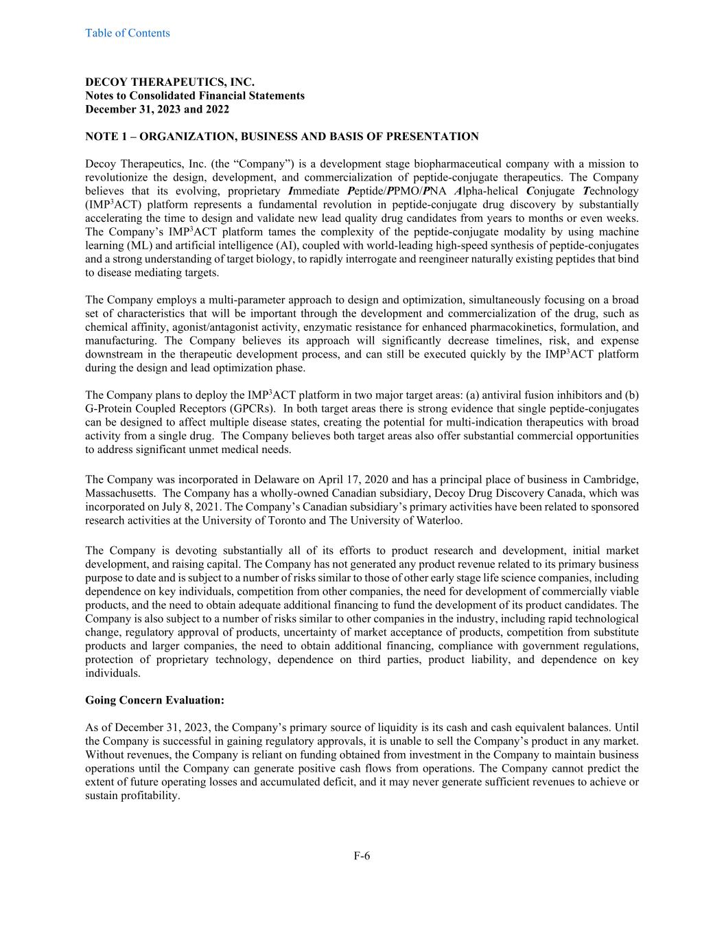 Table of Contents DECOY THERAPEUTICS, INC. Notes to Consolidated Financial Statements December 31, 2023 and 2022 F-6 NOTE 1 – ORGANIZATION, BUSINESS AND BASIS OF PRESENTATION Decoy Therapeutics, Inc. (the “Company”) is a development stage biopharmaceutical company with a mission to revolutionize the design, development, and commercialization of peptide-conjugate therapeutics. The Company believes that its evolving, proprietary Immediate Peptide/PPMO/PNA Alpha-helical Conjugate Technology (IMP3ACT) platform represents a fundamental revolution in peptide-conjugate drug discovery by substantially accelerating the time to design and validate new lead quality drug candidates from years to months or even weeks. The Company’s IMP3ACT platform tames the complexity of the peptide-conjugate modality by using machine learning (ML) and artificial intelligence (AI), coupled with world-leading high-speed synthesis of peptide-conjugates and a strong understanding of target biology, to rapidly interrogate and reengineer naturally existing peptides that bind to disease mediating targets. The Company employs a multi-parameter approach to design and optimization, simultaneously focusing on a broad set of characteristics that will be important through the development and commercialization of the drug, such as chemical affinity, agonist/antagonist activity, enzymatic resistance for enhanced pharmacokinetics, formulation, and manufacturing. The Company believes its approach will significantly decrease timelines, risk, and expense downstream in the therapeutic development process, and can still be executed quickly by the IMP3ACT platform during the design and lead optimization phase. The Company plans to deploy the IMP3ACT platform in two major target areas: (a) antiviral fusion inhibitors and (b) G-Protein Coupled Receptors (GPCRs). In both target areas there is strong evidence that single peptide-conjugates can be designed to affect multiple disease states, creating the potential for multi-indication therapeutics with broad activity from a single drug. The Company believes both target areas also offer substantial commercial opportunities to address significant unmet medical needs. The Company was incorporated in Delaware on April 17, 2020 and has a principal place of business in Cambridge, Massachusetts. The Company has a wholly-owned Canadian subsidiary, Decoy Drug Discovery Canada, which was incorporated on July 8, 2021. The Company’s Canadian subsidiary’s primary activities have been related to sponsored research activities at the University of Toronto and The University of Waterloo. The Company is devoting substantially all of its efforts to product research and development, initial market development, and raising capital. The Company has not generated any product revenue related to its primary business purpose to date and is subject to a number of risks similar to those of other early stage life science companies, including dependence on key individuals, competition from other companies, the need for development of commercially viable products, and the need to obtain adequate additional financing to fund the development of its product candidates. The Company is also subject to a number of risks similar to other companies in the industry, including rapid technological change, regulatory approval of products, uncertainty of market acceptance of products, competition from substitute products and larger companies, the need to obtain additional financing, compliance with government regulations, protection of proprietary technology, dependence on third parties, product liability, and dependence on key individuals. Going Concern Evaluation: As of December 31, 2023, the Company’s primary source of liquidity is its cash and cash equivalent balances. Until the Company is successful in gaining regulatory approvals, it is unable to sell the Company’s product in any market. Without revenues, the Company is reliant on funding obtained from investment in the Company to maintain business operations until the Company can generate positive cash flows from operations. The Company cannot predict the extent of future operating losses and accumulated deficit, and it may never generate sufficient revenues to achieve or sustain profitability.