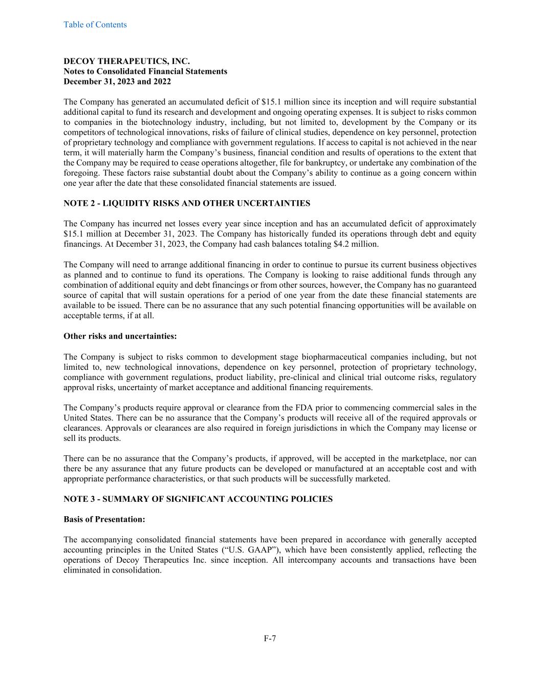Table of Contents DECOY THERAPEUTICS, INC. Notes to Consolidated Financial Statements December 31, 2023 and 2022 F-7 The Company has generated an accumulated deficit of $15.1 million since its inception and will require substantial additional capital to fund its research and development and ongoing operating expenses. It is subject to risks common to companies in the biotechnology industry, including, but not limited to, development by the Company or its competitors of technological innovations, risks of failure of clinical studies, dependence on key personnel, protection of proprietary technology and compliance with government regulations. If access to capital is not achieved in the near term, it will materially harm the Company’s business, financial condition and results of operations to the extent that the Company may be required to cease operations altogether, file for bankruptcy, or undertake any combination of the foregoing. These factors raise substantial doubt about the Company’s ability to continue as a going concern within one year after the date that these consolidated financial statements are issued. NOTE 2 - LIQUIDITY RISKS AND OTHER UNCERTAINTIES The Company has incurred net losses every year since inception and has an accumulated deficit of approximately $15.1 million at December 31, 2023. The Company has historically funded its operations through debt and equity financings. At December 31, 2023, the Company had cash balances totaling $4.2 million. The Company will need to arrange additional financing in order to continue to pursue its current business objectives as planned and to continue to fund its operations. The Company is looking to raise additional funds through any combination of additional equity and debt financings or from other sources, however, the Company has no guaranteed source of capital that will sustain operations for a period of one year from the date these financial statements are available to be issued. There can be no assurance that any such potential financing opportunities will be available on acceptable terms, if at all. Other risks and uncertainties: The Company is subject to risks common to development stage biopharmaceutical companies including, but not limited to, new technological innovations, dependence on key personnel, protection of proprietary technology, compliance with government regulations, product liability, pre-clinical and clinical trial outcome risks, regulatory approval risks, uncertainty of market acceptance and additional financing requirements. The Company’s products require approval or clearance from the FDA prior to commencing commercial sales in the United States. There can be no assurance that the Company’s products will receive all of the required approvals or clearances. Approvals or clearances are also required in foreign jurisdictions in which the Company may license or sell its products. There can be no assurance that the Company’s products, if approved, will be accepted in the marketplace, nor can there be any assurance that any future products can be developed or manufactured at an acceptable cost and with appropriate performance characteristics, or that such products will be successfully marketed. NOTE 3 - SUMMARY OF SIGNIFICANT ACCOUNTING POLICIES Basis of Presentation: The accompanying consolidated financial statements have been prepared in accordance with generally accepted accounting principles in the United States (“U.S. GAAP”), which have been consistently applied, reflecting the operations of Decoy Therapeutics Inc. since inception. All intercompany accounts and transactions have been eliminated in consolidation.