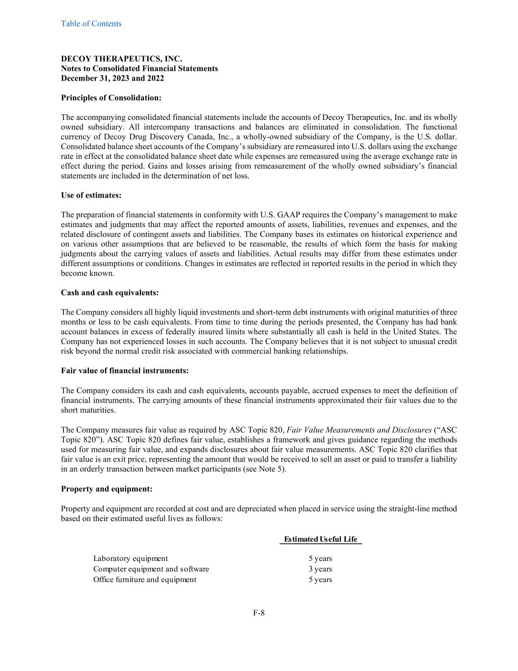 Table of Contents DECOY THERAPEUTICS, INC. Notes to Consolidated Financial Statements December 31, 2023 and 2022 F-8 Principles of Consolidation: The accompanying consolidated financial statements include the accounts of Decoy Therapeutics, Inc. and its wholly owned subsidiary. All intercompany transactions and balances are eliminated in consolidation. The functional currency of Decoy Drug Discovery Canada, Inc., a wholly-owned subsidiary of the Company, is the U.S. dollar. Consolidated balance sheet accounts of the Company’s subsidiary are remeasured into U.S. dollars using the exchange rate in effect at the consolidated balance sheet date while expenses are remeasured using the average exchange rate in effect during the period. Gains and losses arising from remeasurement of the wholly owned subsidiary’s financial statements are included in the determination of net loss. Use of estimates: The preparation of financial statements in conformity with U.S. GAAP requires the Company’s management to make estimates and judgments that may affect the reported amounts of assets, liabilities, revenues and expenses, and the related disclosure of contingent assets and liabilities. The Company bases its estimates on historical experience and on various other assumptions that are believed to be reasonable, the results of which form the basis for making judgments about the carrying values of assets and liabilities. Actual results may differ from these estimates under different assumptions or conditions. Changes in estimates are reflected in reported results in the period in which they become known. Cash and cash equivalents: The Company considers all highly liquid investments and short-term debt instruments with original maturities of three months or less to be cash equivalents. From time to time during the periods presented, the Company has had bank account balances in excess of federally insured limits where substantially all cash is held in the United States. The Company has not experienced losses in such accounts. The Company believes that it is not subject to unusual credit risk beyond the normal credit risk associated with commercial banking relationships. Fair value of financial instruments: The Company considers its cash and cash equivalents, accounts payable, accrued expenses to meet the definition of financial instruments. The carrying amounts of these financial instruments approximated their fair values due to the short maturities. The Company measures fair value as required by ASC Topic 820, Fair Value Measurements and Disclosures (“ASC Topic 820”). ASC Topic 820 defines fair value, establishes a framework and gives guidance regarding the methods used for measuring fair value, and expands disclosures about fair value measurements. ASC Topic 820 clarifies that fair value is an exit price, representing the amount that would be received to sell an asset or paid to transfer a liability in an orderly transaction between market participants (see Note 5). Property and equipment: Property and equipment are recorded at cost and are depreciated when placed in service using the straight-line method based on their estimated useful lives as follows: Estimated Useful Life Laboratory equipment 5 years Computer equipment and software 3 years Office furniture and equipment 5 years
