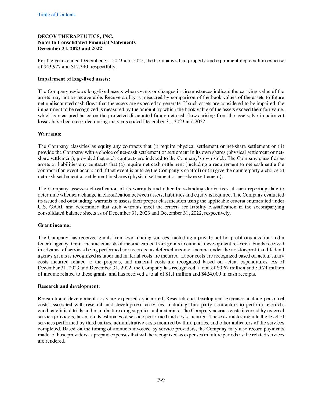 Table of Contents DECOY THERAPEUTICS, INC. Notes to Consolidated Financial Statements December 31, 2023 and 2022 F-9 For the years ended December 31, 2023 and 2022, the Company's had property and equipment depreciation expense of $43,977 and $17,340, respectfully. Impairment of long-lived assets: The Company reviews long-lived assets when events or changes in circumstances indicate the carrying value of the assets may not be recoverable. Recoverability is measured by comparison of the book values of the assets to future net undiscounted cash flows that the assets are expected to generate. If such assets are considered to be impaired, the impairment to be recognized is measured by the amount by which the book value of the assets exceed their fair value, which is measured based on the projected discounted future net cash flows arising from the assets. No impairment losses have been recorded during the years ended December 31, 2023 and 2022. Warrants: The Company classifies as equity any contracts that (i) require physical settlement or net-share settlement or (ii) provide the Company with a choice of net-cash settlement or settlement in its own shares (physical settlement or net- share settlement), provided that such contracts are indexed to the Company’s own stock. The Company classifies as assets or liabilities any contracts that (a) require net-cash settlement (including a requirement to net cash settle the contract if an event occurs and if that event is outside the Company’s control) or (b) give the counterparty a choice of net-cash settlement or settlement in shares (physical settlement or net-share settlement). The Company assesses classification of its warrants and other free-standing derivatives at each reporting date to determine whether a change in classification between assets, liabilities and equity is required. The Company evaluated its issued and outstanding warrants to assess their proper classification using the applicable criteria enumerated under U.S. GAAP and determined that such warrants meet the criteria for liability classification in the accompanying consolidated balance sheets as of December 31, 2023 and December 31, 2022, respectively. Grant income: The Company has received grants from two funding sources, including a private not-for-profit organization and a federal agency. Grant income consists of income earned from grants to conduct development research. Funds received in advance of services being performed are recorded as deferred income. Income under the not-for-profit and federal agency grants is recognized as labor and material costs are incurred. Labor costs are recognized based on actual salary costs incurred related to the projects, and material costs are recognized based on actual expenditures. As of December 31, 2023 and December 31, 2022, the Company has recognized a total of $0.67 million and $0.74 million of income related to these grants, and has received a total of $1.1 million and $424,000 in cash receipts. Research and development: Research and development costs are expensed as incurred. Research and development expenses include personnel costs associated with research and development activities, including third-party contractors to perform research, conduct clinical trials and manufacture drug supplies and materials. The Company accrues costs incurred by external service providers, based on its estimates of service performed and costs incurred. These estimates include the level of services performed by third parties, administrative costs incurred by third parties, and other indicators of the services completed. Based on the timing of amounts invoiced by service providers, the Company may also record payments made to those providers as prepaid expenses that will be recognized as expenses in future periods as the related services are rendered.