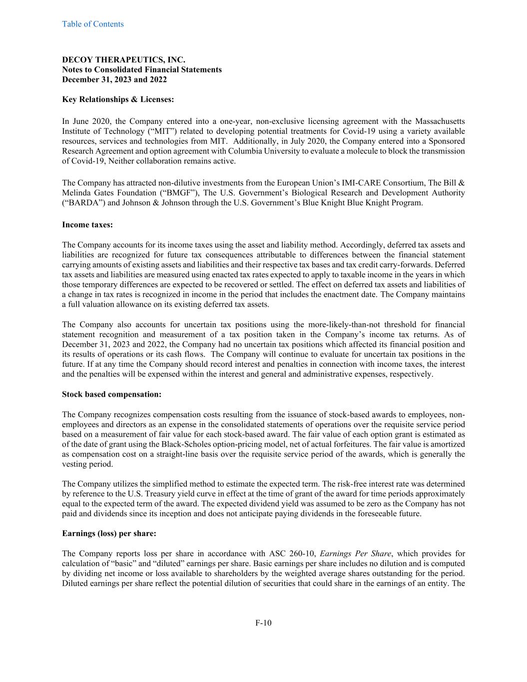 Table of Contents DECOY THERAPEUTICS, INC. Notes to Consolidated Financial Statements December 31, 2023 and 2022 F-10 Key Relationships & Licenses: In June 2020, the Company entered into a one-year, non-exclusive licensing agreement with the Massachusetts Institute of Technology (“MIT”) related to developing potential treatments for Covid-19 using a variety available resources, services and technologies from MIT. Additionally, in July 2020, the Company entered into a Sponsored Research Agreement and option agreement with Columbia University to evaluate a molecule to block the transmission of Covid-19, Neither collaboration remains active. The Company has attracted non-dilutive investments from the European Union’s IMI-CARE Consortium, The Bill & Melinda Gates Foundation (“BMGF”), The U.S. Government’s Biological Research and Development Authority (“BARDA”) and Johnson & Johnson through the U.S. Government’s Blue Knight Blue Knight Program. Income taxes: The Company accounts for its income taxes using the asset and liability method. Accordingly, deferred tax assets and liabilities are recognized for future tax consequences attributable to differences between the financial statement carrying amounts of existing assets and liabilities and their respective tax bases and tax credit carry-forwards. Deferred tax assets and liabilities are measured using enacted tax rates expected to apply to taxable income in the years in which those temporary differences are expected to be recovered or settled. The effect on deferred tax assets and liabilities of a change in tax rates is recognized in income in the period that includes the enactment date. The Company maintains a full valuation allowance on its existing deferred tax assets. The Company also accounts for uncertain tax positions using the more-likely-than-not threshold for financial statement recognition and measurement of a tax position taken in the Company’s income tax returns. As of December 31, 2023 and 2022, the Company had no uncertain tax positions which affected its financial position and its results of operations or its cash flows. The Company will continue to evaluate for uncertain tax positions in the future. If at any time the Company should record interest and penalties in connection with income taxes, the interest and the penalties will be expensed within the interest and general and administrative expenses, respectively. Stock based compensation: The Company recognizes compensation costs resulting from the issuance of stock-based awards to employees, non- employees and directors as an expense in the consolidated statements of operations over the requisite service period based on a measurement of fair value for each stock-based award. The fair value of each option grant is estimated as of the date of grant using the Black-Scholes option-pricing model, net of actual forfeitures. The fair value is amortized as compensation cost on a straight-line basis over the requisite service period of the awards, which is generally the vesting period. The Company utilizes the simplified method to estimate the expected term. The risk-free interest rate was determined by reference to the U.S. Treasury yield curve in effect at the time of grant of the award for time periods approximately equal to the expected term of the award. The expected dividend yield was assumed to be zero as the Company has not paid and dividends since its inception and does not anticipate paying dividends in the foreseeable future. Earnings (loss) per share: The Company reports loss per share in accordance with ASC 260-10, Earnings Per Share, which provides for calculation of “basic” and “diluted” earnings per share. Basic earnings per share includes no dilution and is computed by dividing net income or loss available to shareholders by the weighted average shares outstanding for the period. Diluted earnings per share reflect the potential dilution of securities that could share in the earnings of an entity. The