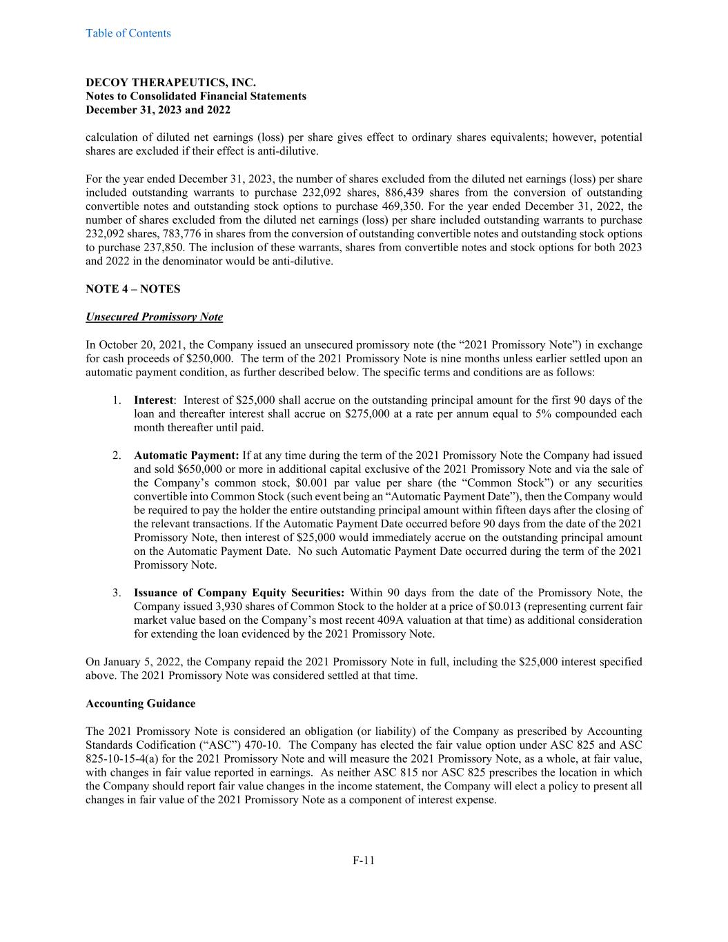 Table of Contents DECOY THERAPEUTICS, INC. Notes to Consolidated Financial Statements December 31, 2023 and 2022 F-11 calculation of diluted net earnings (loss) per share gives effect to ordinary shares equivalents; however, potential shares are excluded if their effect is anti-dilutive. For the year ended December 31, 2023, the number of shares excluded from the diluted net earnings (loss) per share included outstanding warrants to purchase 232,092 shares, 886,439 shares from the conversion of outstanding convertible notes and outstanding stock options to purchase 469,350. For the year ended December 31, 2022, the number of shares excluded from the diluted net earnings (loss) per share included outstanding warrants to purchase 232,092 shares, 783,776 in shares from the conversion of outstanding convertible notes and outstanding stock options to purchase 237,850. The inclusion of these warrants, shares from convertible notes and stock options for both 2023 and 2022 in the denominator would be anti-dilutive. NOTE 4 – NOTES Unsecured Promissory Note In October 20, 2021, the Company issued an unsecured promissory note (the “2021 Promissory Note”) in exchange for cash proceeds of $250,000. The term of the 2021 Promissory Note is nine months unless earlier settled upon an automatic payment condition, as further described below. The specific terms and conditions are as follows: 1. Interest: Interest of $25,000 shall accrue on the outstanding principal amount for the first 90 days of the loan and thereafter interest shall accrue on $275,000 at a rate per annum equal to 5% compounded each month thereafter until paid. 2. Automatic Payment: If at any time during the term of the 2021 Promissory Note the Company had issued and sold $650,000 or more in additional capital exclusive of the 2021 Promissory Note and via the sale of the Company’s common stock, $0.001 par value per share (the “Common Stock”) or any securities convertible into Common Stock (such event being an “Automatic Payment Date”), then the Company would be required to pay the holder the entire outstanding principal amount within fifteen days after the closing of the relevant transactions. If the Automatic Payment Date occurred before 90 days from the date of the 2021 Promissory Note, then interest of $25,000 would immediately accrue on the outstanding principal amount on the Automatic Payment Date. No such Automatic Payment Date occurred during the term of the 2021 Promissory Note. 3. Issuance of Company Equity Securities: Within 90 days from the date of the Promissory Note, the Company issued 3,930 shares of Common Stock to the holder at a price of $0.013 (representing current fair market value based on the Company’s most recent 409A valuation at that time) as additional consideration for extending the loan evidenced by the 2021 Promissory Note. On January 5, 2022, the Company repaid the 2021 Promissory Note in full, including the $25,000 interest specified above. The 2021 Promissory Note was considered settled at that time. Accounting Guidance The 2021 Promissory Note is considered an obligation (or liability) of the Company as prescribed by Accounting Standards Codification (“ASC”) 470-10. The Company has elected the fair value option under ASC 825 and ASC 825-10-15-4(a) for the 2021 Promissory Note and will measure the 2021 Promissory Note, as a whole, at fair value, with changes in fair value reported in earnings. As neither ASC 815 nor ASC 825 prescribes the location in which the Company should report fair value changes in the income statement, the Company will elect a policy to present all changes in fair value of the 2021 Promissory Note as a component of interest expense.