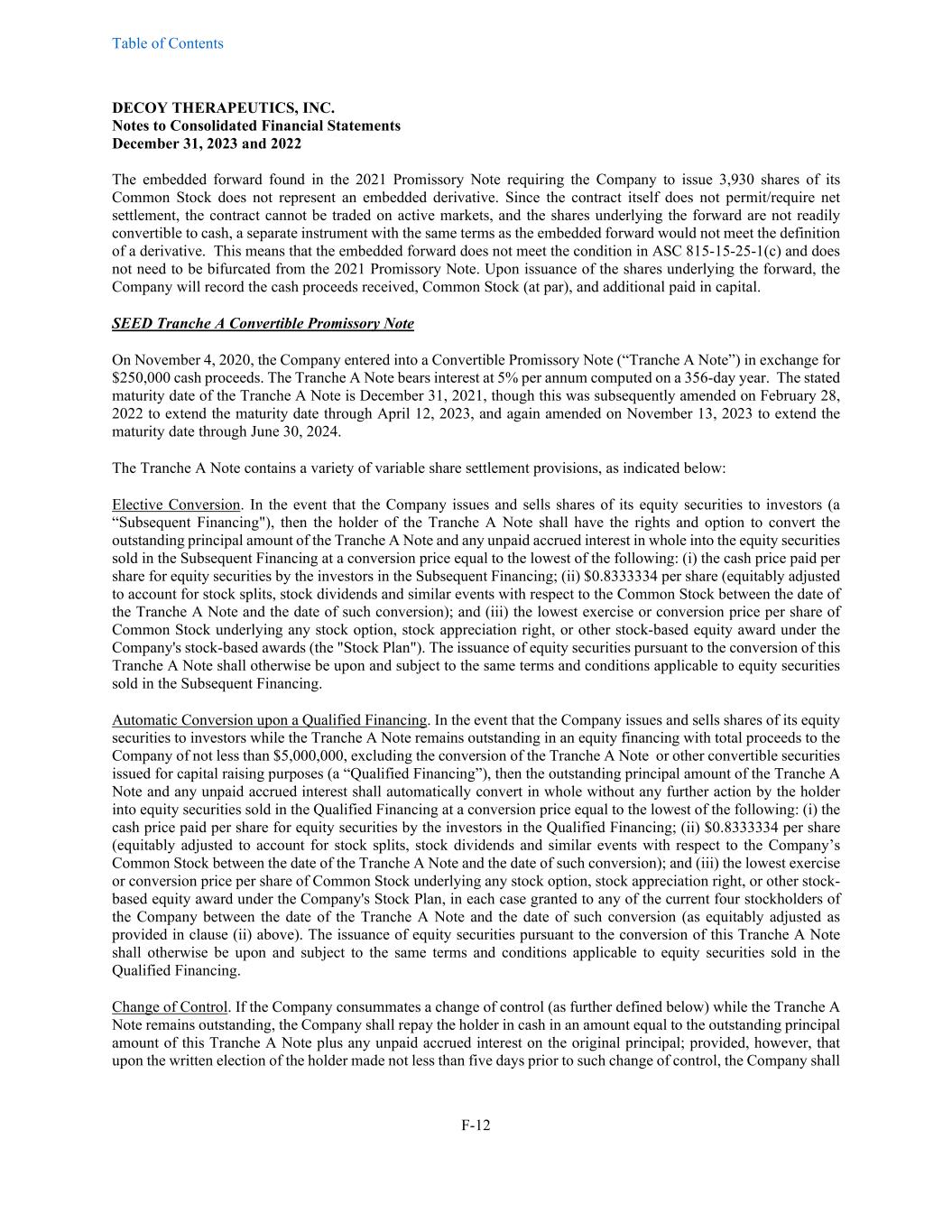 Table of Contents DECOY THERAPEUTICS, INC. Notes to Consolidated Financial Statements December 31, 2023 and 2022 F-12 The embedded forward found in the 2021 Promissory Note requiring the Company to issue 3,930 shares of its Common Stock does not represent an embedded derivative. Since the contract itself does not permit/require net settlement, the contract cannot be traded on active markets, and the shares underlying the forward are not readily convertible to cash, a separate instrument with the same terms as the embedded forward would not meet the definition of a derivative. This means that the embedded forward does not meet the condition in ASC 815-15-25-1(c) and does not need to be bifurcated from the 2021 Promissory Note. Upon issuance of the shares underlying the forward, the Company will record the cash proceeds received, Common Stock (at par), and additional paid in capital. SEED Tranche A Convertible Promissory Note On November 4, 2020, the Company entered into a Convertible Promissory Note (“Tranche A Note”) in exchange for $250,000 cash proceeds. The Tranche A Note bears interest at 5% per annum computed on a 356-day year. The stated maturity date of the Tranche A Note is December 31, 2021, though this was subsequently amended on February 28, 2022 to extend the maturity date through April 12, 2023, and again amended on November 13, 2023 to extend the maturity date through June 30, 2024. The Tranche A Note contains a variety of variable share settlement provisions, as indicated below: Elective Conversion. In the event that the Company issues and sells shares of its equity securities to investors (a “Subsequent Financing"), then the holder of the Tranche A Note shall have the rights and option to convert the outstanding principal amount of the Tranche A Note and any unpaid accrued interest in whole into the equity securities sold in the Subsequent Financing at a conversion price equal to the lowest of the following: (i) the cash price paid per share for equity securities by the investors in the Subsequent Financing; (ii) $0.8333334 per share (equitably adjusted to account for stock splits, stock dividends and similar events with respect to the Common Stock between the date of the Tranche A Note and the date of such conversion); and (iii) the lowest exercise or conversion price per share of Common Stock underlying any stock option, stock appreciation right, or other stock-based equity award under the Company's stock-based awards (the "Stock Plan"). The issuance of equity securities pursuant to the conversion of this Tranche A Note shall otherwise be upon and subject to the same terms and conditions applicable to equity securities sold in the Subsequent Financing. Automatic Conversion upon a Qualified Financing. In the event that the Company issues and sells shares of its equity securities to investors while the Tranche A Note remains outstanding in an equity financing with total proceeds to the Company of not less than $5,000,000, excluding the conversion of the Tranche A Note or other convertible securities issued for capital raising purposes (a “Qualified Financing”), then the outstanding principal amount of the Tranche A Note and any unpaid accrued interest shall automatically convert in whole without any further action by the holder into equity securities sold in the Qualified Financing at a conversion price equal to the lowest of the following: (i) the cash price paid per share for equity securities by the investors in the Qualified Financing; (ii) $0.8333334 per share (equitably adjusted to account for stock splits, stock dividends and similar events with respect to the Company’s Common Stock between the date of the Tranche A Note and the date of such conversion); and (iii) the lowest exercise or conversion price per share of Common Stock underlying any stock option, stock appreciation right, or other stock- based equity award under the Company's Stock Plan, in each case granted to any of the current four stockholders of the Company between the date of the Tranche A Note and the date of such conversion (as equitably adjusted as provided in clause (ii) above). The issuance of equity securities pursuant to the conversion of this Tranche A Note shall otherwise be upon and subject to the same terms and conditions applicable to equity securities sold in the Qualified Financing. Change of Control. If the Company consummates a change of control (as further defined below) while the Tranche A Note remains outstanding, the Company shall repay the holder in cash in an amount equal to the outstanding principal amount of this Tranche A Note plus any unpaid accrued interest on the original principal; provided, however, that upon the written election of the holder made not less than five days prior to such change of control, the Company shall
