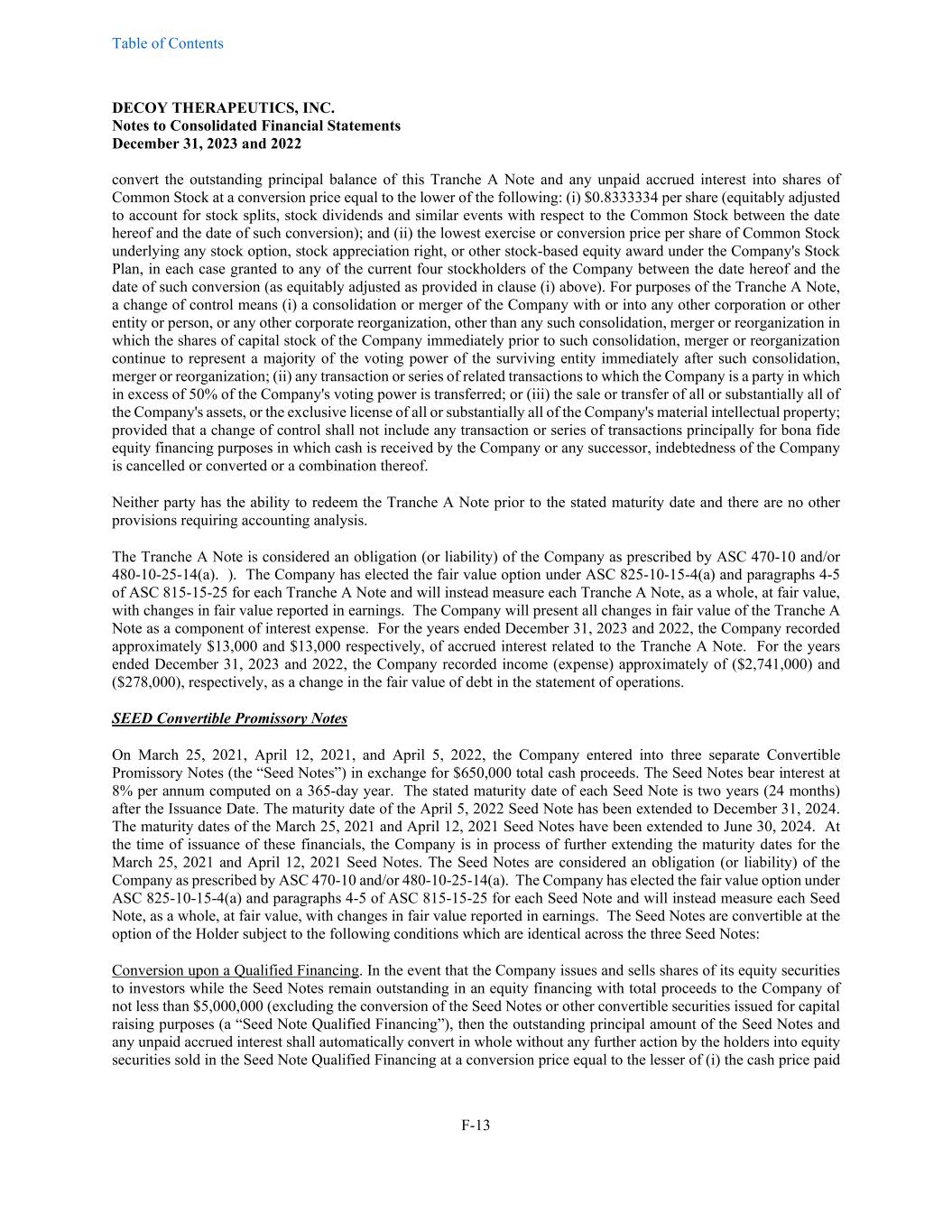 Table of Contents DECOY THERAPEUTICS, INC. Notes to Consolidated Financial Statements December 31, 2023 and 2022 F-13 convert the outstanding principal balance of this Tranche A Note and any unpaid accrued interest into shares of Common Stock at a conversion price equal to the lower of the following: (i) $0.8333334 per share (equitably adjusted to account for stock splits, stock dividends and similar events with respect to the Common Stock between the date hereof and the date of such conversion); and (ii) the lowest exercise or conversion price per share of Common Stock underlying any stock option, stock appreciation right, or other stock-based equity award under the Company's Stock Plan, in each case granted to any of the current four stockholders of the Company between the date hereof and the date of such conversion (as equitably adjusted as provided in clause (i) above). For purposes of the Tranche A Note, a change of control means (i) a consolidation or merger of the Company with or into any other corporation or other entity or person, or any other corporate reorganization, other than any such consolidation, merger or reorganization in which the shares of capital stock of the Company immediately prior to such consolidation, merger or reorganization continue to represent a majority of the voting power of the surviving entity immediately after such consolidation, merger or reorganization; (ii) any transaction or series of related transactions to which the Company is a party in which in excess of 50% of the Company's voting power is transferred; or (iii) the sale or transfer of all or substantially all of the Company's assets, or the exclusive license of all or substantially all of the Company's material intellectual property; provided that a change of control shall not include any transaction or series of transactions principally for bona fide equity financing purposes in which cash is received by the Company or any successor, indebtedness of the Company is cancelled or converted or a combination thereof. Neither party has the ability to redeem the Tranche A Note prior to the stated maturity date and there are no other provisions requiring accounting analysis. The Tranche A Note is considered an obligation (or liability) of the Company as prescribed by ASC 470-10 and/or 480-10-25-14(a). ). The Company has elected the fair value option under ASC 825-10-15-4(a) and paragraphs 4-5 of ASC 815-15-25 for each Tranche A Note and will instead measure each Tranche A Note, as a whole, at fair value, with changes in fair value reported in earnings. The Company will present all changes in fair value of the Tranche A Note as a component of interest expense. For the years ended December 31, 2023 and 2022, the Company recorded approximately $13,000 and $13,000 respectively, of accrued interest related to the Tranche A Note. For the years ended December 31, 2023 and 2022, the Company recorded income (expense) approximately of ($2,741,000) and ($278,000), respectively, as a change in the fair value of debt in the statement of operations. SEED Convertible Promissory Notes On March 25, 2021, April 12, 2021, and April 5, 2022, the Company entered into three separate Convertible Promissory Notes (the “Seed Notes”) in exchange for $650,000 total cash proceeds. The Seed Notes bear interest at 8% per annum computed on a 365-day year. The stated maturity date of each Seed Note is two years (24 months) after the Issuance Date. The maturity date of the April 5, 2022 Seed Note has been extended to December 31, 2024. The maturity dates of the March 25, 2021 and April 12, 2021 Seed Notes have been extended to June 30, 2024. At the time of issuance of these financials, the Company is in process of further extending the maturity dates for the March 25, 2021 and April 12, 2021 Seed Notes. The Seed Notes are considered an obligation (or liability) of the Company as prescribed by ASC 470-10 and/or 480-10-25-14(a). The Company has elected the fair value option under ASC 825-10-15-4(a) and paragraphs 4-5 of ASC 815-15-25 for each Seed Note and will instead measure each Seed Note, as a whole, at fair value, with changes in fair value reported in earnings. The Seed Notes are convertible at the option of the Holder subject to the following conditions which are identical across the three Seed Notes: Conversion upon a Qualified Financing. In the event that the Company issues and sells shares of its equity securities to investors while the Seed Notes remain outstanding in an equity financing with total proceeds to the Company of not less than $5,000,000 (excluding the conversion of the Seed Notes or other convertible securities issued for capital raising purposes (a “Seed Note Qualified Financing”), then the outstanding principal amount of the Seed Notes and any unpaid accrued interest shall automatically convert in whole without any further action by the holders into equity securities sold in the Seed Note Qualified Financing at a conversion price equal to the lesser of (i) the cash price paid