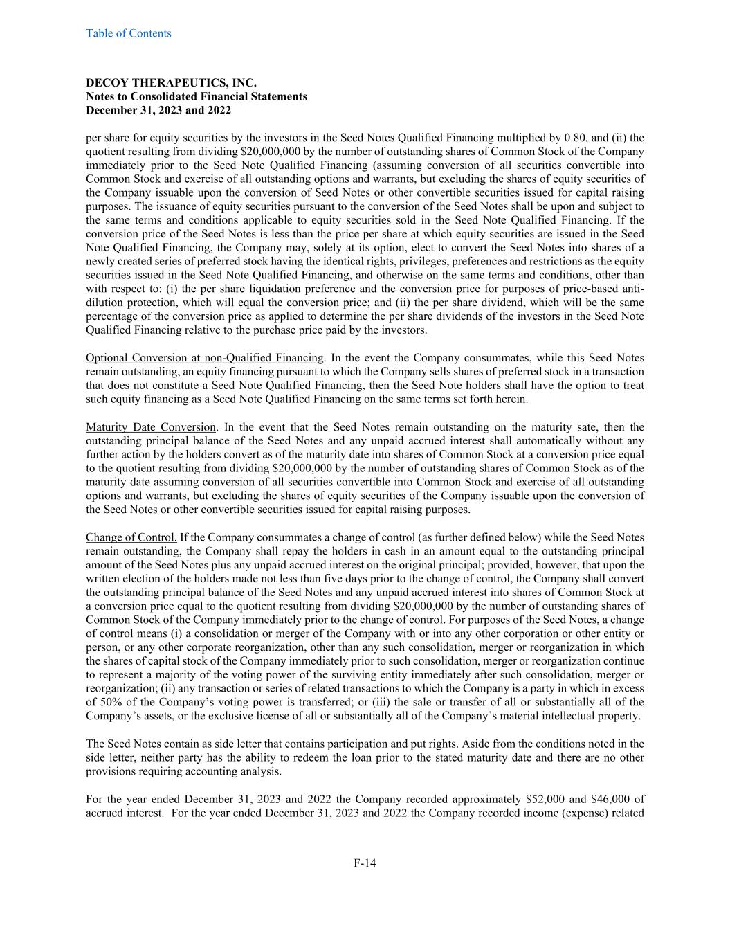 Table of Contents DECOY THERAPEUTICS, INC. Notes to Consolidated Financial Statements December 31, 2023 and 2022 F-14 per share for equity securities by the investors in the Seed Notes Qualified Financing multiplied by 0.80, and (ii) the quotient resulting from dividing $20,000,000 by the number of outstanding shares of Common Stock of the Company immediately prior to the Seed Note Qualified Financing (assuming conversion of all securities convertible into Common Stock and exercise of all outstanding options and warrants, but excluding the shares of equity securities of the Company issuable upon the conversion of Seed Notes or other convertible securities issued for capital raising purposes. The issuance of equity securities pursuant to the conversion of the Seed Notes shall be upon and subject to the same terms and conditions applicable to equity securities sold in the Seed Note Qualified Financing. If the conversion price of the Seed Notes is less than the price per share at which equity securities are issued in the Seed Note Qualified Financing, the Company may, solely at its option, elect to convert the Seed Notes into shares of a newly created series of preferred stock having the identical rights, privileges, preferences and restrictions as the equity securities issued in the Seed Note Qualified Financing, and otherwise on the same terms and conditions, other than with respect to: (i) the per share liquidation preference and the conversion price for purposes of price-based anti- dilution protection, which will equal the conversion price; and (ii) the per share dividend, which will be the same percentage of the conversion price as applied to determine the per share dividends of the investors in the Seed Note Qualified Financing relative to the purchase price paid by the investors. Optional Conversion at non-Qualified Financing. In the event the Company consummates, while this Seed Notes remain outstanding, an equity financing pursuant to which the Company sells shares of preferred stock in a transaction that does not constitute a Seed Note Qualified Financing, then the Seed Note holders shall have the option to treat such equity financing as a Seed Note Qualified Financing on the same terms set forth herein. Maturity Date Conversion. In the event that the Seed Notes remain outstanding on the maturity sate, then the outstanding principal balance of the Seed Notes and any unpaid accrued interest shall automatically without any further action by the holders convert as of the maturity date into shares of Common Stock at a conversion price equal to the quotient resulting from dividing $20,000,000 by the number of outstanding shares of Common Stock as of the maturity date assuming conversion of all securities convertible into Common Stock and exercise of all outstanding options and warrants, but excluding the shares of equity securities of the Company issuable upon the conversion of the Seed Notes or other convertible securities issued for capital raising purposes. Change of Control. If the Company consummates a change of control (as further defined below) while the Seed Notes remain outstanding, the Company shall repay the holders in cash in an amount equal to the outstanding principal amount of the Seed Notes plus any unpaid accrued interest on the original principal; provided, however, that upon the written election of the holders made not less than five days prior to the change of control, the Company shall convert the outstanding principal balance of the Seed Notes and any unpaid accrued interest into shares of Common Stock at a conversion price equal to the quotient resulting from dividing $20,000,000 by the number of outstanding shares of Common Stock of the Company immediately prior to the change of control. For purposes of the Seed Notes, a change of control means (i) a consolidation or merger of the Company with or into any other corporation or other entity or person, or any other corporate reorganization, other than any such consolidation, merger or reorganization in which the shares of capital stock of the Company immediately prior to such consolidation, merger or reorganization continue to represent a majority of the voting power of the surviving entity immediately after such consolidation, merger or reorganization; (ii) any transaction or series of related transactions to which the Company is a party in which in excess of 50% of the Company’s voting power is transferred; or (iii) the sale or transfer of all or substantially all of the Company’s assets, or the exclusive license of all or substantially all of the Company’s material intellectual property. The Seed Notes contain as side letter that contains participation and put rights. Aside from the conditions noted in the side letter, neither party has the ability to redeem the loan prior to the stated maturity date and there are no other provisions requiring accounting analysis. For the year ended December 31, 2023 and 2022 the Company recorded approximately $52,000 and $46,000 of accrued interest. For the year ended December 31, 2023 and 2022 the Company recorded income (expense) related