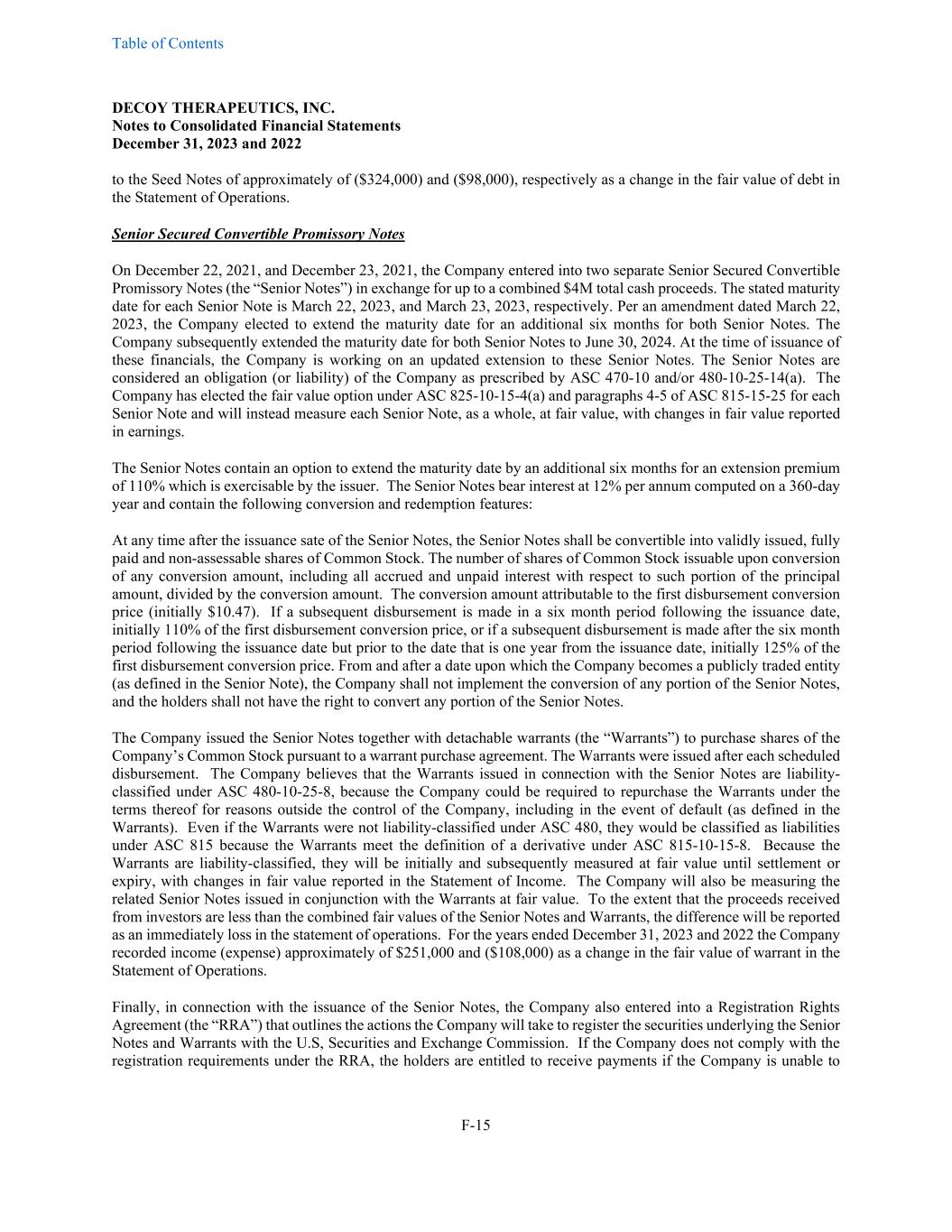 Table of Contents DECOY THERAPEUTICS, INC. Notes to Consolidated Financial Statements December 31, 2023 and 2022 F-15 to the Seed Notes of approximately of ($324,000) and ($98,000), respectively as a change in the fair value of debt in the Statement of Operations. Senior Secured Convertible Promissory Notes On December 22, 2021, and December 23, 2021, the Company entered into two separate Senior Secured Convertible Promissory Notes (the “Senior Notes”) in exchange for up to a combined $4M total cash proceeds. The stated maturity date for each Senior Note is March 22, 2023, and March 23, 2023, respectively. Per an amendment dated March 22, 2023, the Company elected to extend the maturity date for an additional six months for both Senior Notes. The Company subsequently extended the maturity date for both Senior Notes to June 30, 2024. At the time of issuance of these financials, the Company is working on an updated extension to these Senior Notes. The Senior Notes are considered an obligation (or liability) of the Company as prescribed by ASC 470-10 and/or 480-10-25-14(a). The Company has elected the fair value option under ASC 825-10-15-4(a) and paragraphs 4-5 of ASC 815-15-25 for each Senior Note and will instead measure each Senior Note, as a whole, at fair value, with changes in fair value reported in earnings. The Senior Notes contain an option to extend the maturity date by an additional six months for an extension premium of 110% which is exercisable by the issuer. The Senior Notes bear interest at 12% per annum computed on a 360-day year and contain the following conversion and redemption features: At any time after the issuance sate of the Senior Notes, the Senior Notes shall be convertible into validly issued, fully paid and non-assessable shares of Common Stock. The number of shares of Common Stock issuable upon conversion of any conversion amount, including all accrued and unpaid interest with respect to such portion of the principal amount, divided by the conversion amount. The conversion amount attributable to the first disbursement conversion price (initially $10.47). If a subsequent disbursement is made in a six month period following the issuance date, initially 110% of the first disbursement conversion price, or if a subsequent disbursement is made after the six month period following the issuance date but prior to the date that is one year from the issuance date, initially 125% of the first disbursement conversion price. From and after a date upon which the Company becomes a publicly traded entity (as defined in the Senior Note), the Company shall not implement the conversion of any portion of the Senior Notes, and the holders shall not have the right to convert any portion of the Senior Notes. The Company issued the Senior Notes together with detachable warrants (the “Warrants”) to purchase shares of the Company’s Common Stock pursuant to a warrant purchase agreement. The Warrants were issued after each scheduled disbursement. The Company believes that the Warrants issued in connection with the Senior Notes are liability- classified under ASC 480-10-25-8, because the Company could be required to repurchase the Warrants under the terms thereof for reasons outside the control of the Company, including in the event of default (as defined in the Warrants). Even if the Warrants were not liability-classified under ASC 480, they would be classified as liabilities under ASC 815 because the Warrants meet the definition of a derivative under ASC 815-10-15-8. Because the Warrants are liability-classified, they will be initially and subsequently measured at fair value until settlement or expiry, with changes in fair value reported in the Statement of Income. The Company will also be measuring the related Senior Notes issued in conjunction with the Warrants at fair value. To the extent that the proceeds received from investors are less than the combined fair values of the Senior Notes and Warrants, the difference will be reported as an immediately loss in the statement of operations. For the years ended December 31, 2023 and 2022 the Company recorded income (expense) approximately of $251,000 and ($108,000) as a change in the fair value of warrant in the Statement of Operations. Finally, in connection with the issuance of the Senior Notes, the Company also entered into a Registration Rights Agreement (the “RRA”) that outlines the actions the Company will take to register the securities underlying the Senior Notes and Warrants with the U.S, Securities and Exchange Commission. If the Company does not comply with the registration requirements under the RRA, the holders are entitled to receive payments if the Company is unable to