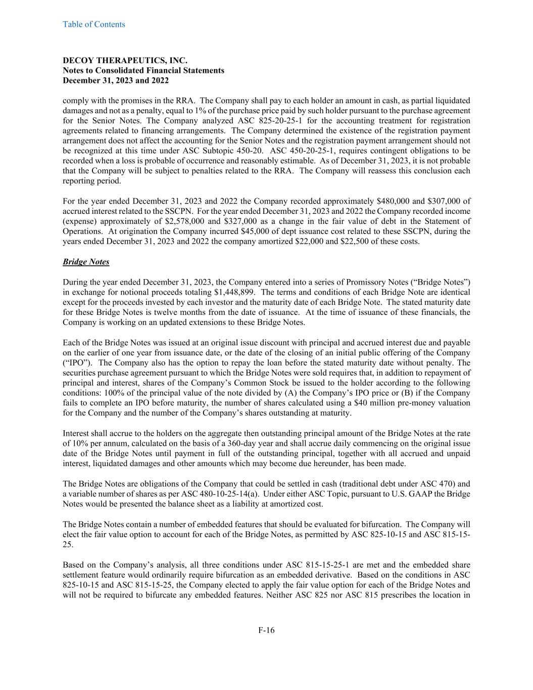 Table of Contents DECOY THERAPEUTICS, INC. Notes to Consolidated Financial Statements December 31, 2023 and 2022 F-16 comply with the promises in the RRA. The Company shall pay to each holder an amount in cash, as partial liquidated damages and not as a penalty, equal to 1% of the purchase price paid by such holder pursuant to the purchase agreement for the Senior Notes. The Company analyzed ASC 825-20-25-1 for the accounting treatment for registration agreements related to financing arrangements. The Company determined the existence of the registration payment arrangement does not affect the accounting for the Senior Notes and the registration payment arrangement should not be recognized at this time under ASC Subtopic 450-20. ASC 450-20-25-1, requires contingent obligations to be recorded when a loss is probable of occurrence and reasonably estimable. As of December 31, 2023, it is not probable that the Company will be subject to penalties related to the RRA. The Company will reassess this conclusion each reporting period. For the year ended December 31, 2023 and 2022 the Company recorded approximately $480,000 and $307,000 of accrued interest related to the SSCPN. For the year ended December 31, 2023 and 2022 the Company recorded income (expense) approximately of $2,578,000 and $327,000 as a change in the fair value of debt in the Statement of Operations. At origination the Company incurred $45,000 of dept issuance cost related to these SSCPN, during the years ended December 31, 2023 and 2022 the company amortized $22,000 and $22,500 of these costs. Bridge Notes During the year ended December 31, 2023, the Company entered into a series of Promissory Notes (“Bridge Notes”) in exchange for notional proceeds totaling $1,448,899. The terms and conditions of each Bridge Note are identical except for the proceeds invested by each investor and the maturity date of each Bridge Note. The stated maturity date for these Bridge Notes is twelve months from the date of issuance. At the time of issuance of these financials, the Company is working on an updated extensions to these Bridge Notes. Each of the Bridge Notes was issued at an original issue discount with principal and accrued interest due and payable on the earlier of one year from issuance date, or the date of the closing of an initial public offering of the Company (“IPO”). The Company also has the option to repay the loan before the stated maturity date without penalty. The securities purchase agreement pursuant to which the Bridge Notes were sold requires that, in addition to repayment of principal and interest, shares of the Company’s Common Stock be issued to the holder according to the following conditions: 100% of the principal value of the note divided by (A) the Company’s IPO price or (B) if the Company fails to complete an IPO before maturity, the number of shares calculated using a $40 million pre-money valuation for the Company and the number of the Company’s shares outstanding at maturity. Interest shall accrue to the holders on the aggregate then outstanding principal amount of the Bridge Notes at the rate of 10% per annum, calculated on the basis of a 360-day year and shall accrue daily commencing on the original issue date of the Bridge Notes until payment in full of the outstanding principal, together with all accrued and unpaid interest, liquidated damages and other amounts which may become due hereunder, has been made. The Bridge Notes are obligations of the Company that could be settled in cash (traditional debt under ASC 470) and a variable number of shares as per ASC 480-10-25-14(a). Under either ASC Topic, pursuant to U.S. GAAP the Bridge Notes would be presented the balance sheet as a liability at amortized cost. The Bridge Notes contain a number of embedded features that should be evaluated for bifurcation. The Company will elect the fair value option to account for each of the Bridge Notes, as permitted by ASC 825-10-15 and ASC 815-15- 25. Based on the Company’s analysis, all three conditions under ASC 815-15-25-1 are met and the embedded share settlement feature would ordinarily require bifurcation as an embedded derivative. Based on the conditions in ASC 825-10-15 and ASC 815-15-25, the Company elected to apply the fair value option for each of the Bridge Notes and will not be required to bifurcate any embedded features. Neither ASC 825 nor ASC 815 prescribes the location in