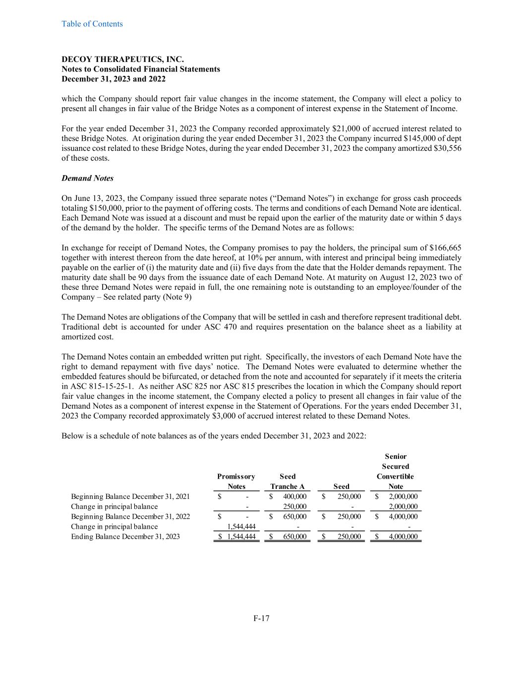 Table of Contents DECOY THERAPEUTICS, INC. Notes to Consolidated Financial Statements December 31, 2023 and 2022 F-17 which the Company should report fair value changes in the income statement, the Company will elect a policy to present all changes in fair value of the Bridge Notes as a component of interest expense in the Statement of Income. For the year ended December 31, 2023 the Company recorded approximately $21,000 of accrued interest related to these Bridge Notes. At origination during the year ended December 31, 2023 the Company incurred $145,000 of dept issuance cost related to these Bridge Notes, during the year ended December 31, 2023 the company amortized $30,556 of these costs. Demand Notes On June 13, 2023, the Company issued three separate notes (“Demand Notes”) in exchange for gross cash proceeds totaling $150,000, prior to the payment of offering costs. The terms and conditions of each Demand Note are identical. Each Demand Note was issued at a discount and must be repaid upon the earlier of the maturity date or within 5 days of the demand by the holder. The specific terms of the Demand Notes are as follows: In exchange for receipt of Demand Notes, the Company promises to pay the holders, the principal sum of $166,665 together with interest thereon from the date hereof, at 10% per annum, with interest and principal being immediately payable on the earlier of (i) the maturity date and (ii) five days from the date that the Holder demands repayment. The maturity date shall be 90 days from the issuance date of each Demand Note. At maturity on August 12, 2023 two of these three Demand Notes were repaid in full, the one remaining note is outstanding to an employee/founder of the Company – See related party (Note 9) The Demand Notes are obligations of the Company that will be settled in cash and therefore represent traditional debt. Traditional debt is accounted for under ASC 470 and requires presentation on the balance sheet as a liability at amortized cost. The Demand Notes contain an embedded written put right. Specifically, the investors of each Demand Note have the right to demand repayment with five days’ notice. The Demand Notes were evaluated to determine whether the embedded features should be bifurcated, or detached from the note and accounted for separately if it meets the criteria in ASC 815-15-25-1. As neither ASC 825 nor ASC 815 prescribes the location in which the Company should report fair value changes in the income statement, the Company elected a policy to present all changes in fair value of the Demand Notes as a component of interest expense in the Statement of Operations. For the years ended December 31, 2023 the Company recorded approximately $3,000 of accrued interest related to these Demand Notes. Below is a schedule of note balances as of the years ended December 31, 2023 and 2022: Senior Secured Promissory Seed Convertible Notes Tranche A Seed Note Beginning Balance December 31, 2021 -$ 400,000$ 250,000$ 2,000,000$ Change in principal balance - 250,000 - 2,000,000 Beginning Balance December 31, 2022 -$ 650,000$ 250,000$ 4,000,000$ Change in principal balance 1,544,444 - - - Ending Balance December 31, 2023 1,544,444$ 650,000$ 250,000$ 4,000,000$