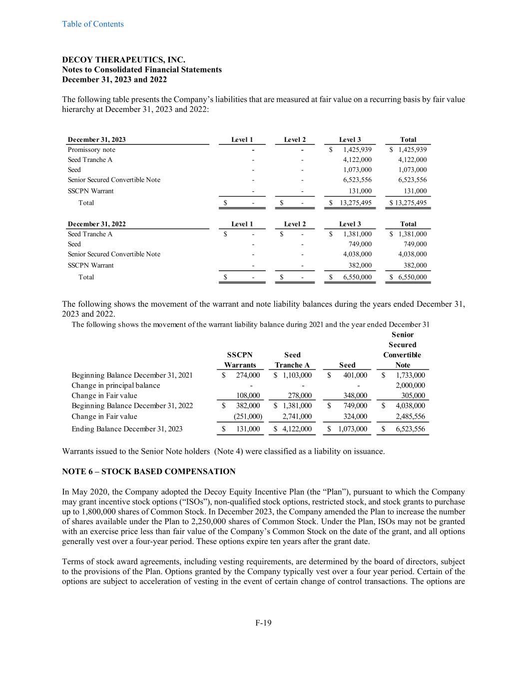 Table of Contents DECOY THERAPEUTICS, INC. Notes to Consolidated Financial Statements December 31, 2023 and 2022 F-19 The following table presents the Company’s liabilities that are measured at fair value on a recurring basis by fair value hierarchy at December 31, 2023 and 2022: December 31, 2023 Level 1 Level 2 Level 3 Total Promissory note - - 1,425,939$ 1,425,939$ Seed Tranche A - - 4,122,000 4,122,000 Seed - - 1,073,000 1,073,000 Senior Secured Convertible Note - - 6,523,556 6,523,556 SSCPN Warrant - - 131,000 131,000 Total -$ -$ 13,275,495$ 13,275,495$ December 31, 2022 Level 1 Level 2 Level 3 Total Seed Tranche A -$ -$ 1,381,000$ 1,381,000$ Seed - - 749,000 749,000 Senior Secured Convertible Note - - 4,038,000 4,038,000 SSCPN Warrant - - 382,000 382,000 Total -$ -$ 6,550,000$ 6,550,000$ The following shows the movement of the warrant and note liability balances during the years ended December 31, 2023 and 2022. The following shows the movement of the warrant liability balance during 2021 and the year ended December 31 Senior Secured SSCPN Seed Convertible Warrants Tranche A Seed Note Beginning Balance December 31, 2021 274,000$ 1,103,000$ 401,000$ 1,733,000$ Change in principal balance - - - 2,000,000 Change in Fair value 108,000 278,000 348,000 305,000 Beginning Balance December 31, 2022 382,000$ 1,381,000$ 749,000$ 4,038,000$ Change in Fair value (251,000) 2,741,000 324,000 2,485,556 Ending Balance December 31, 2023 131,000$ 4,122,000$ 1,073,000$ 6,523,556$ Warrants issued to the Senior Note holders (Note 4) were classified as a liability on issuance. NOTE 6 – STOCK BASED COMPENSATION In May 2020, the Company adopted the Decoy Equity Incentive Plan (the “Plan”), pursuant to which the Company may grant incentive stock options (“ISOs”), non-qualified stock options, restricted stock, and stock grants to purchase up to 1,800,000 shares of Common Stock. In December 2023, the Company amended the Plan to increase the number of shares available under the Plan to 2,250,000 shares of Common Stock. Under the Plan, ISOs may not be granted with an exercise price less than fair value of the Company’s Common Stock on the date of the grant, and all options generally vest over a four-year period. These options expire ten years after the grant date. Terms of stock award agreements, including vesting requirements, are determined by the board of directors, subject to the provisions of the Plan. Options granted by the Company typically vest over a four year period. Certain of the options are subject to acceleration of vesting in the event of certain change of control transactions. The options are