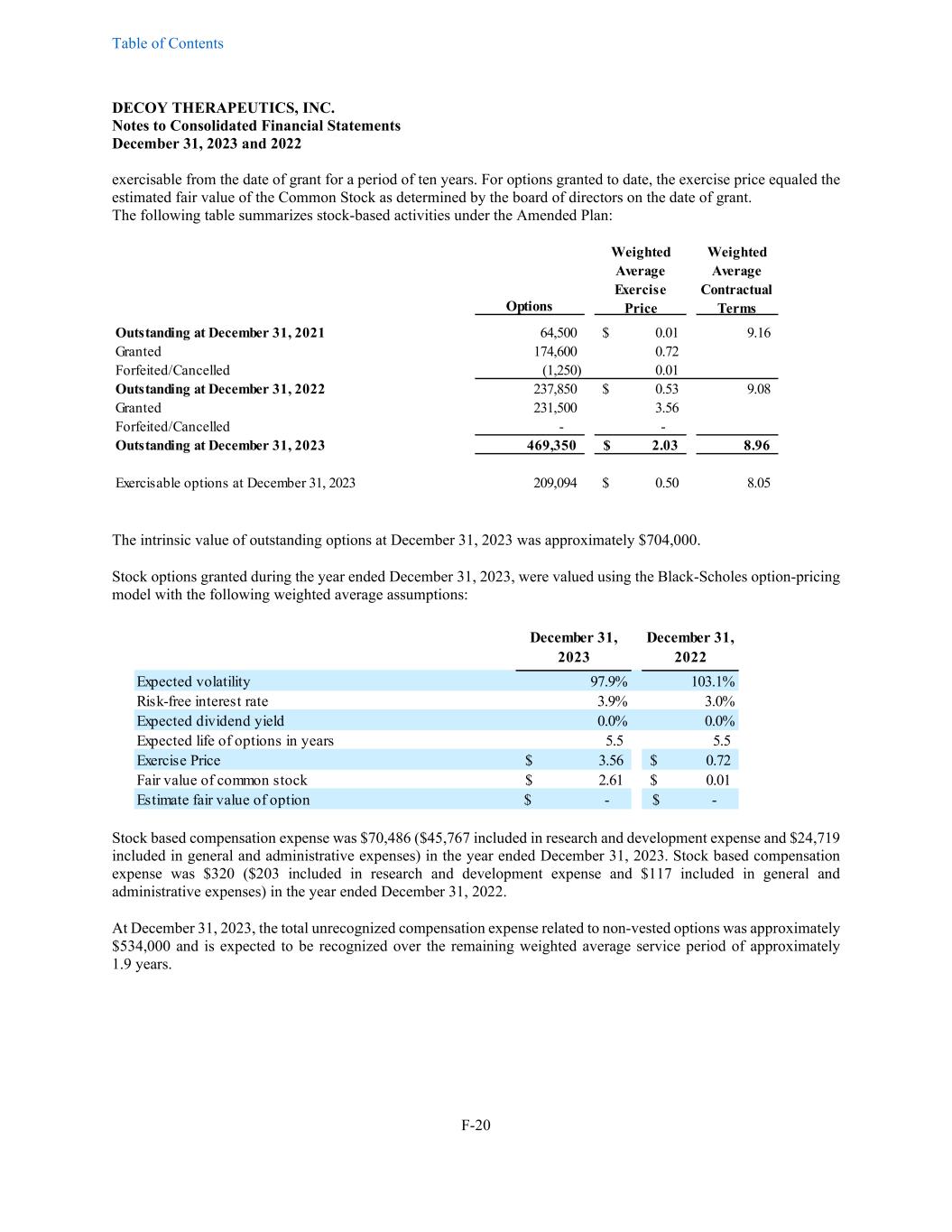 Table of Contents DECOY THERAPEUTICS, INC. Notes to Consolidated Financial Statements December 31, 2023 and 2022 F-20 exercisable from the date of grant for a period of ten years. For options granted to date, the exercise price equaled the estimated fair value of the Common Stock as determined by the board of directors on the date of grant. The following table summarizes stock-based activities under the Amended Plan: Options Weighted Average Exercise Price Weighted Average Contractual Terms Outstanding at December 31, 2021 64,500 0.01$ 9.16 Granted 174,600 0.72 Forfeited/Cancelled (1,250) 0.01 Outstanding at December 31, 2022 237,850 0.53$ 9.08 Granted 231,500 3.56 Forfeited/Cancelled - - Outstanding at December 31, 2023 469,350 2.03$ 8.96 Exercisable options at December 31, 2023 209,094 0.50$ 8.05 The intrinsic value of outstanding options at December 31, 2023 was approximately $704,000. Stock options granted during the year ended December 31, 2023, were valued using the Black-Scholes option-pricing model with the following weighted average assumptions: December 31, 2023 December 31, 2022 Expected volatility 97.9% 103.1% Risk-free interest rate 3.9% 3.0% Expected dividend yield 0.0% 0.0% Expected life of options in years 5.5 5.5 Exercise Price 3.56$ 0.72$ Fair value of common stock 2.61$ 0.01$ Estimate fair value of option -$ -$ Stock based compensation expense was $70,486 ($45,767 included in research and development expense and $24,719 included in general and administrative expenses) in the year ended December 31, 2023. Stock based compensation expense was $320 ($203 included in research and development expense and $117 included in general and administrative expenses) in the year ended December 31, 2022. At December 31, 2023, the total unrecognized compensation expense related to non-vested options was approximately $534,000 and is expected to be recognized over the remaining weighted average service period of approximately 1.9 years.
