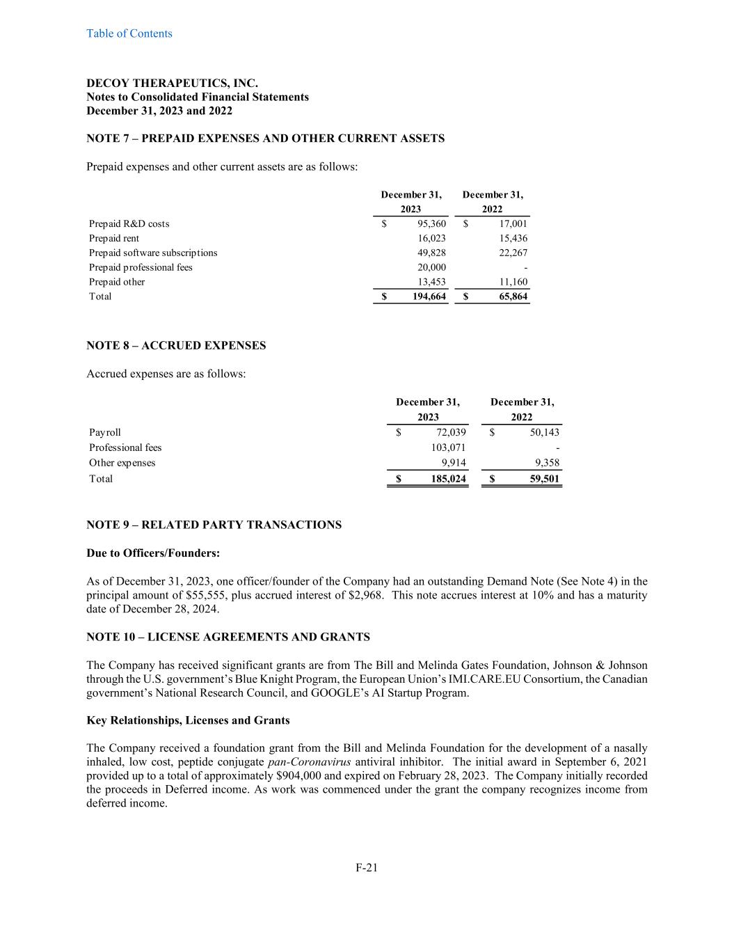 Table of Contents DECOY THERAPEUTICS, INC. Notes to Consolidated Financial Statements December 31, 2023 and 2022 F-21 NOTE 7 – PREPAID EXPENSES AND OTHER CURRENT ASSETS Prepaid expenses and other current assets are as follows: December 31, December 31, 2023 2022 Prepaid R&D costs $ 95,360 $ 17,001 Prepaid rent 16,023 15,436 Prepaid software subscriptions 49,828 22,267 Prepaid professional fees 20,000 - Prepaid other 13,453 11,160 Total $ 194,664 $ 65,864 NOTE 8 – ACCRUED EXPENSES Accrued expenses are as follows: December 31, December 31, 2023 2022 Payroll $ 72,039 $ 50,143 Professional fees 103,071 - Other expenses 9,914 9,358 Total $ 185,024 $ 59,501 NOTE 9 – RELATED PARTY TRANSACTIONS Due to Officers/Founders: As of December 31, 2023, one officer/founder of the Company had an outstanding Demand Note (See Note 4) in the principal amount of $55,555, plus accrued interest of $2,968. This note accrues interest at 10% and has a maturity date of December 28, 2024. NOTE 10 – LICENSE AGREEMENTS AND GRANTS The Company has received significant grants are from The Bill and Melinda Gates Foundation, Johnson & Johnson through the U.S. government’s Blue Knight Program, the European Union’s IMI.CARE.EU Consortium, the Canadian government’s National Research Council, and GOOGLE’s AI Startup Program. Key Relationships, Licenses and Grants The Company received a foundation grant from the Bill and Melinda Foundation for the development of a nasally inhaled, low cost, peptide conjugate pan-Coronavirus antiviral inhibitor. The initial award in September 6, 2021 provided up to a total of approximately $904,000 and expired on February 28, 2023. The Company initially recorded the proceeds in Deferred income. As work was commenced under the grant the company recognizes income from deferred income.