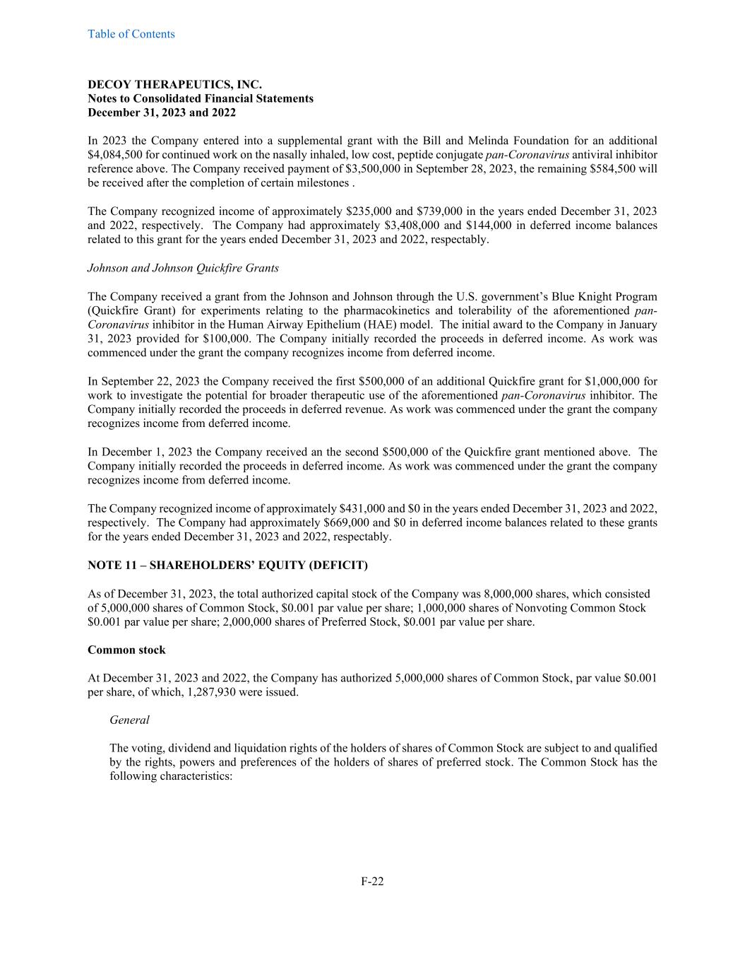 Table of Contents DECOY THERAPEUTICS, INC. Notes to Consolidated Financial Statements December 31, 2023 and 2022 F-22 In 2023 the Company entered into a supplemental grant with the Bill and Melinda Foundation for an additional $4,084,500 for continued work on the nasally inhaled, low cost, peptide conjugate pan-Coronavirus antiviral inhibitor reference above. The Company received payment of $3,500,000 in September 28, 2023, the remaining $584,500 will be received after the completion of certain milestones . The Company recognized income of approximately $235,000 and $739,000 in the years ended December 31, 2023 and 2022, respectively. The Company had approximately $3,408,000 and $144,000 in deferred income balances related to this grant for the years ended December 31, 2023 and 2022, respectably. Johnson and Johnson Quickfire Grants The Company received a grant from the Johnson and Johnson through the U.S. government’s Blue Knight Program (Quickfire Grant) for experiments relating to the pharmacokinetics and tolerability of the aforementioned pan- Coronavirus inhibitor in the Human Airway Epithelium (HAE) model. The initial award to the Company in January 31, 2023 provided for $100,000. The Company initially recorded the proceeds in deferred income. As work was commenced under the grant the company recognizes income from deferred income. In September 22, 2023 the Company received the first $500,000 of an additional Quickfire grant for $1,000,000 for work to investigate the potential for broader therapeutic use of the aforementioned pan-Coronavirus inhibitor. The Company initially recorded the proceeds in deferred revenue. As work was commenced under the grant the company recognizes income from deferred income. In December 1, 2023 the Company received an the second $500,000 of the Quickfire grant mentioned above. The Company initially recorded the proceeds in deferred income. As work was commenced under the grant the company recognizes income from deferred income. The Company recognized income of approximately $431,000 and $0 in the years ended December 31, 2023 and 2022, respectively. The Company had approximately $669,000 and $0 in deferred income balances related to these grants for the years ended December 31, 2023 and 2022, respectably. NOTE 11 – SHAREHOLDERS’ EQUITY (DEFICIT) As of December 31, 2023, the total authorized capital stock of the Company was 8,000,000 shares, which consisted of 5,000,000 shares of Common Stock, $0.001 par value per share; 1,000,000 shares of Nonvoting Common Stock $0.001 par value per share; 2,000,000 shares of Preferred Stock, $0.001 par value per share. Common stock At December 31, 2023 and 2022, the Company has authorized 5,000,000 shares of Common Stock, par value $0.001 per share, of which, 1,287,930 were issued. General The voting, dividend and liquidation rights of the holders of shares of Common Stock are subject to and qualified by the rights, powers and preferences of the holders of shares of preferred stock. The Common Stock has the following characteristics: