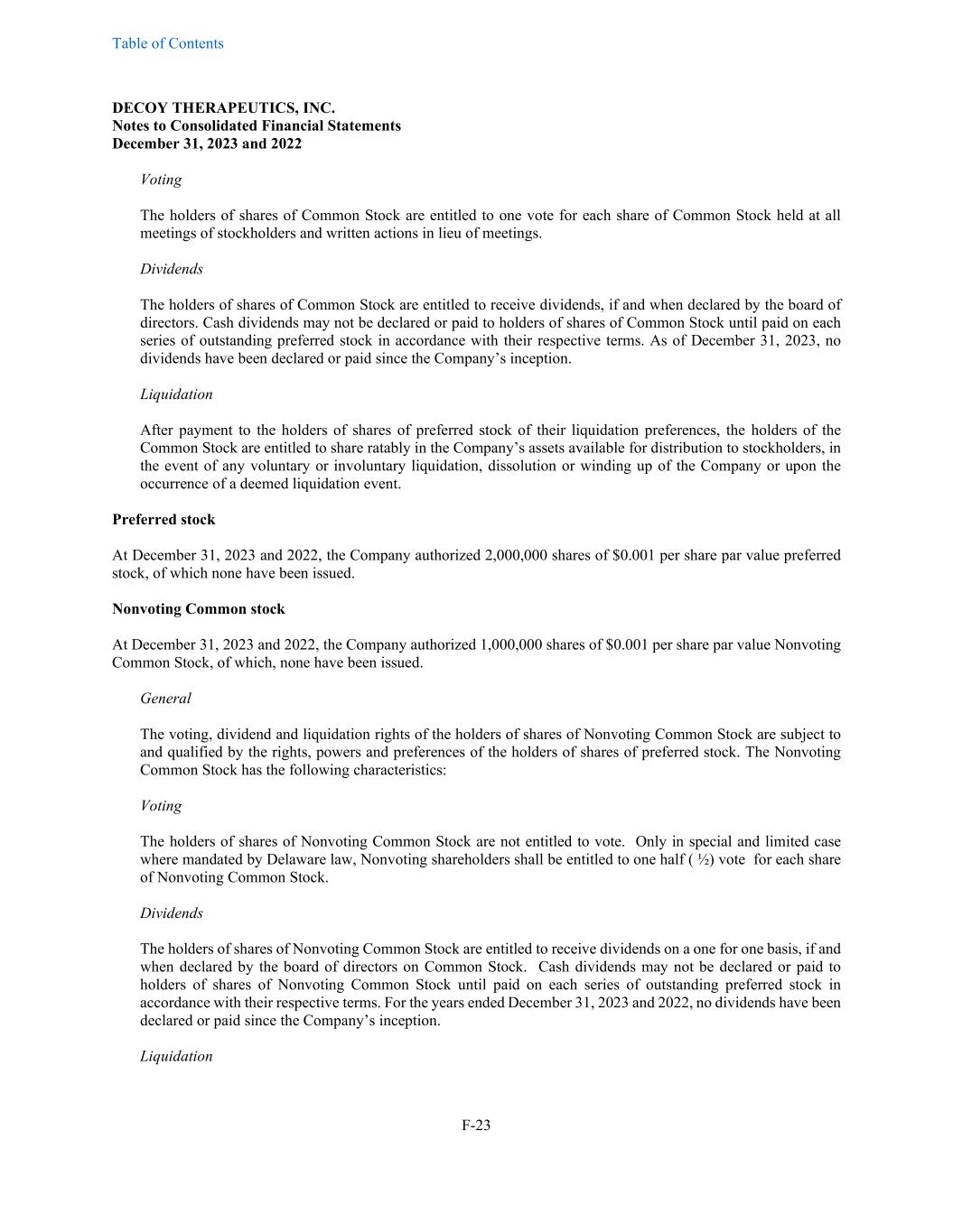 Table of Contents DECOY THERAPEUTICS, INC. Notes to Consolidated Financial Statements December 31, 2023 and 2022 F-23 Voting The holders of shares of Common Stock are entitled to one vote for each share of Common Stock held at all meetings of stockholders and written actions in lieu of meetings. Dividends The holders of shares of Common Stock are entitled to receive dividends, if and when declared by the board of directors. Cash dividends may not be declared or paid to holders of shares of Common Stock until paid on each series of outstanding preferred stock in accordance with their respective terms. As of December 31, 2023, no dividends have been declared or paid since the Company’s inception. Liquidation After payment to the holders of shares of preferred stock of their liquidation preferences, the holders of the Common Stock are entitled to share ratably in the Company’s assets available for distribution to stockholders, in the event of any voluntary or involuntary liquidation, dissolution or winding up of the Company or upon the occurrence of a deemed liquidation event. Preferred stock At December 31, 2023 and 2022, the Company authorized 2,000,000 shares of $0.001 per share par value preferred stock, of which none have been issued. Nonvoting Common stock At December 31, 2023 and 2022, the Company authorized 1,000,000 shares of $0.001 per share par value Nonvoting Common Stock, of which, none have been issued. General The voting, dividend and liquidation rights of the holders of shares of Nonvoting Common Stock are subject to and qualified by the rights, powers and preferences of the holders of shares of preferred stock. The Nonvoting Common Stock has the following characteristics: Voting The holders of shares of Nonvoting Common Stock are not entitled to vote. Only in special and limited case where mandated by Delaware law, Nonvoting shareholders shall be entitled to one half ( ½) vote for each share of Nonvoting Common Stock. Dividends The holders of shares of Nonvoting Common Stock are entitled to receive dividends on a one for one basis, if and when declared by the board of directors on Common Stock. Cash dividends may not be declared or paid to holders of shares of Nonvoting Common Stock until paid on each series of outstanding preferred stock in accordance with their respective terms. For the years ended December 31, 2023 and 2022, no dividends have been declared or paid since the Company’s inception. Liquidation