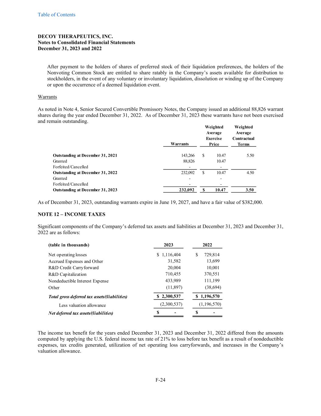 Table of Contents DECOY THERAPEUTICS, INC. Notes to Consolidated Financial Statements December 31, 2023 and 2022 F-24 After payment to the holders of shares of preferred stock of their liquidation preferences, the holders of the Nonvoting Common Stock are entitled to share ratably in the Company’s assets available for distribution to stockholders, in the event of any voluntary or involuntary liquidation, dissolution or winding up of the Company or upon the occurrence of a deemed liquidation event. Warrants As noted in Note 4, Senior Secured Convertible Promissory Notes, the Company issued an additional 88,826 warrant shares during the year ended December 31, 2022. As of December 31, 2023 these warrants have not been exercised and remain outstanding. Warrants Weighted Average Exercise Price Weighted Average Contractual Terms Outstanding at December 31, 2021 143,266 10.47$ 5.50 Granted 88,826 10.47 Forfeited/Cancelled - - Outstanding at December 31, 2022 232,092 10.47$ 4.50 Granted - - Forfeited/Cancelled - - Outstanding at December 31, 2023 232,092 10.47$ 3.50 As of December 31, 2023, outstanding warrants expire in June 19, 2027, and have a fair value of $382,000. NOTE 12 – INCOME TAXES Significant components of the Company’s deferred tax assets and liabilities at December 31, 2023 and December 31, 2022 are as follows: (table in thousands) 2023 2022 Net operating losses 1,116,404$ 729,814$ Accrued Expenses and Other 31,582 13,699 R&D Credit Carryforward 20,004 10,001 R&D Capitalization 710,455 370,551 Nondeductible Interest Expense 433,989 111,199 Other (11,897) (38,694) Total gross deferred tax assets/(liabilities) 2,300,537$ 1,196,570$ Less valuation allowance (2,300,537) (1,196,570) Net deferred tax assets/(liabilities) -$ -$ The income tax benefit for the years ended December 31, 2023 and December 31, 2022 differed from the amounts computed by applying the U.S. federal income tax rate of 21% to loss before tax benefit as a result of nondeductible expenses, tax credits generated, utilization of net operating loss carryforwards, and increases in the Company’s valuation allowance.