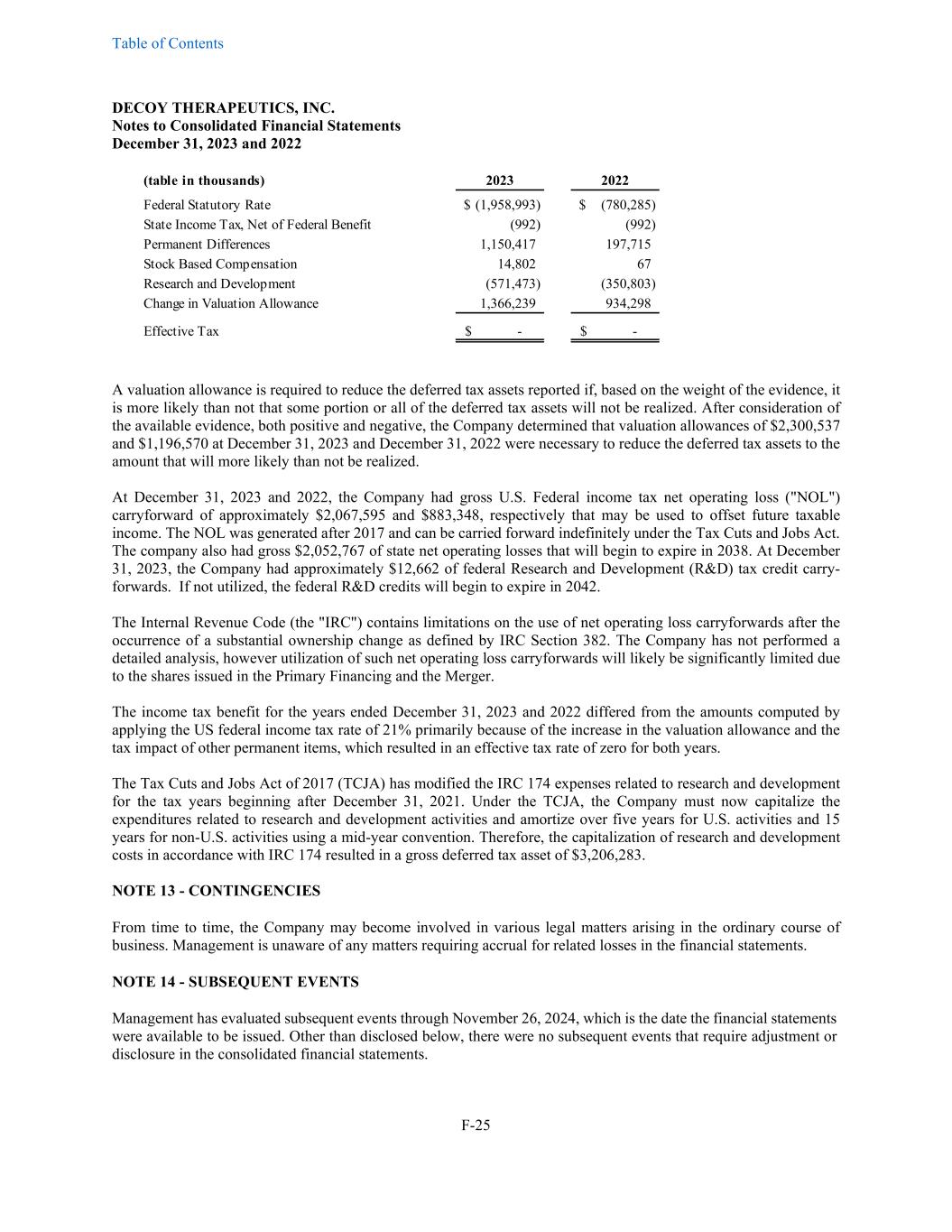 Table of Contents DECOY THERAPEUTICS, INC. Notes to Consolidated Financial Statements December 31, 2023 and 2022 F-25 (table in thousands) 2023 2022 Federal Statutory Rate (1,958,993)$ (780,285)$ State Income Tax, Net of Federal Benefit (992) (992) Permanent Differences 1,150,417 197,715 Stock Based Compensation 14,802 67 Research and Development (571,473) (350,803) Change in Valuation Allowance 1,366,239 934,298 Effective Tax -$ -$ A valuation allowance is required to reduce the deferred tax assets reported if, based on the weight of the evidence, it is more likely than not that some portion or all of the deferred tax assets will not be realized. After consideration of the available evidence, both positive and negative, the Company determined that valuation allowances of $2,300,537 and $1,196,570 at December 31, 2023 and December 31, 2022 were necessary to reduce the deferred tax assets to the amount that will more likely than not be realized. At December 31, 2023 and 2022, the Company had gross U.S. Federal income tax net operating loss ("NOL") carryforward of approximately $2,067,595 and $883,348, respectively that may be used to offset future taxable income. The NOL was generated after 2017 and can be carried forward indefinitely under the Tax Cuts and Jobs Act. The company also had gross $2,052,767 of state net operating losses that will begin to expire in 2038. At December 31, 2023, the Company had approximately $12,662 of federal Research and Development (R&D) tax credit carry- forwards. If not utilized, the federal R&D credits will begin to expire in 2042. The Internal Revenue Code (the "IRC") contains limitations on the use of net operating loss carryforwards after the occurrence of a substantial ownership change as defined by IRC Section 382. The Company has not performed a detailed analysis, however utilization of such net operating loss carryforwards will likely be significantly limited due to the shares issued in the Primary Financing and the Merger. The income tax benefit for the years ended December 31, 2023 and 2022 differed from the amounts computed by applying the US federal income tax rate of 21% primarily because of the increase in the valuation allowance and the tax impact of other permanent items, which resulted in an effective tax rate of zero for both years. The Tax Cuts and Jobs Act of 2017 (TCJA) has modified the IRC 174 expenses related to research and development for the tax years beginning after December 31, 2021. Under the TCJA, the Company must now capitalize the expenditures related to research and development activities and amortize over five years for U.S. activities and 15 years for non-U.S. activities using a mid-year convention. Therefore, the capitalization of research and development costs in accordance with IRC 174 resulted in a gross deferred tax asset of $3,206,283. NOTE 13 - CONTINGENCIES From time to time, the Company may become involved in various legal matters arising in the ordinary course of business. Management is unaware of any matters requiring accrual for related losses in the financial statements. NOTE 14 - SUBSEQUENT EVENTS Management has evaluated subsequent events through November 26, 2024, which is the date the financial statements were available to be issued. Other than disclosed below, there were no subsequent events that require adjustment or disclosure in the consolidated financial statements.