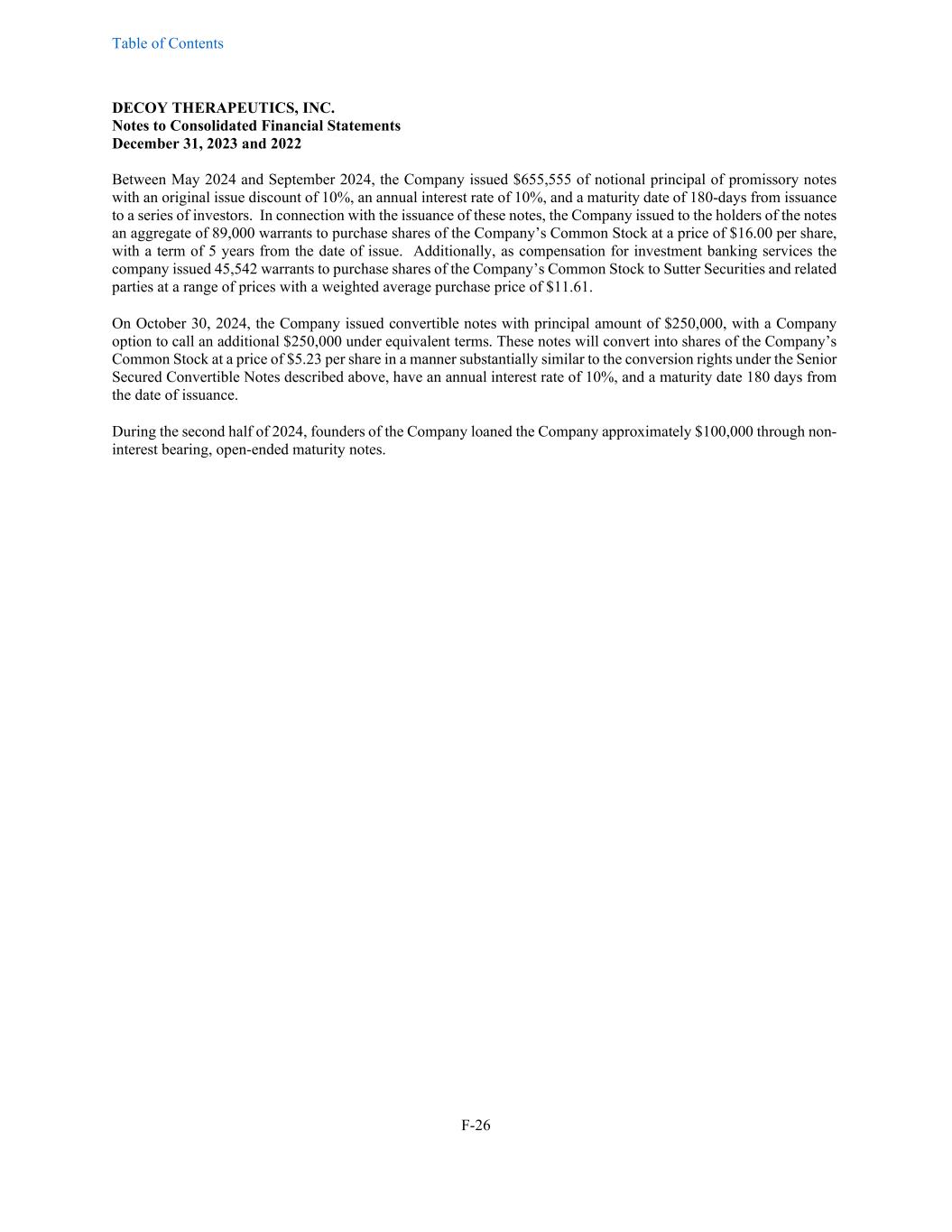 Table of Contents DECOY THERAPEUTICS, INC. Notes to Consolidated Financial Statements December 31, 2023 and 2022 F-26 Between May 2024 and September 2024, the Company issued $655,555 of notional principal of promissory notes with an original issue discount of 10%, an annual interest rate of 10%, and a maturity date of 180-days from issuance to a series of investors. In connection with the issuance of these notes, the Company issued to the holders of the notes an aggregate of 89,000 warrants to purchase shares of the Company’s Common Stock at a price of $16.00 per share, with a term of 5 years from the date of issue. Additionally, as compensation for investment banking services the company issued 45,542 warrants to purchase shares of the Company’s Common Stock to Sutter Securities and related parties at a range of prices with a weighted average purchase price of $11.61. On October 30, 2024, the Company issued convertible notes with principal amount of $250,000, with a Company option to call an additional $250,000 under equivalent terms. These notes will convert into shares of the Company’s Common Stock at a price of $5.23 per share in a manner substantially similar to the conversion rights under the Senior Secured Convertible Notes described above, have an annual interest rate of 10%, and a maturity date 180 days from the date of issuance. During the second half of 2024, founders of the Company loaned the Company approximately $100,000 through non- interest bearing, open-ended maturity notes.
