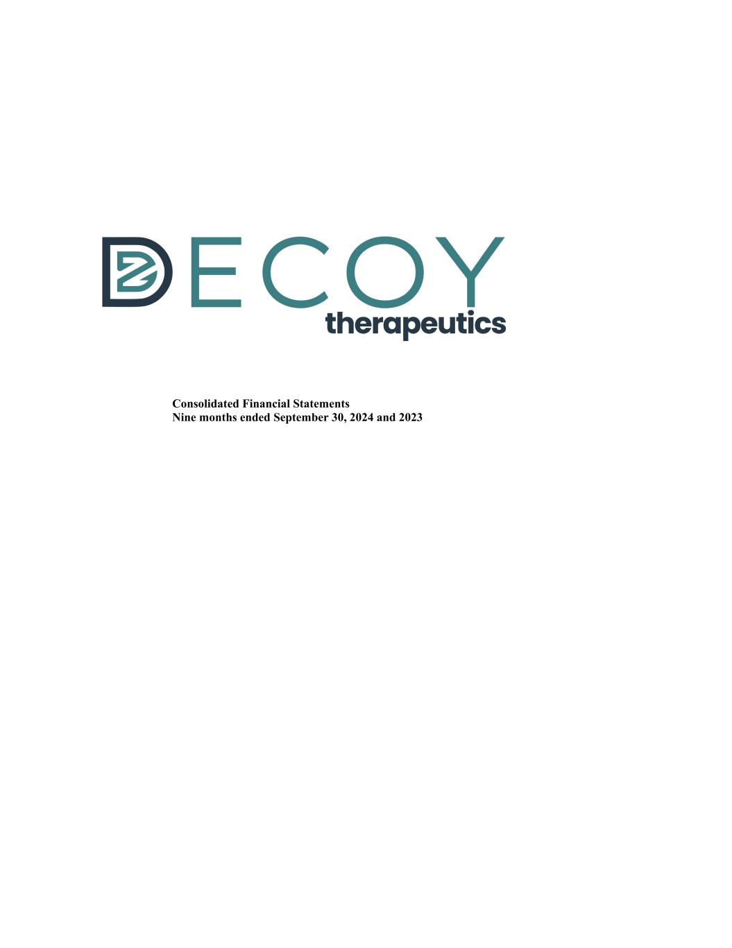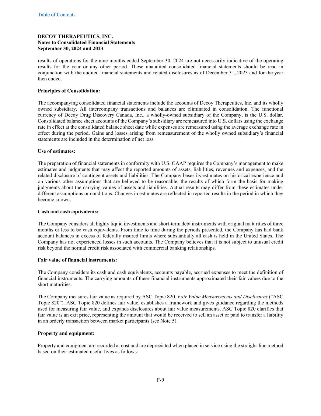 Table of Contents DECOY THERAPEUTICS, INC. Notes to Consolidated Financial Statements September 30, 2024 and 2023 F-9 results of operations for the nine months ended September 30, 2024 are not necessarily indicative of the operating results for the year or any other period. These unaudited consolidated financial statements should be read in conjunction with the audited financial statements and related disclosures as of December 31, 2023 and for the year then ended. Principles of Consolidation: The accompanying consolidated financial statements include the accounts of Decoy Therapeutics, Inc. and its wholly owned subsidiary. All intercompany transactions and balances are eliminated in consolidation. The functional currency of Decoy Drug Discovery Canada, Inc., a wholly-owned subsidiary of the Company, is the U.S. dollar. Consolidated balance sheet accounts of the Company’s subsidiary are remeasured into U.S. dollars using the exchange rate in effect at the consolidated balance sheet date while expenses are remeasured using the average exchange rate in effect during the period. Gains and losses arising from remeasurement of the wholly owned subsidiary’s financial statements are included in the determination of net loss. Use of estimates: The preparation of financial statements in conformity with U.S. GAAP requires the Company’s management to make estimates and judgments that may affect the reported amounts of assets, liabilities, revenues and expenses, and the related disclosure of contingent assets and liabilities. The Company bases its estimates on historical experience and on various other assumptions that are believed to be reasonable, the results of which form the basis for making judgments about the carrying values of assets and liabilities. Actual results may differ from these estimates under different assumptions or conditions. Changes in estimates are reflected in reported results in the period in which they become known. Cash and cash equivalents: The Company considers all highly liquid investments and short-term debt instruments with original maturities of three months or less to be cash equivalents. From time to time during the periods presented, the Company has had bank account balances in excess of federally insured limits where substantially all cash is held in the United States. The Company has not experienced losses in such accounts. The Company believes that it is not subject to unusual credit risk beyond the normal credit risk associated with commercial banking relationships. Fair value of financial instruments: The Company considers its cash and cash equivalents, accounts payable, accrued expenses to meet the definition of financial instruments. The carrying amounts of these financial instruments approximated their fair values due to the short maturities. The Company measures fair value as required by ASC Topic 820, Fair Value Measurements and Disclosures (“ASC Topic 820”). ASC Topic 820 defines fair value, establishes a framework and gives guidance regarding the methods used for measuring fair value, and expands disclosures about fair value measurements. ASC Topic 820 clarifies that fair value is an exit price, representing the amount that would be received to sell an asset or paid to transfer a liability in an orderly transaction between market participants (see Note 5). Property and equipment: Property and equipment are recorded at cost and are depreciated when placed in service using the straight-line method based on their estimated useful lives as follows: