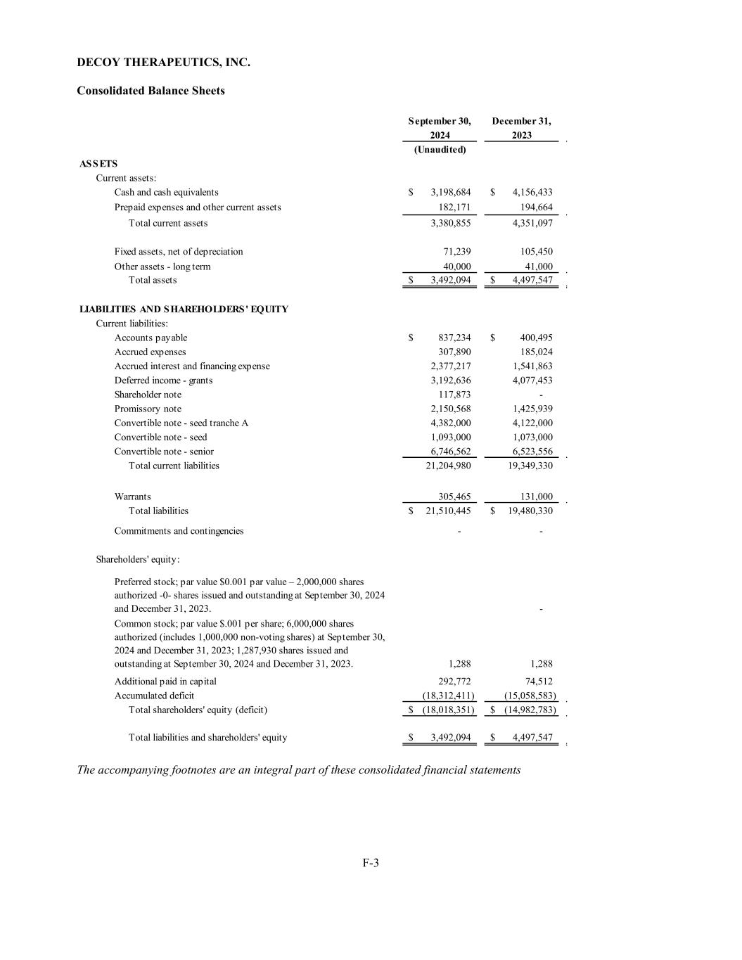 DECOY THERAPEUTICS, INC. F-3 Consolidated Balance Sheets September 30, December 31, 2024 2023 (Unaudited) ASSETS Current assets: Cash and cash equivalents 3,198,684$ 4,156,433$ Prepaid expenses and other current assets 182,171 194,664 Total current assets 3,380,855 4,351,097 Fixed assets, net of depreciation 71,239 105,450 Other assets - long term 40,000 41,000 Total assets 3,492,094$ 4,497,547$ LIABILITIES AND SHAREHOLDERS' EQUITY Current liabilities: Accounts payable 837,234$ 400,495$ Accrued expenses 307,890 185,024 Accrued interest and financing expense 2,377,217 1,541,863 Deferred income - grants 3,192,636 4,077,453 Shareholder note 117,873 - Promissory note 2,150,568 1,425,939 Convertible note - seed tranche A 4,382,000 4,122,000 Convertible note - seed 1,093,000 1,073,000 Convertible note - senior 6,746,562 6,523,556 Total current liabilities 21,204,980 19,349,330 Warrants 305,465 131,000 Total liabilities 21,510,445$ 19,480,330$ Commitments and contingencies - - Shareholders' equity: - 1,288 1,288 Additional paid in capital 292,772 74,512 Accumulated deficit (18,312,411) (15,058,583) Total shareholders' equity (deficit) (18,018,351)$ (14,982,783)$ Total liabilities and shareholders' equity 3,492,094$ 4,497,547$ Preferred stock; par value $0.001 par value – 2,000,000 shares authorized -0- shares issued and outstanding at September 30, 2024 and December 31, 2023. Common stock; par value $.001 per share; 6,000,000 shares authorized (includes 1,000,000 non-voting shares) at September 30, 2024 and December 31, 2023; 1,287,930 shares issued and outstanding at September 30, 2024 and December 31, 2023. The accompanying footnotes are an integral part of these consolidated financial statements
