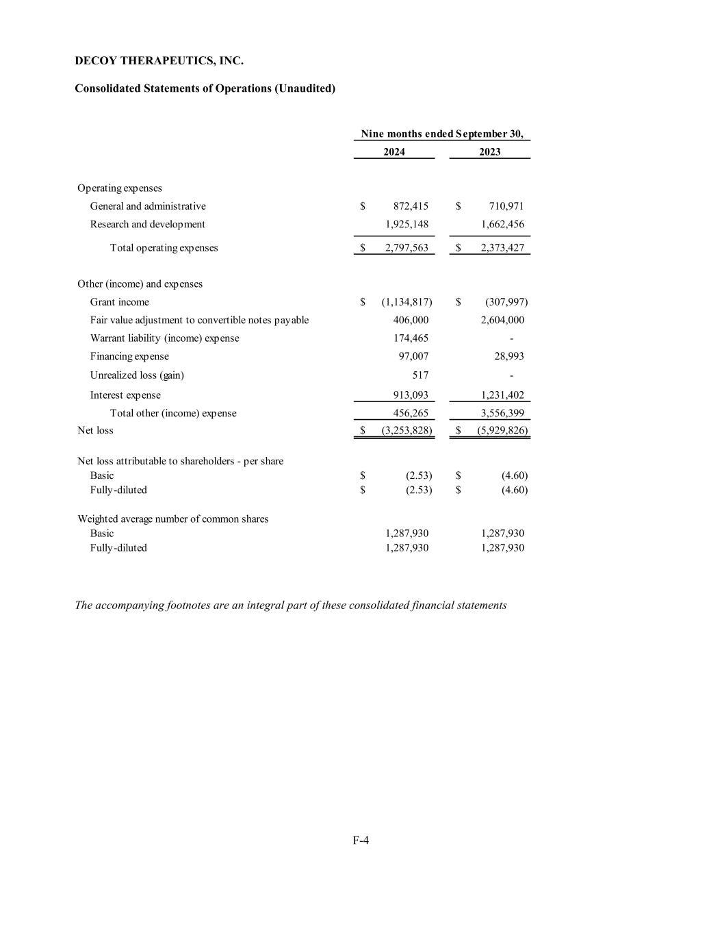 DECOY THERAPEUTICS, INC. F-4 Consolidated Statements of Operations (Unaudited) 2024 2023 Operating expenses General and administrative 872,415$ 710,971$ Research and development 1,925,148 1,662,456 Total operating expenses 2,797,563$ 2,373,427$ Other (income) and expenses Grant income (1,134,817)$ (307,997)$ Fair value adjustment to convertible notes payable 406,000 2,604,000 Warrant liability (income) expense 174,465 - Financing expense 97,007 28,993 Unrealized loss (gain) 517 - Interest expense 913,093 1,231,402 Total other (income) expense 456,265 3,556,399 Net loss (3,253,828)$ (5,929,826)$ Net loss attributable to shareholders - per share Basic (2.53)$ (4.60)$ Fully-diluted (2.53)$ (4.60)$ Weighted average number of common shares Basic 1,287,930 1,287,930 Fully-diluted 1,287,930 1,287,930 Nine months ended September 30, The accompanying footnotes are an integral part of these consolidated financial statements